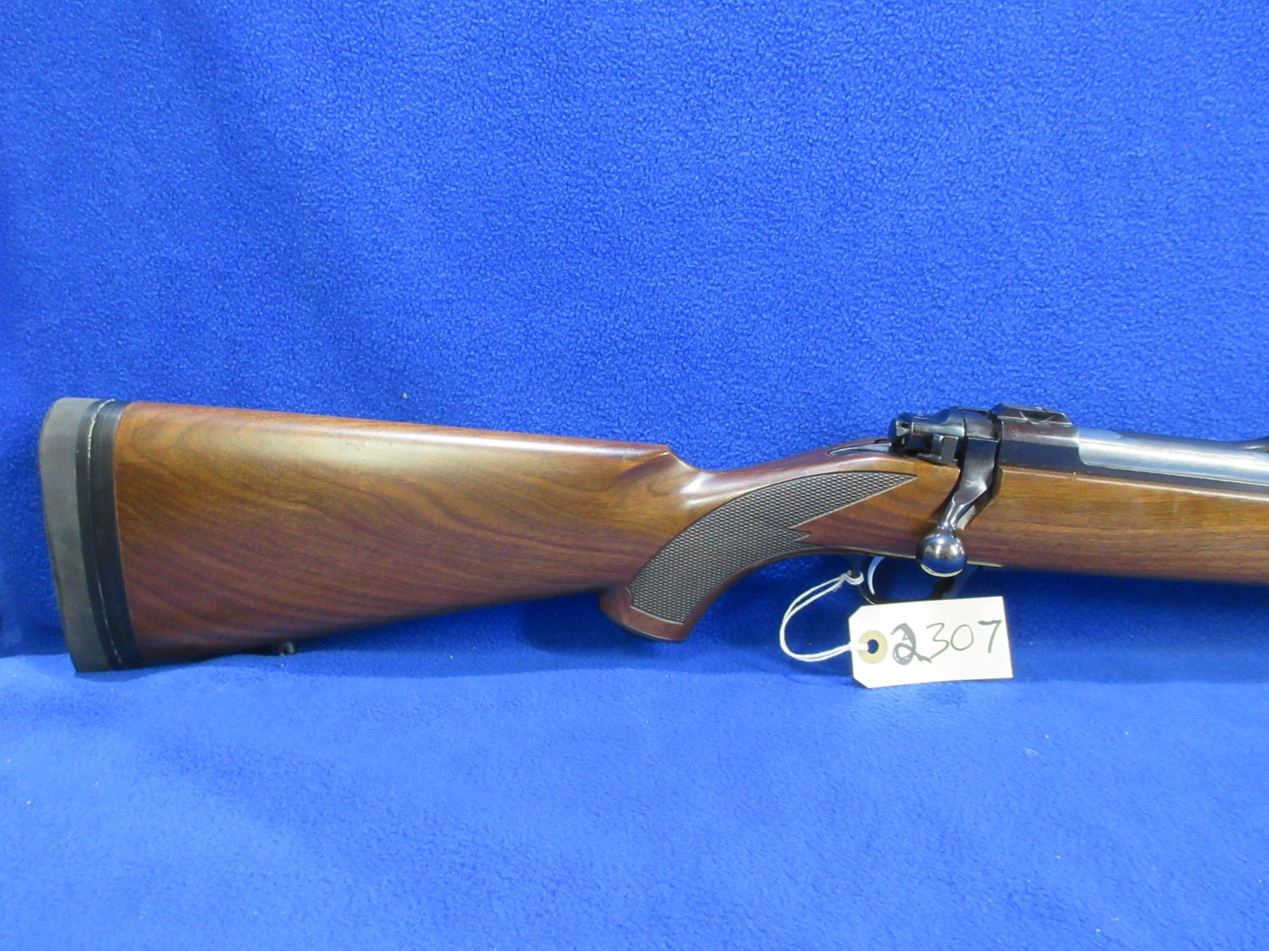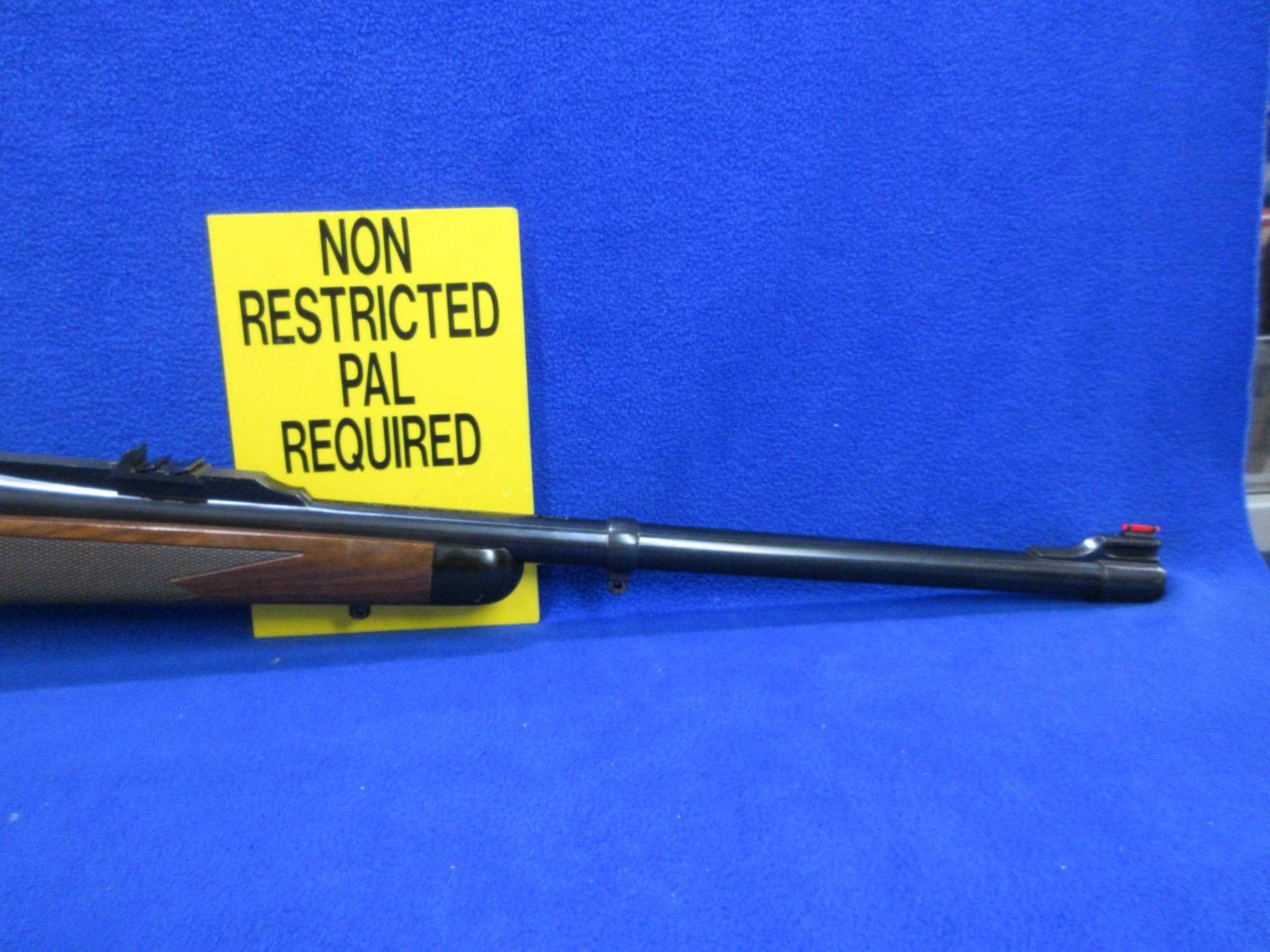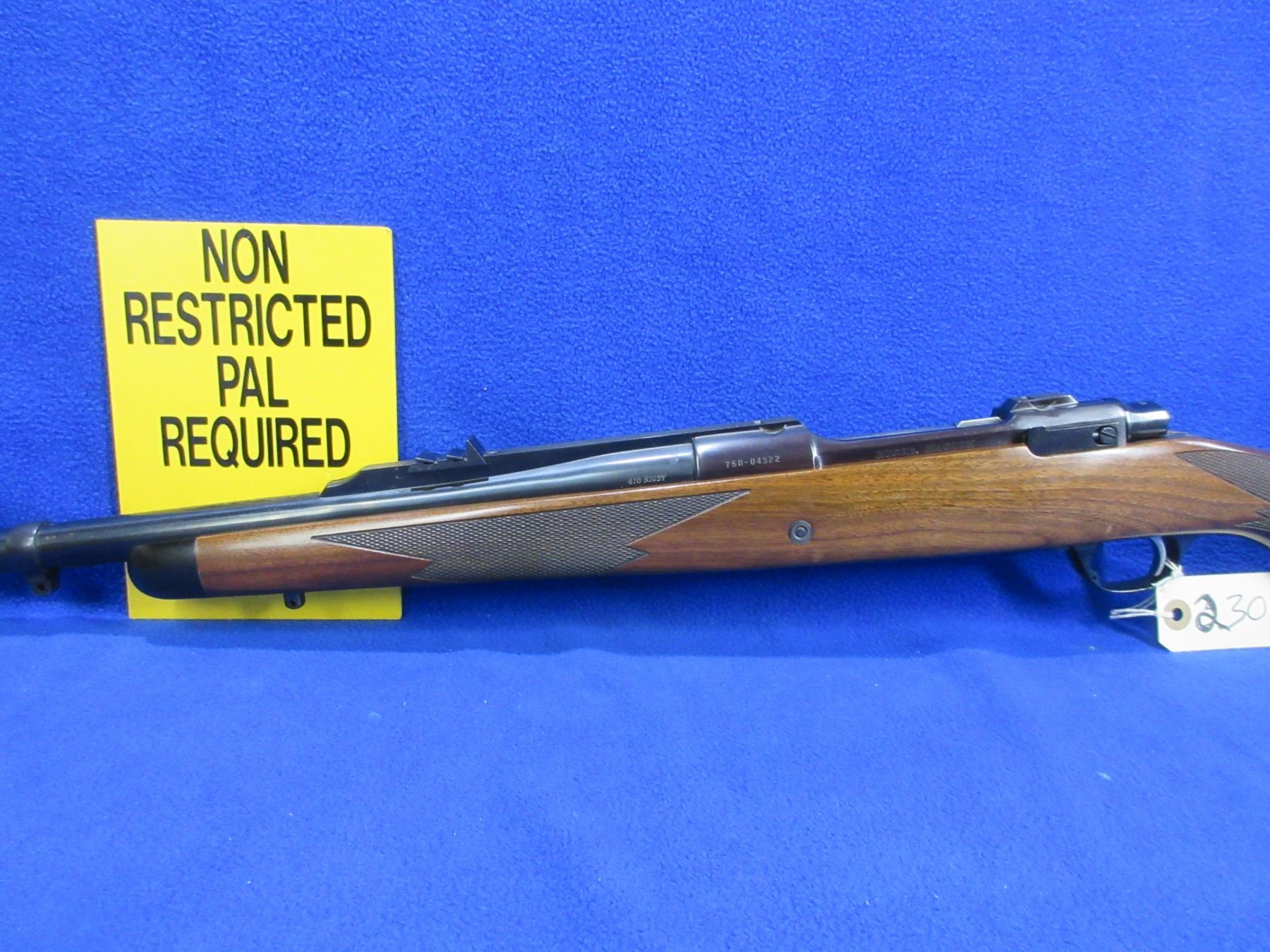 Non-Restricted - Ruger Model Magnum in 416 Rigby - This is a bolt action rifle with floor plate magazine, action appears to be in good to very good working order. Barrel is 23", rifling is very good, bluing is good to very good, has rear sight, fiber optic front sight and integral Ruger Mount, stock is good to very good with usage marks, length of pull is 14 1/2", rubber recoil pad good, comes with swivel studs and a snap cap. Ser # 750-04322