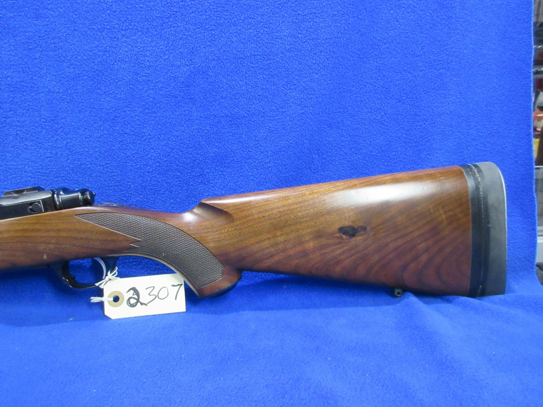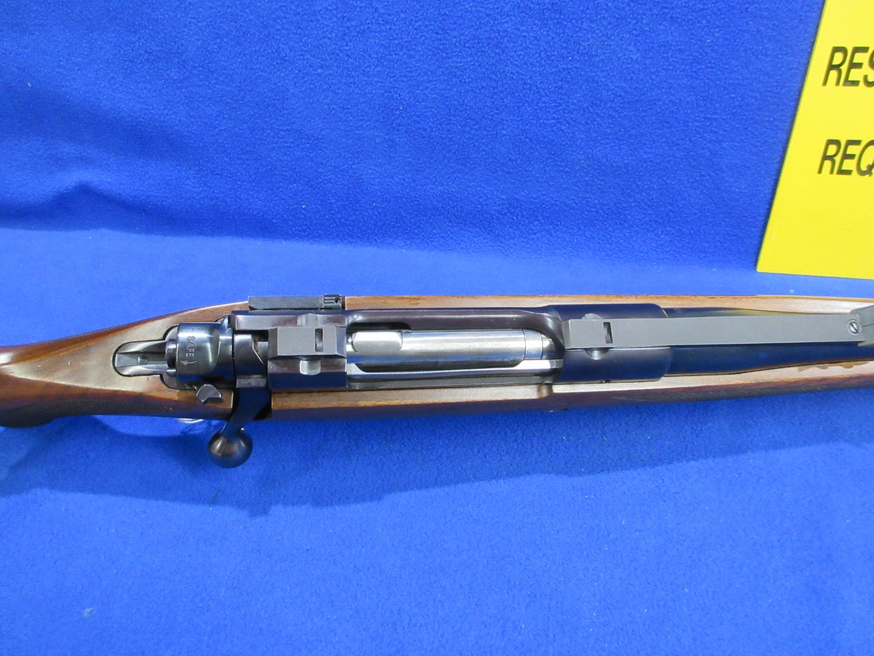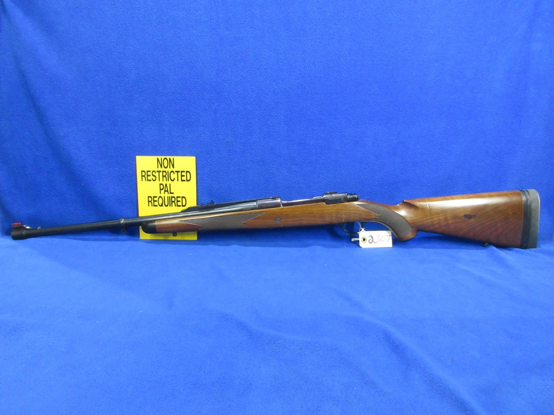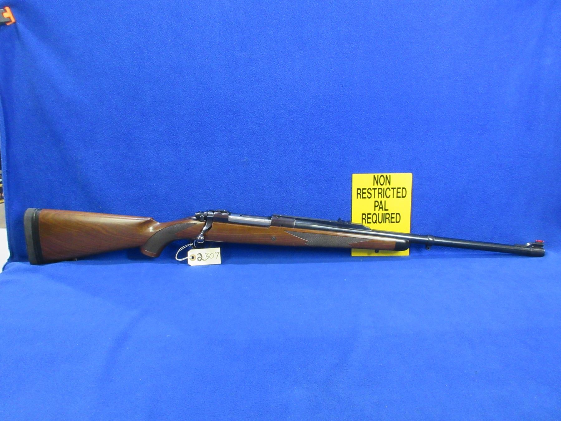 Non-Restricted - Ruger Model Magnum in 416 Rigby - This is a bolt action rifle with floor plate magazine, action appears to be in good to very good working order. Barrel is 23", rifling is very good, bluing is good to very good, has rear sight, fiber optic front sight and integral Ruger Mount, stock is good to very good with usage marks, length of pull is 14 1/2", rubber recoil pad good, comes with swivel studs and a snap cap. Ser # 750-04322