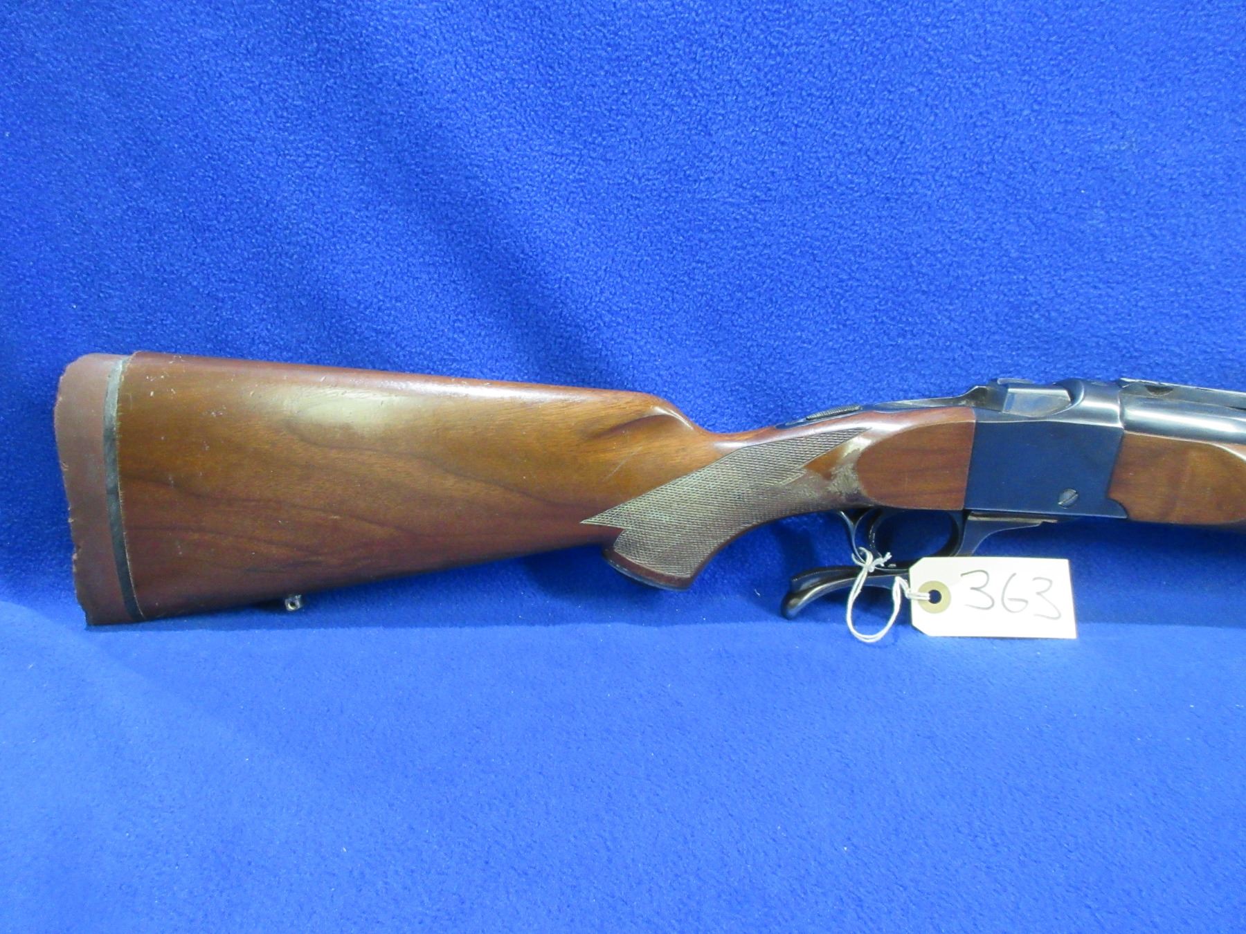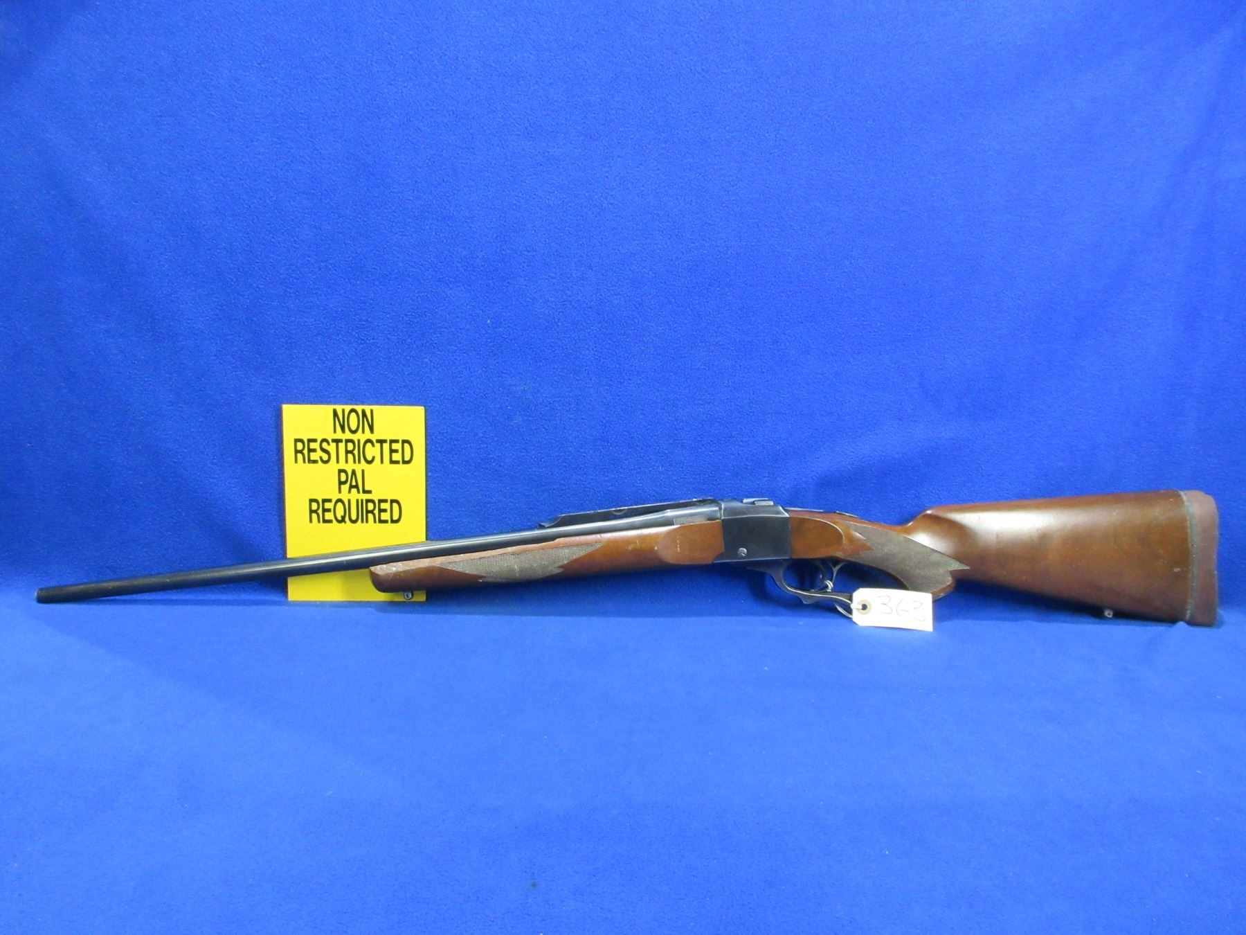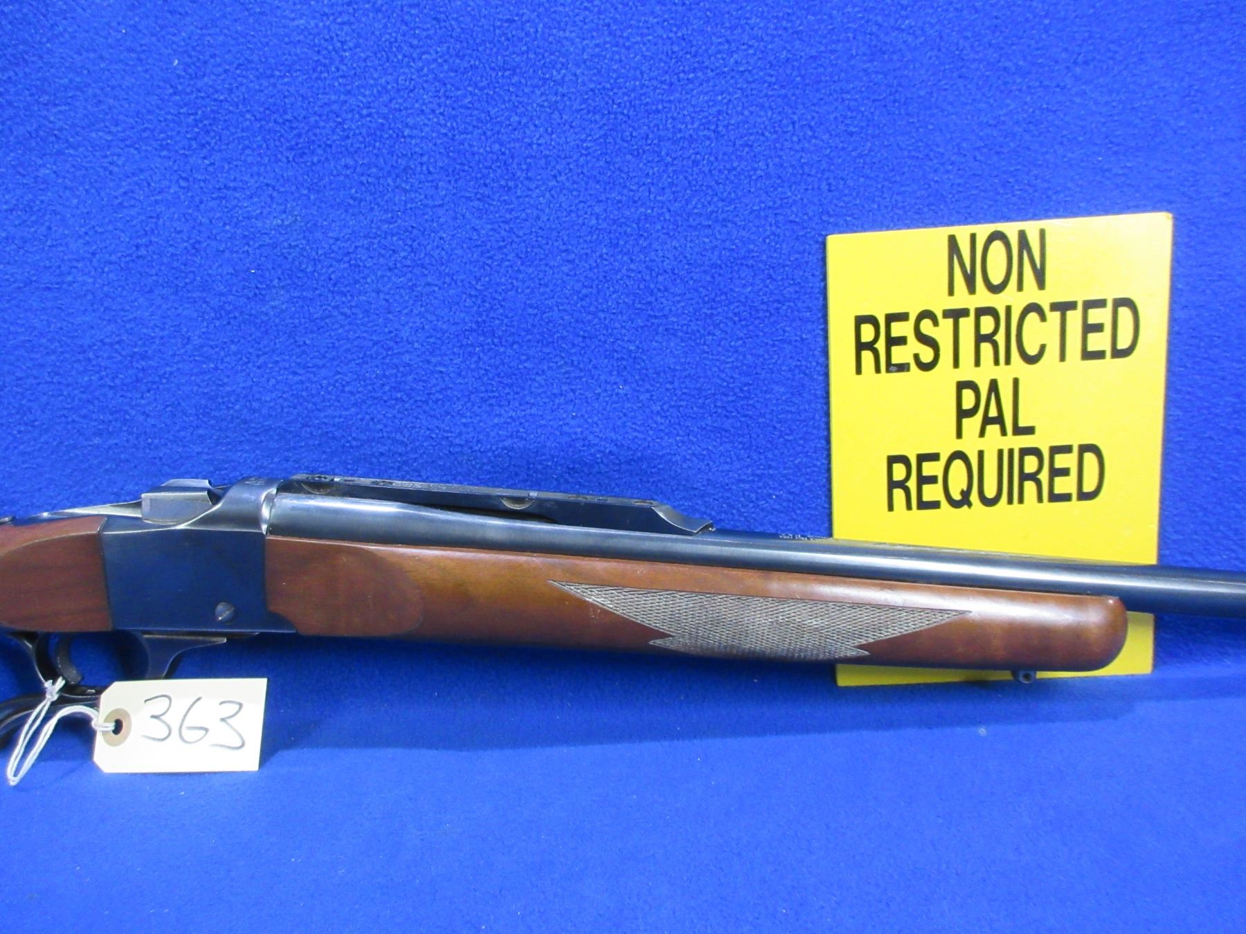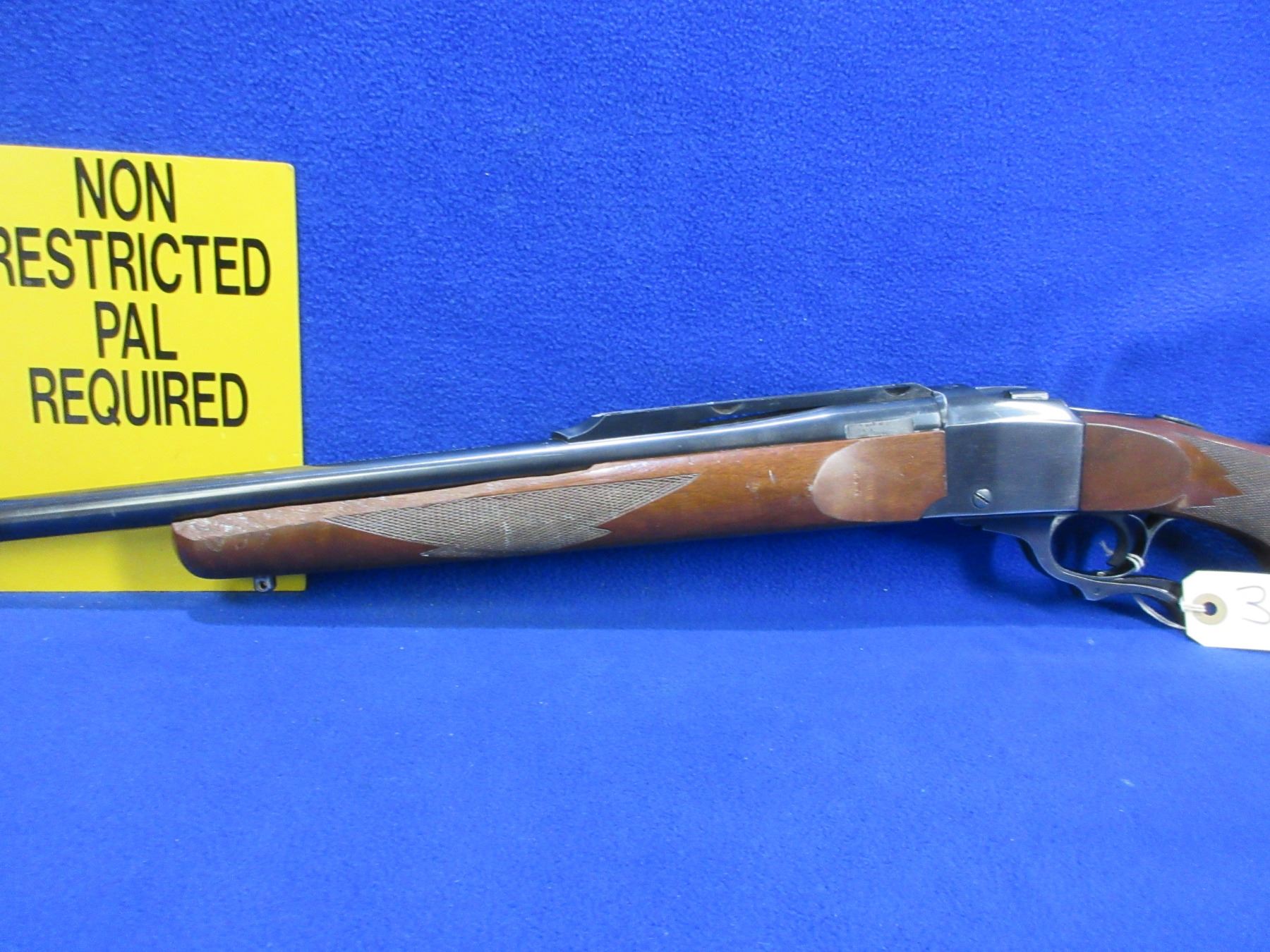 Non-Restricted - Ruger No. 1 in 338 Win. Mag - This is a single shot falling block rifle, action appears to be in good to very good working order. Rifle has no caliber markings on the barrel but consignor lists as 338 win. mag. Barrel is 26", rifling is fair to good, bluing is good with some wear spots, has no sights but has drilled and tapped, has integral rail, stock is good with usage marks, forearm has a large chip on the top left side, length of pull is 14 1/4", rubber recoil pad, comes with swivel studs. Ser. # 132-27518