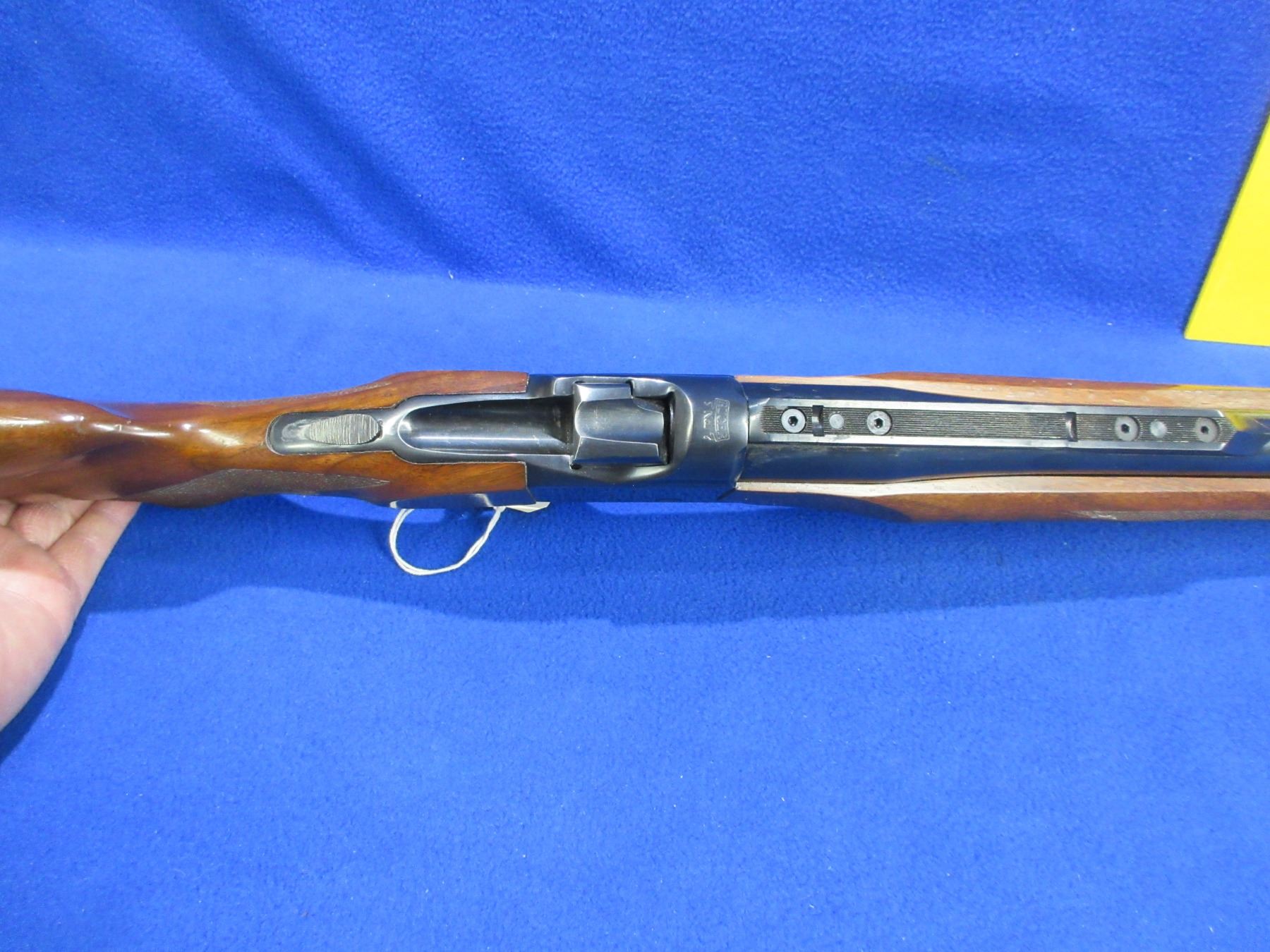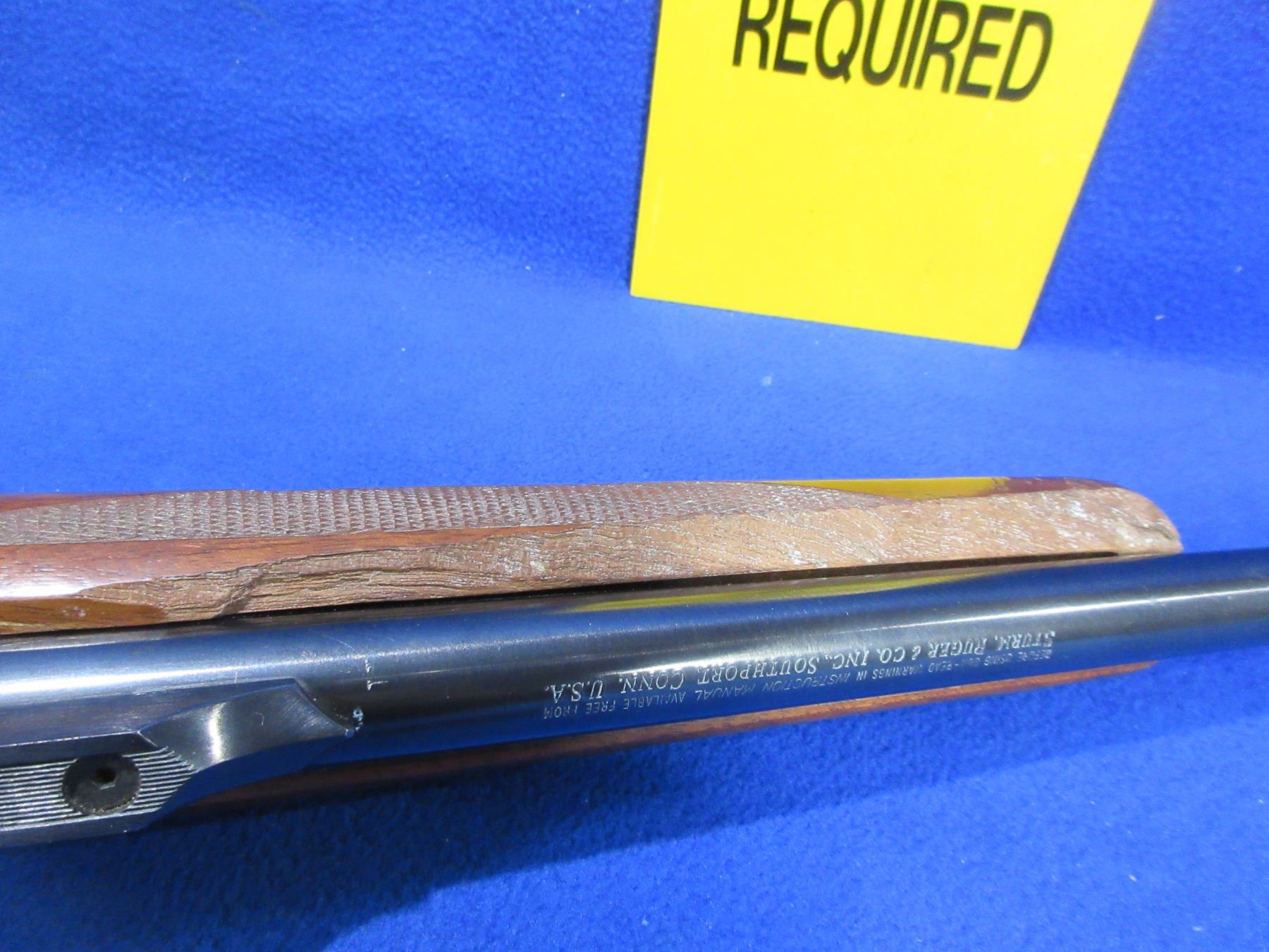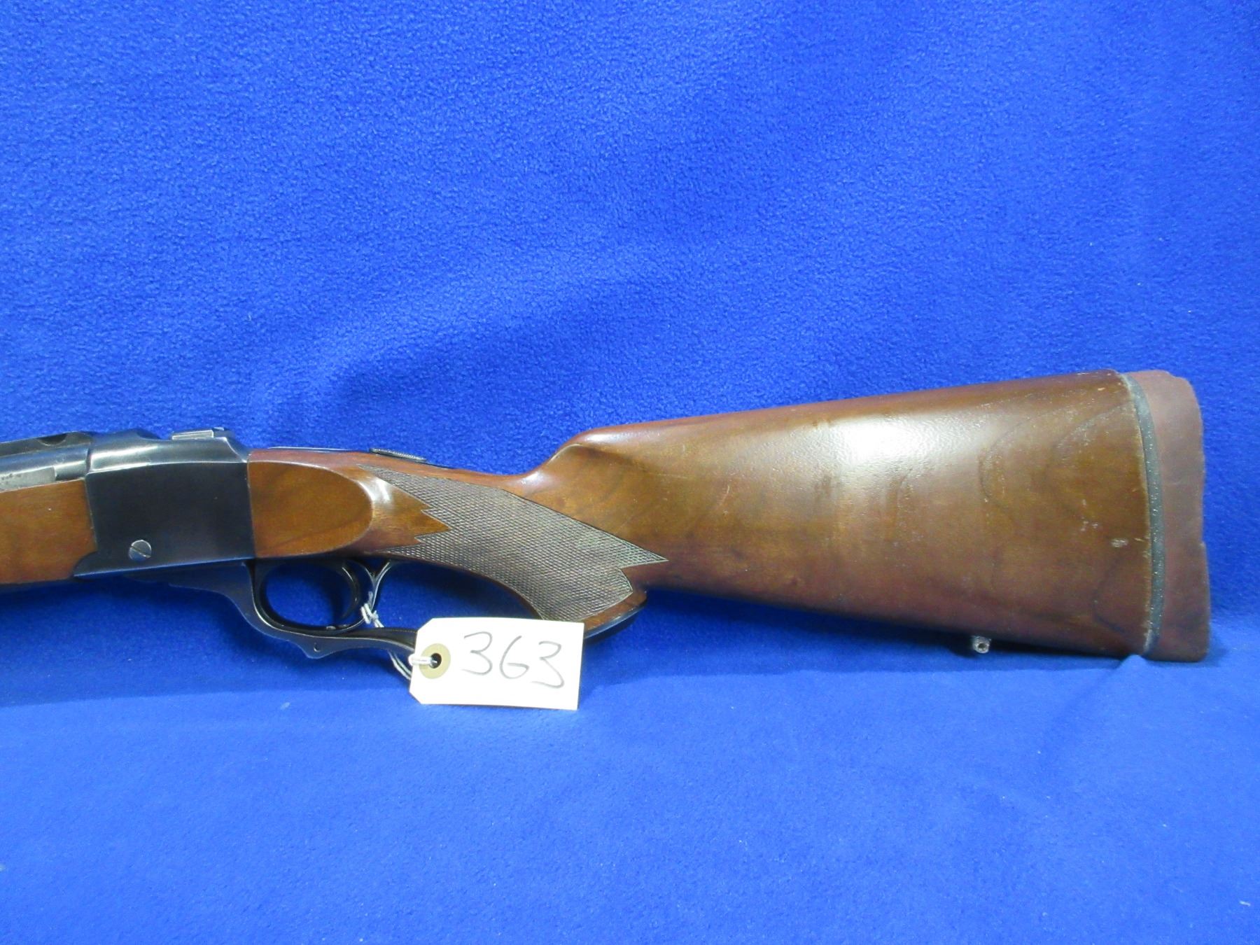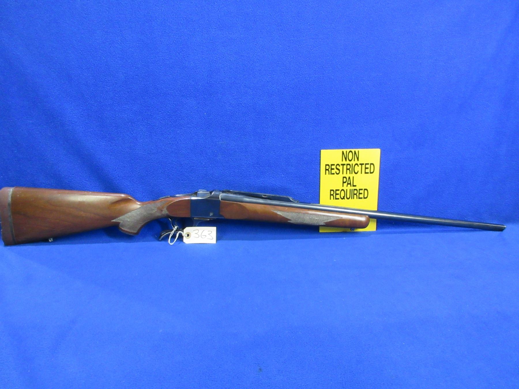 Non-Restricted - Ruger No. 1 in 338 Win. Mag - This is a single shot falling block rifle, action appears to be in good to very good working order. Rifle has no caliber markings on the barrel but consignor lists as 338 win. mag. Barrel is 26", rifling is fair to good, bluing is good with some wear spots, has no sights but has drilled and tapped, has integral rail, stock is good with usage marks, forearm has a large chip on the top left side, length of pull is 14 1/4", rubber recoil pad, comes with swivel studs. Ser. # 132-27518