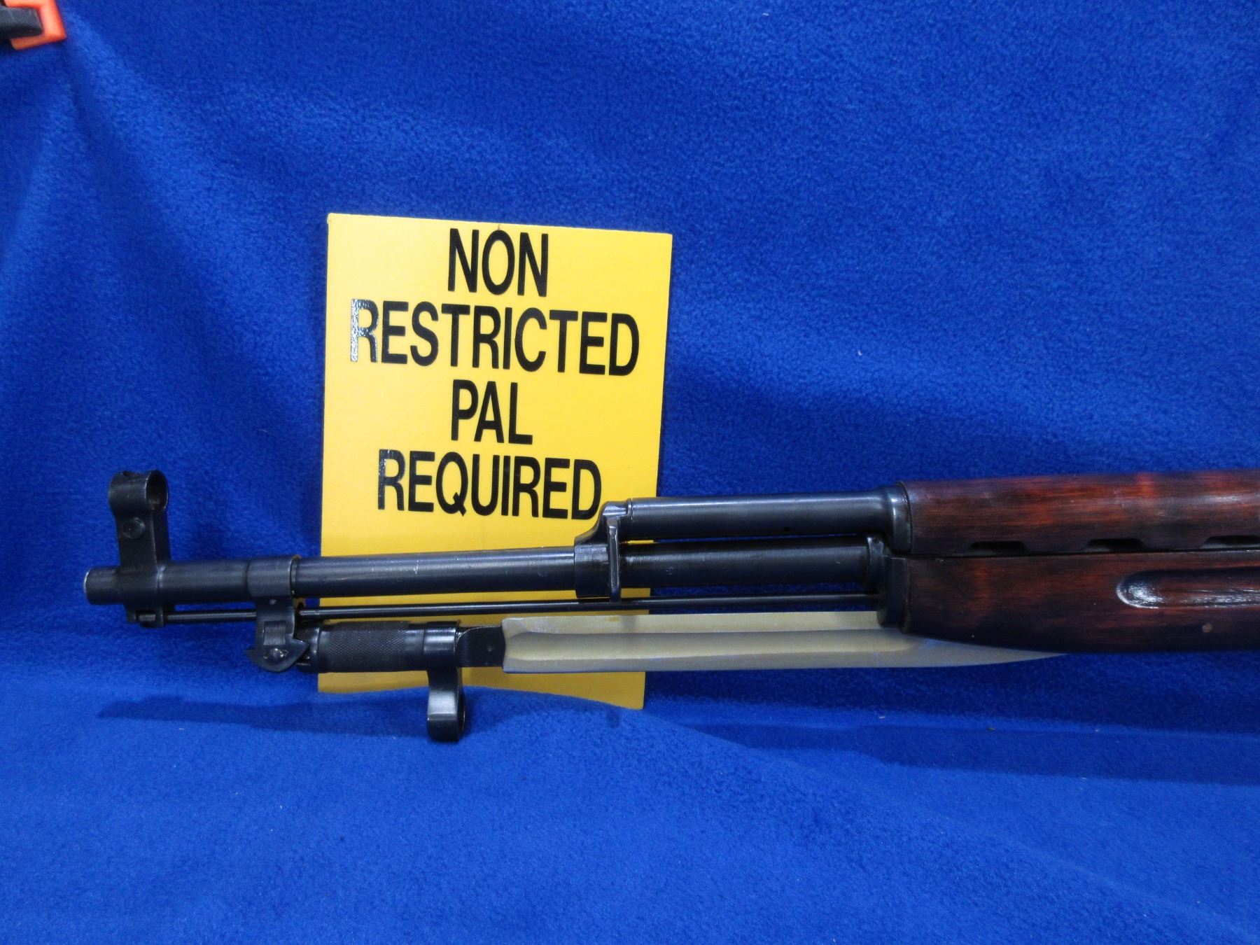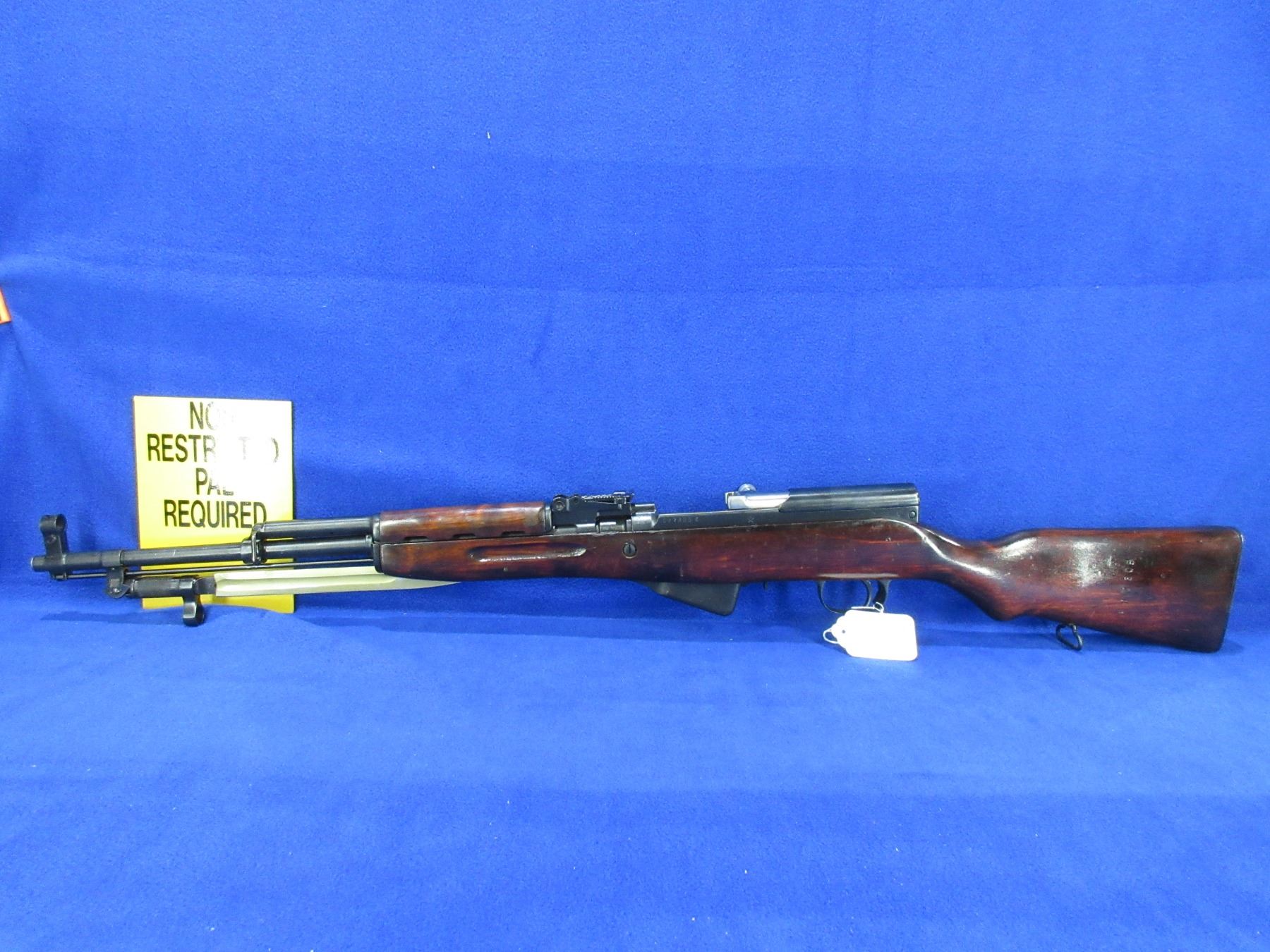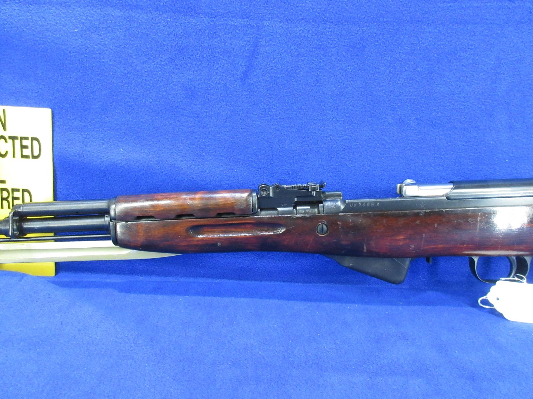 Non-Restricted - Russian SKS in 7.62X39 - This semi-auto rifle with attached magazine appears to be in good to very good working order. Barrel is 20", bluing is good to very good, rifling is good to very good, has both sights, stock good to very good with usual marks, butt plate good, appears to be numbers matching, has cleaning rod, missing cleaning kit in stock, has bayonet, Ser # 7306K