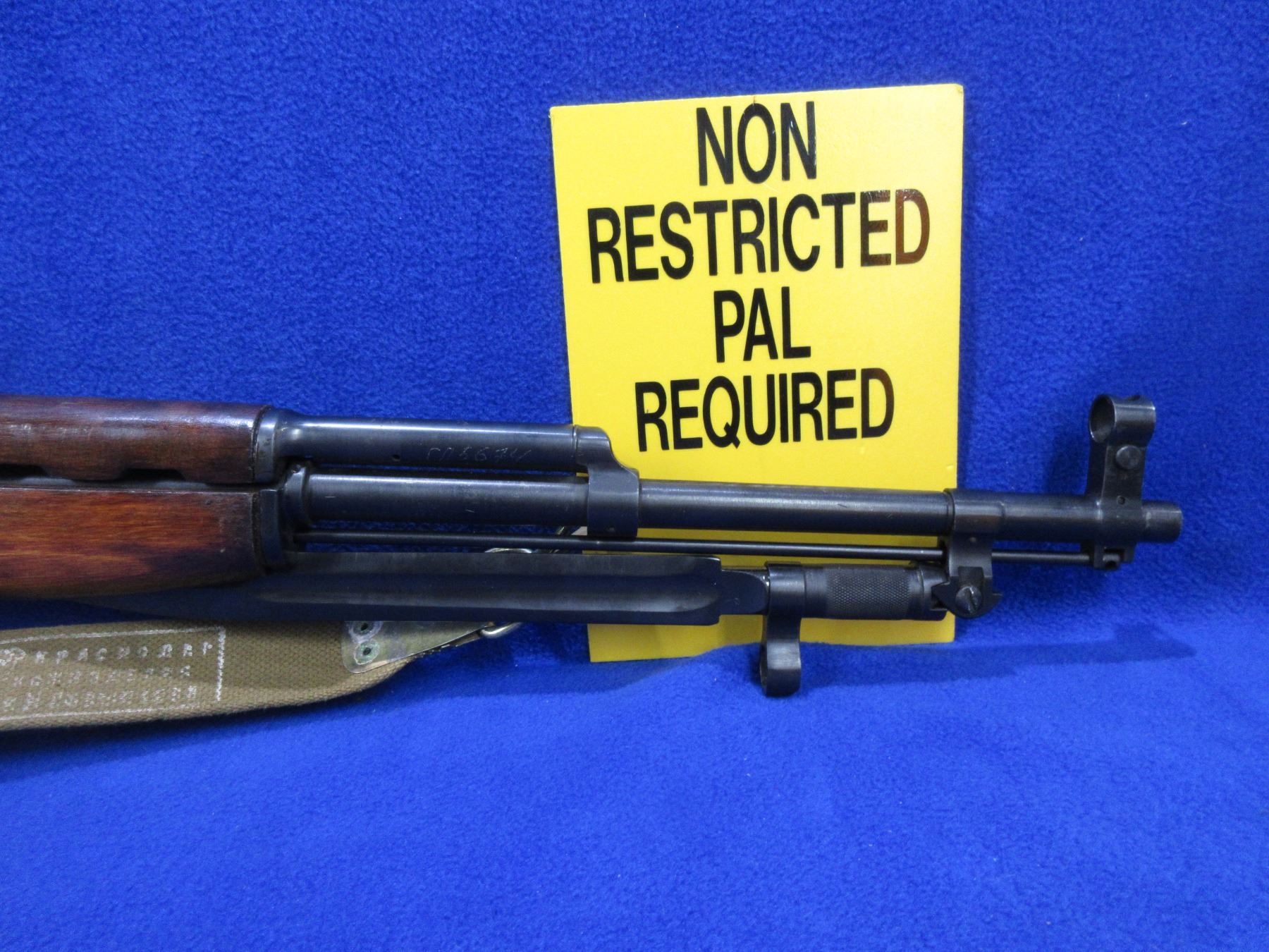 Non-Restricted - Russian SKS in 7.62X39 - This semi-auto rifle with floor plate magazine appears to be in good to very good working order. Barrel is 20 1/2", rifling is good to very good, bluing is good to very good, has both sights, stock is good to very good with a few usage marks, metal butt plate good, comes with an original style sling and cleaning kit in the butt. Ser # 5674