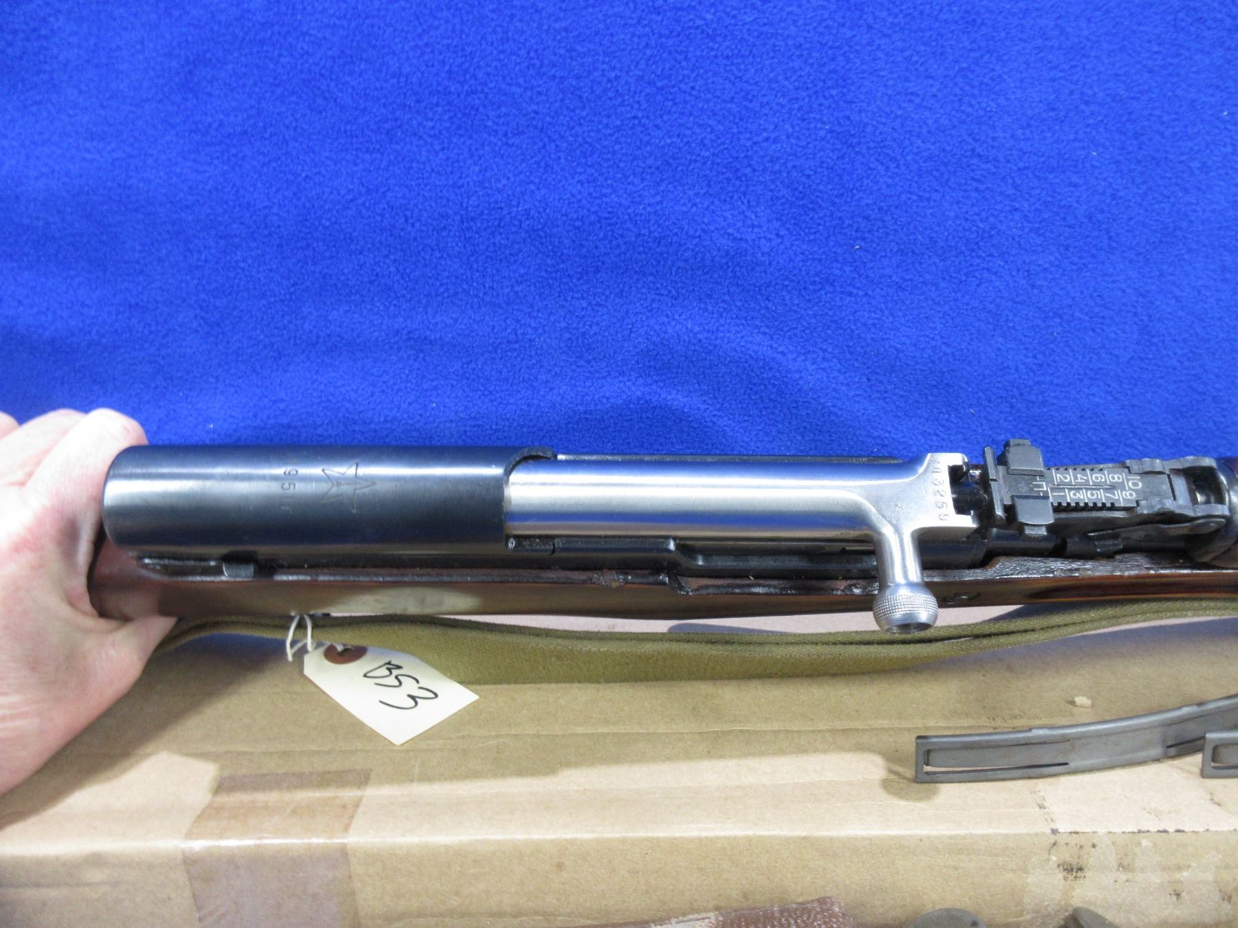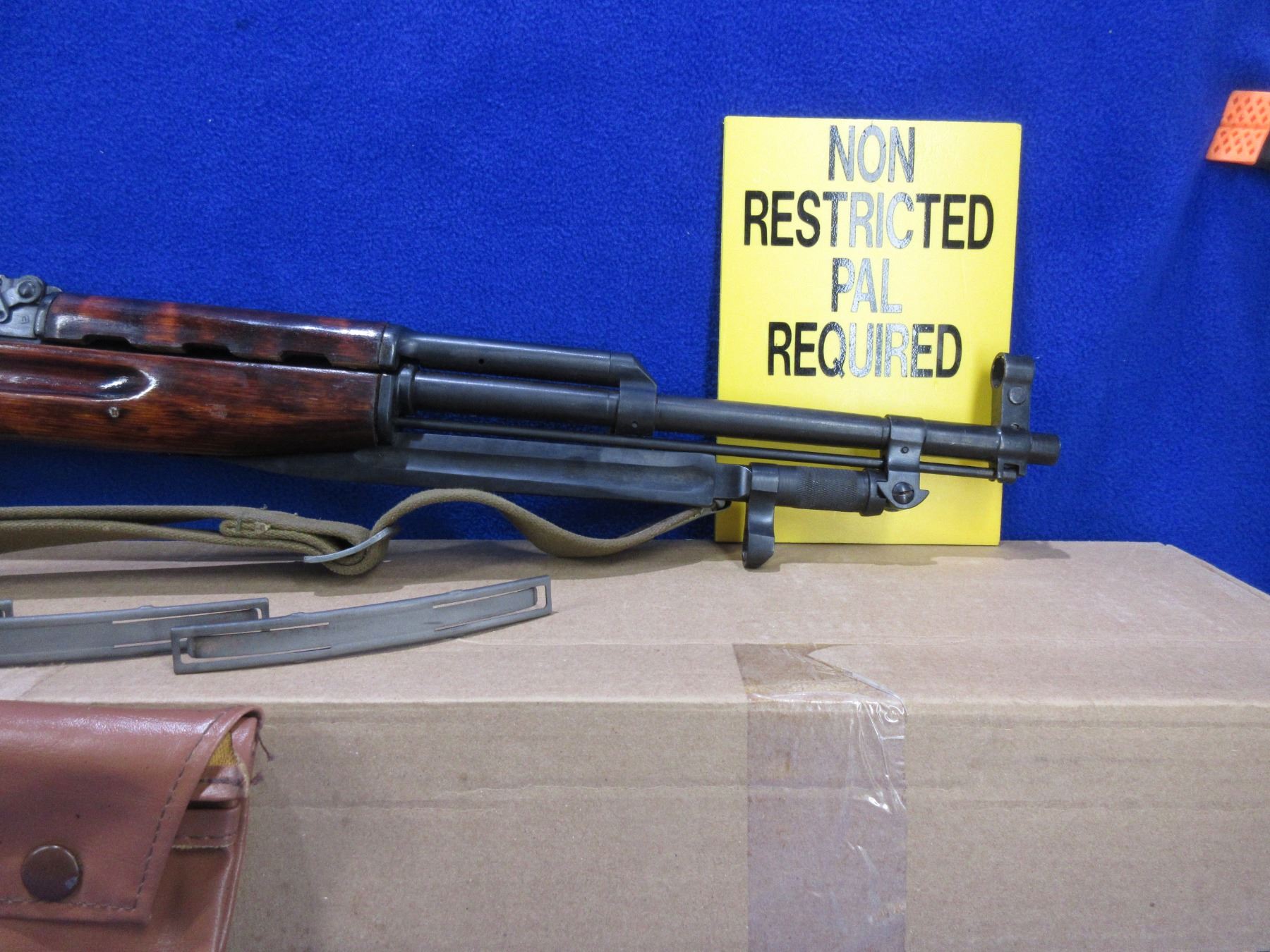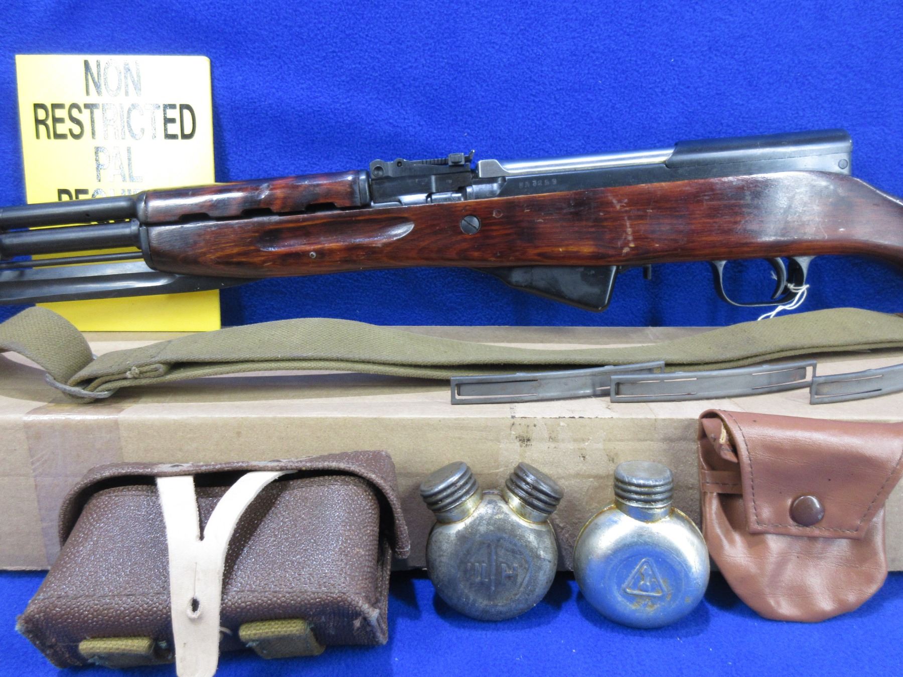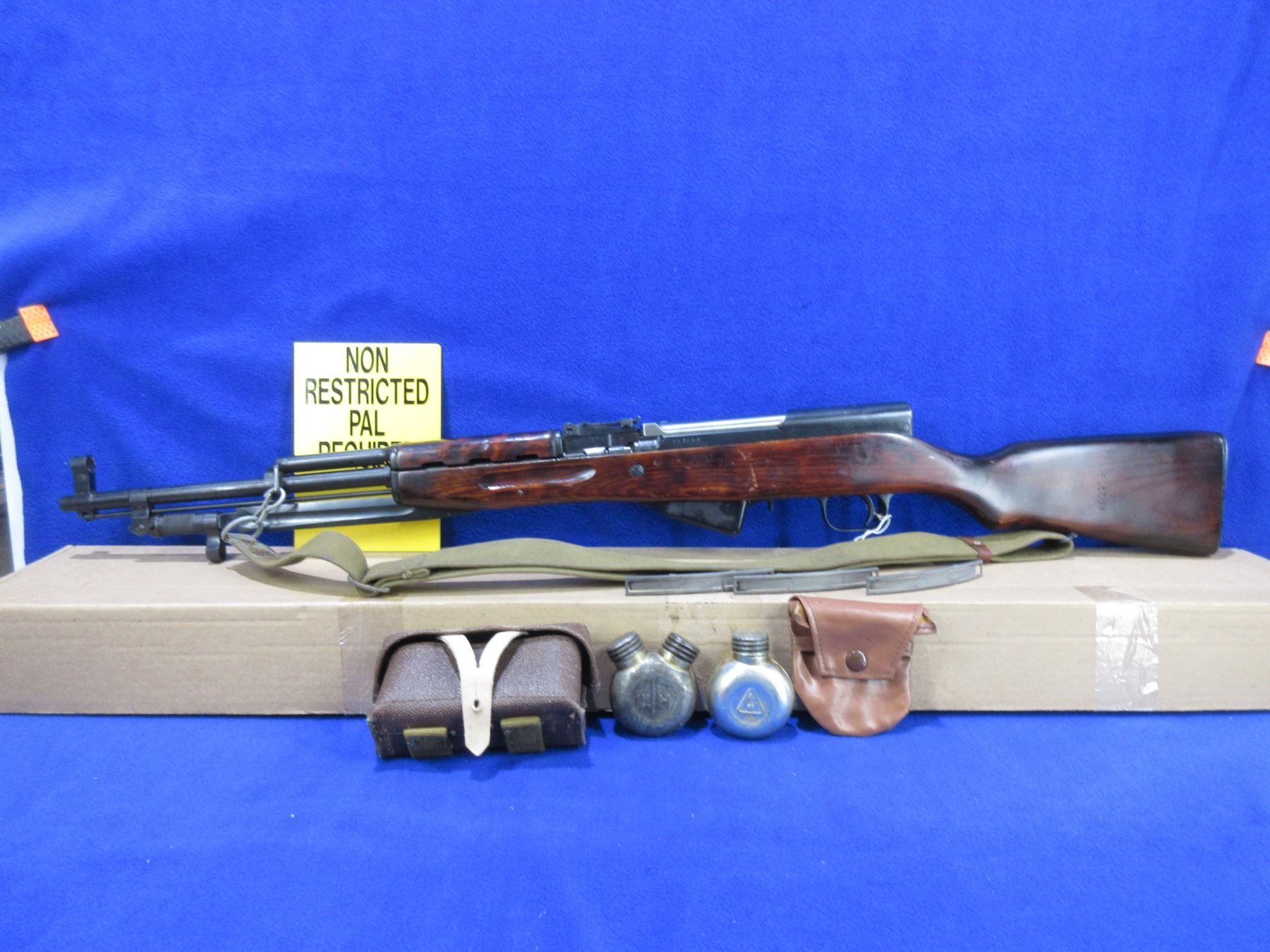 Non-Restricted - Russian SKS in 7.62X39 - This semi-auto rifle with floor plate magazine appears to be in good to very good working order. Barrel is 20 1/2", rifling is good to very good, bluing is good to very good, has both sights, stock is good to very good with usage marks, metal butt plate good, comes with bayonet, original style sling, 3 stripper clips, 2 oilers, ammo pouch, cleaning rod, cleaning kit in the butt and original shipping box. Ser # 3259