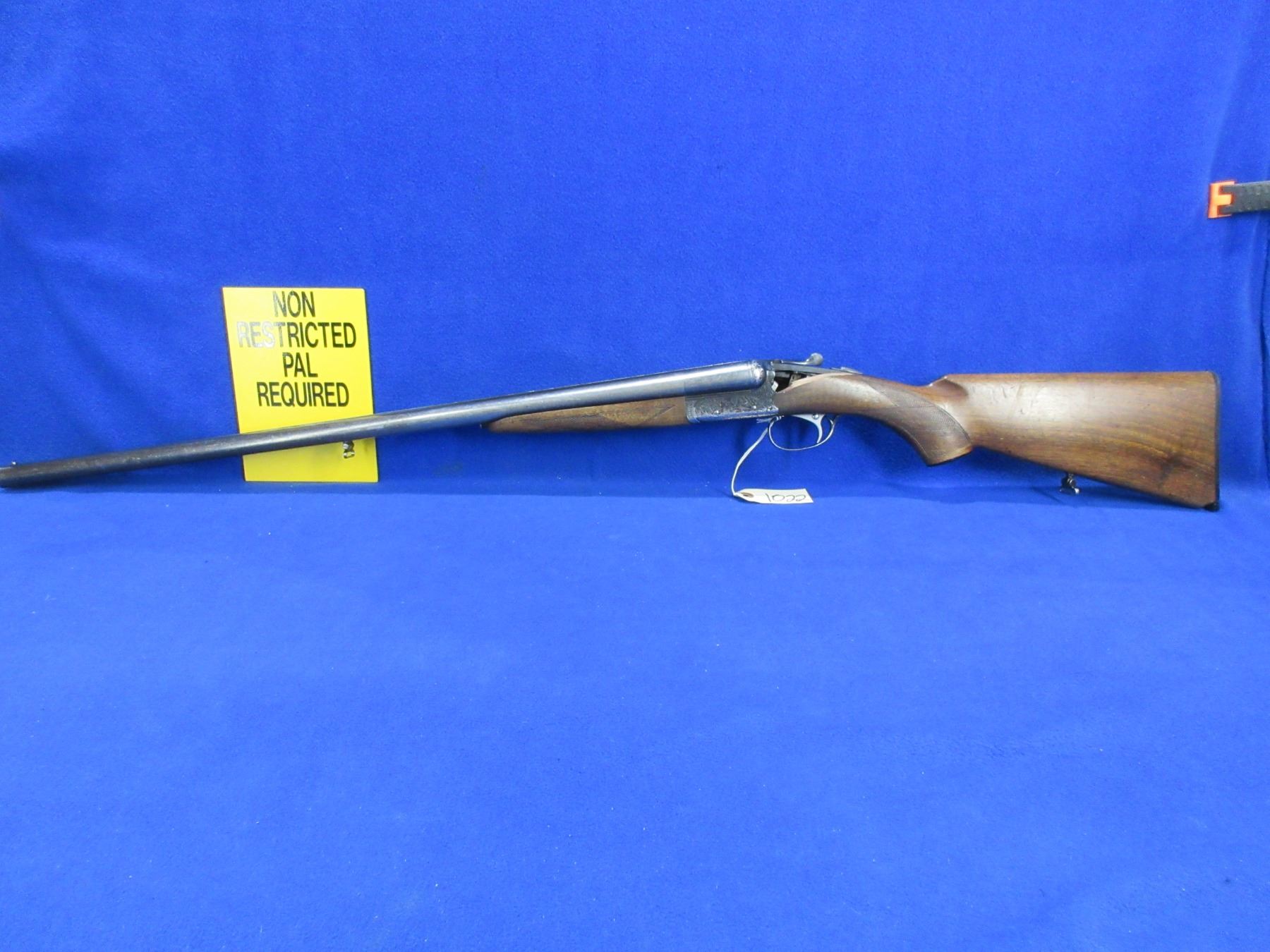 Non-Restricted - SKB Arms Model 100 in 12 Ga. 2 3/4" - This tip up SXS shotgun should not be fired as the stock is broken but appears to be in good working order. Solid rib barrels are 28", right barrel has a dent 9" from the muzzle, bores are fair to good, bluing is mostly gone, scratched and has some pitting, has bead front sight, stock has a large chip by the upper tang and a chip on the toe, forearm is good with usage marks, butt plate is chipped at the toe. Ser # S5136192