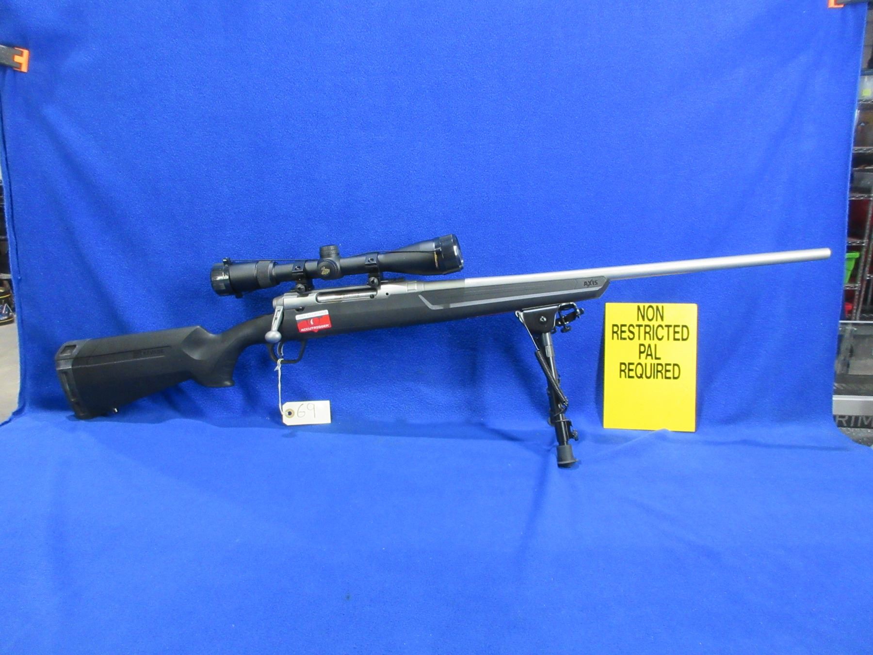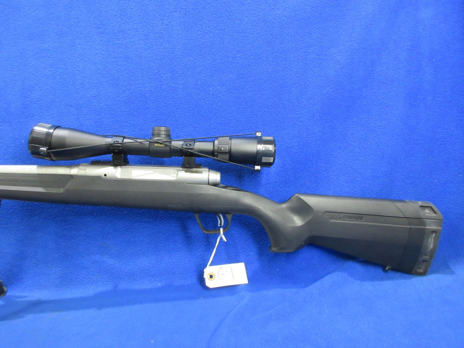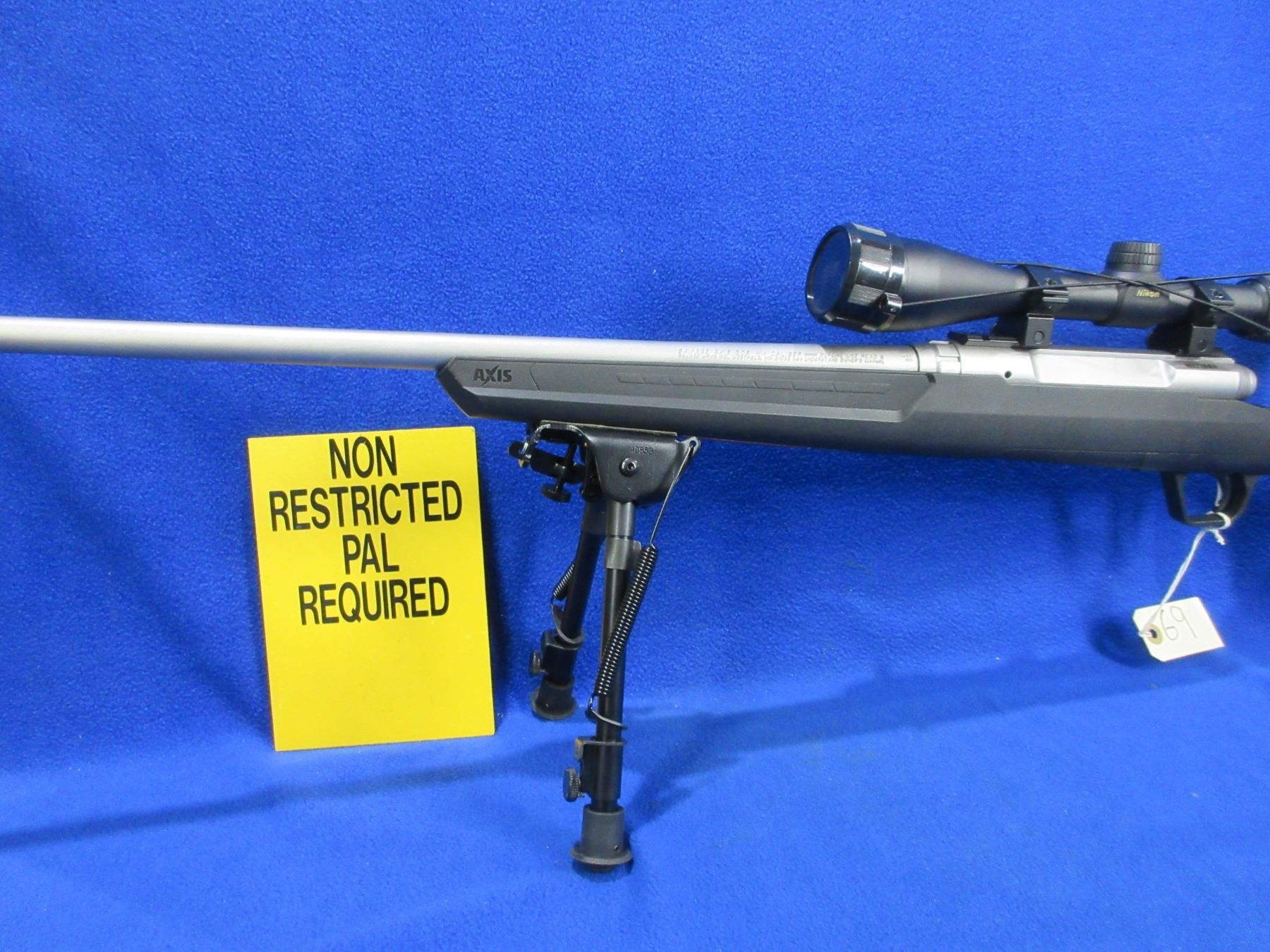 Non-Restricted - Savage Axis in 308 Win - This is a bolt action rifle with AccuTrigger and removable magazine, action appears to be in very good working order. Stainless Barrel is 22", rifling is very good, stainless finish is good to very good, has no sights but has Nikon Buckmasters 3-9x40 scope with lens covers - appears clear - duplex reticle, synthetic stock is good to very good, length of pull is 13 1/2", rubber recoil pad good, comes with scope paperwork, rear swivel stud and Champion (40853) 9" - 13" bipod. Ser # N272680