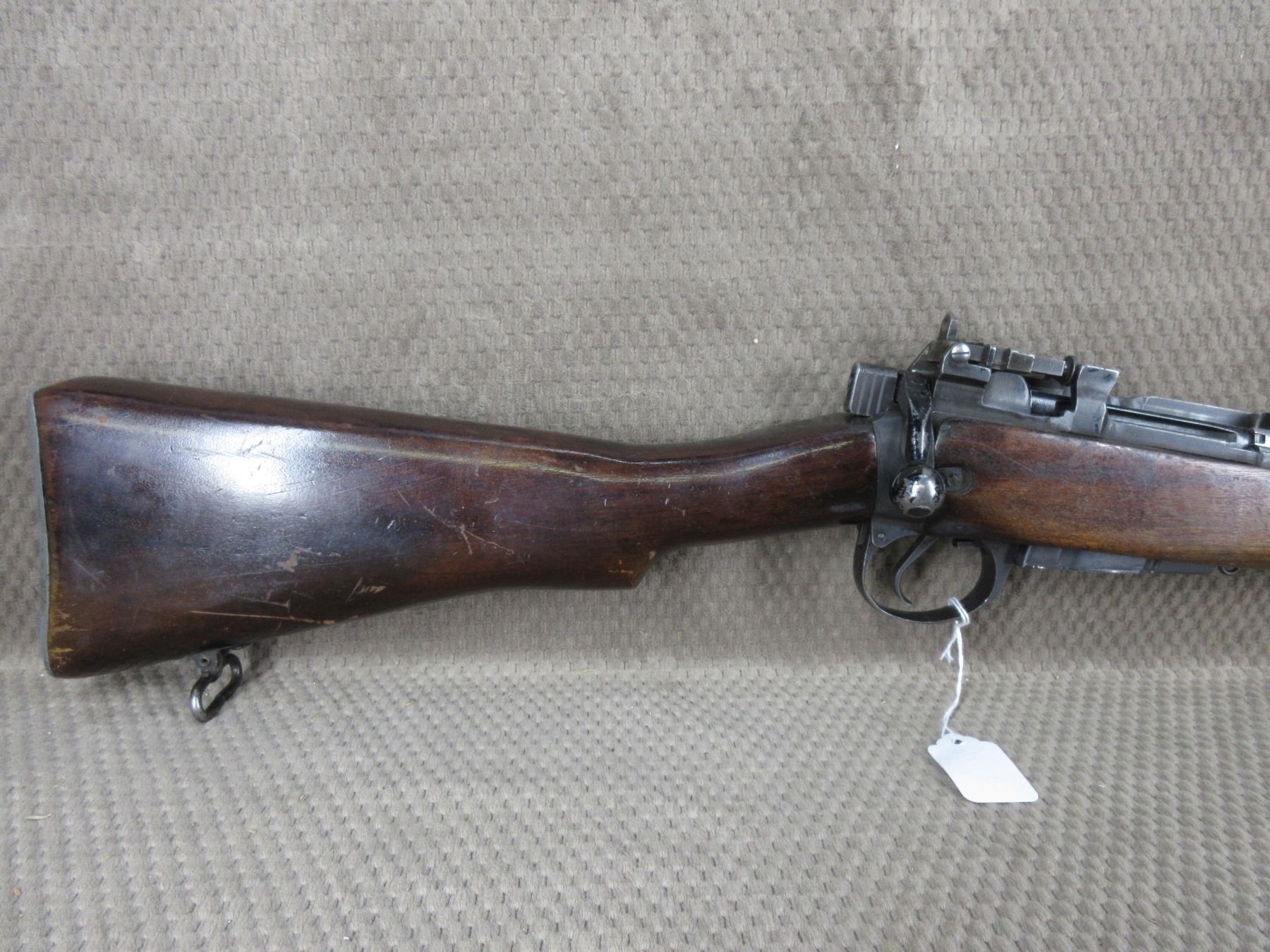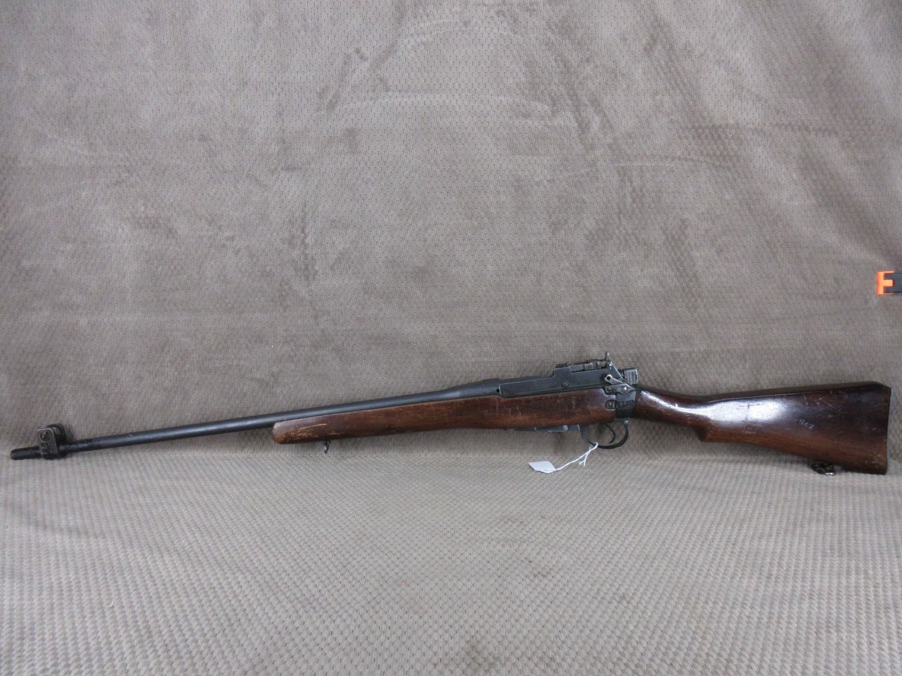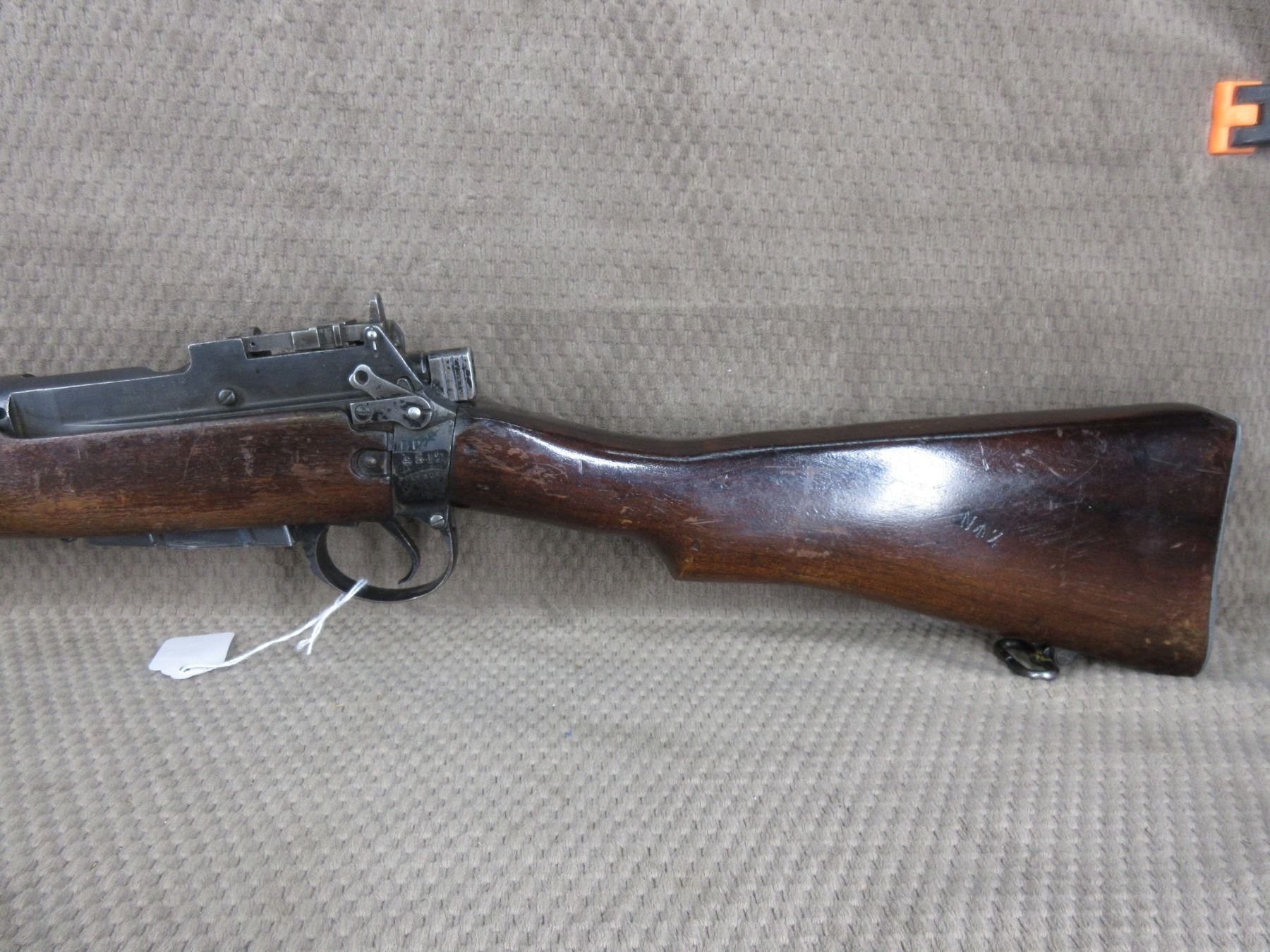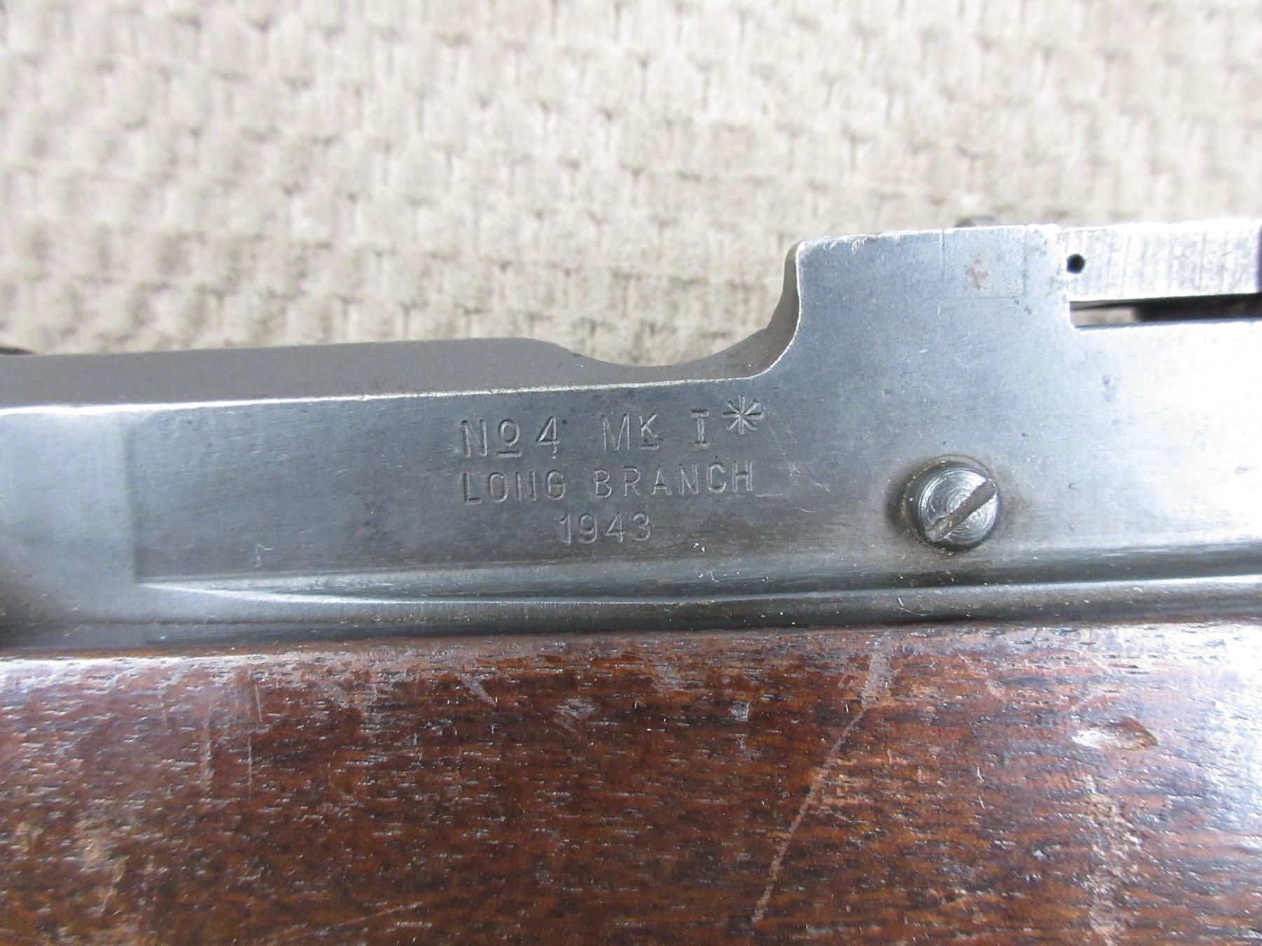 Non-Restricted - Sporterized Lee Enfield in 303 British No.4 Mk I* Long Branch 1943 - This bolt action 5 shot magazine rifle appears to be in good working order. Barrel is 25", bluing is fair and has some painted areas, rifling is very good, has both sights, stock good with usual marks, metal butt plate. Barrel says Surrey and has DP stamped in various places.