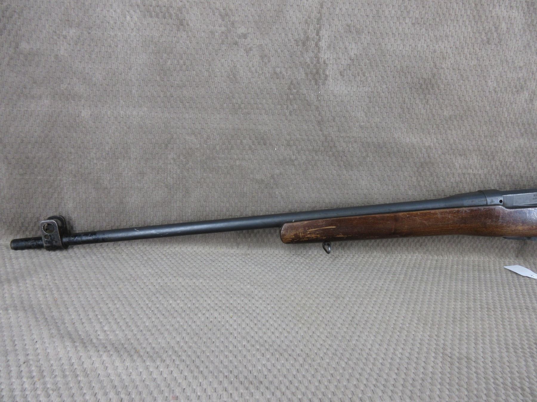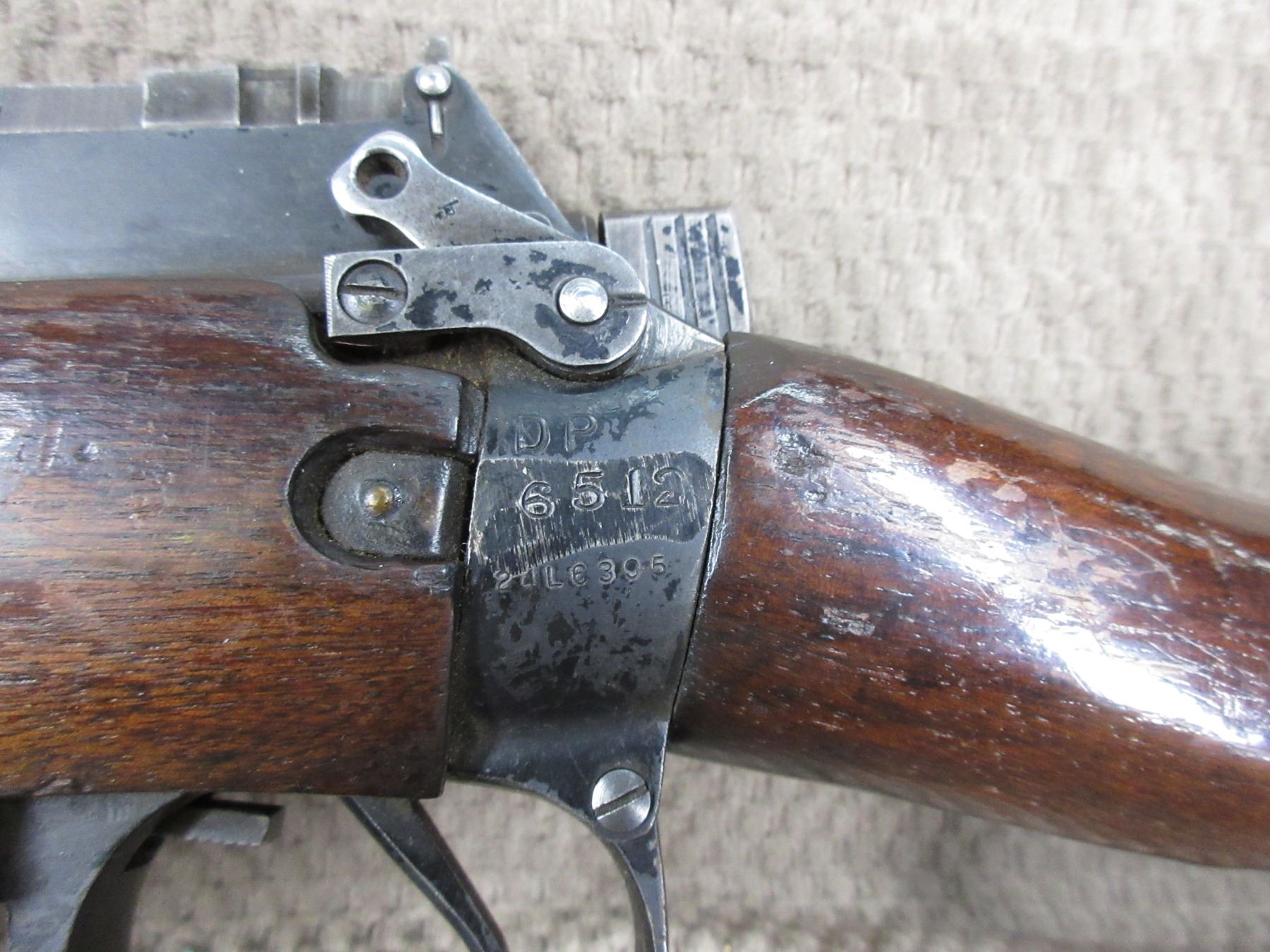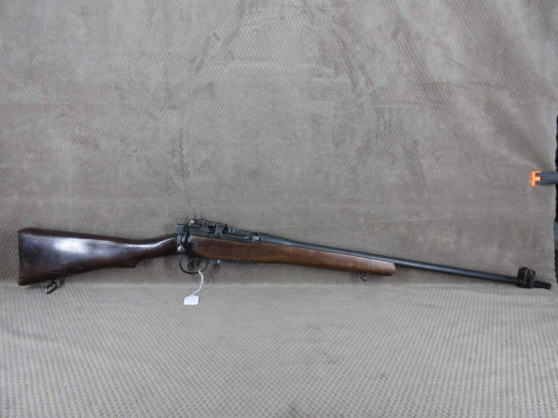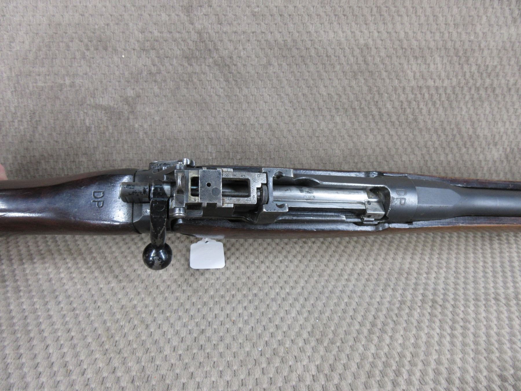 Non-Restricted - Sporterized Lee Enfield in 303 British No.4 Mk I* Long Branch 1943 - This bolt action 5 shot magazine rifle appears to be in good working order. Barrel is 25", bluing is fair and has some painted areas, rifling is very good, has both sights, stock good with usual marks, metal butt plate. Barrel says Surrey and has DP stamped in various places.