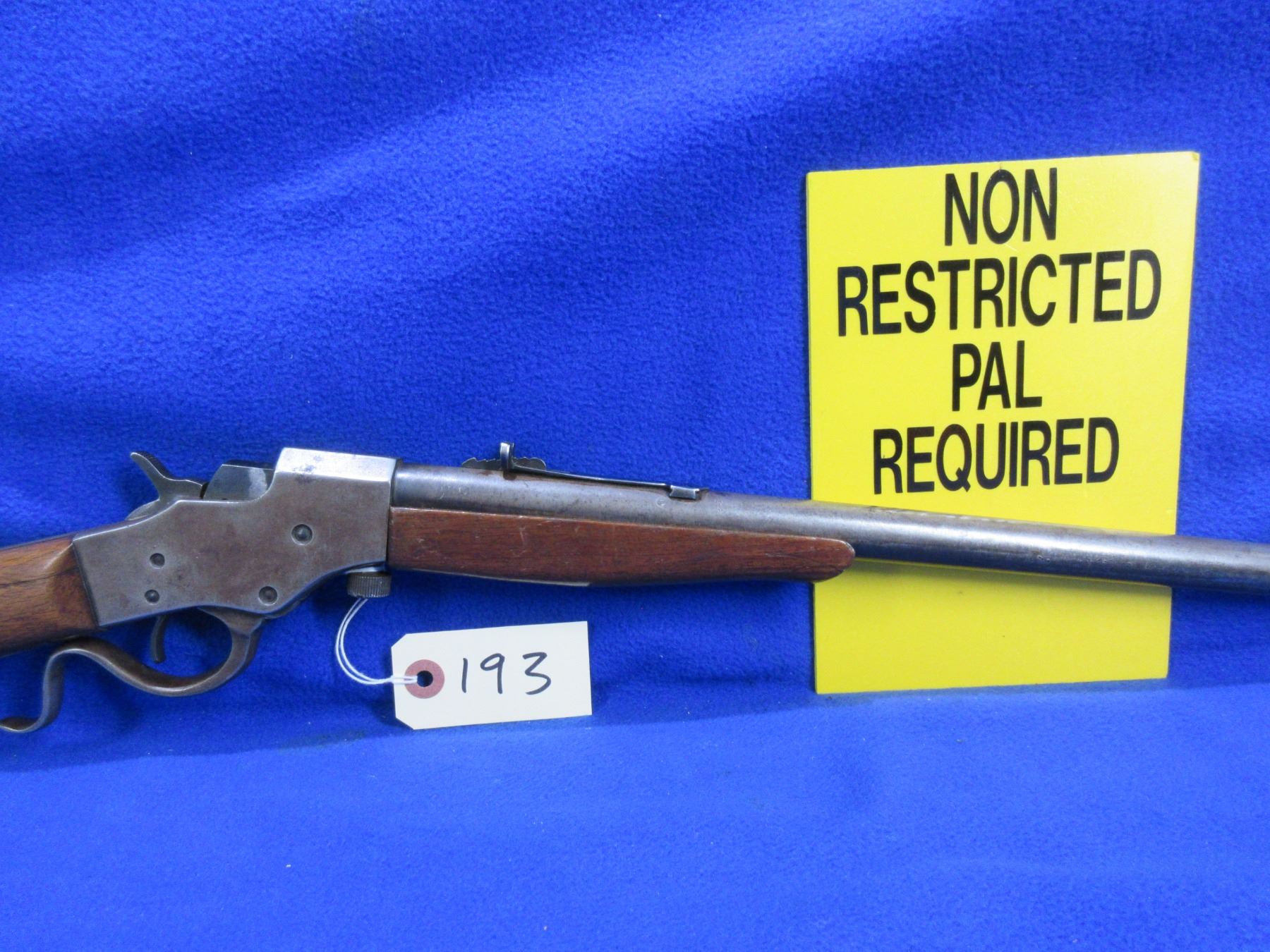 Non-Restricted - Stevens Model 1915 Favorite in 25 Stevens - This single shot falling block rifle appears to be in good to very good working order. Barrel is 24", rifling is good to very good, bluing is mostly gone, has both sights, stock is cracked in the wrist area and has a chip on the toe, forearm is good to very good with usage marks, non original butt plate poor. Ser # R875