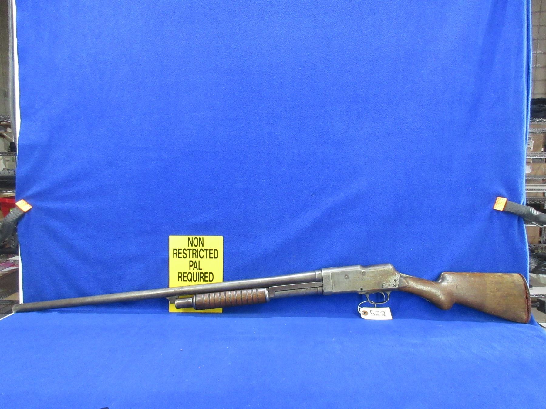 Non-Restricted - Stevens Model 520 in 12 Ga. 2 3/4" Full - This take-down pump action shotgun appears to be in good working order but the take-down appears stuck and stock would need to be replaced. Barrel is 30", bore is not very shiny, bluing is mostly gone, most of the front bead is missing, stock is poor, forearm is good, rubber recoil pad bad. Ser # None