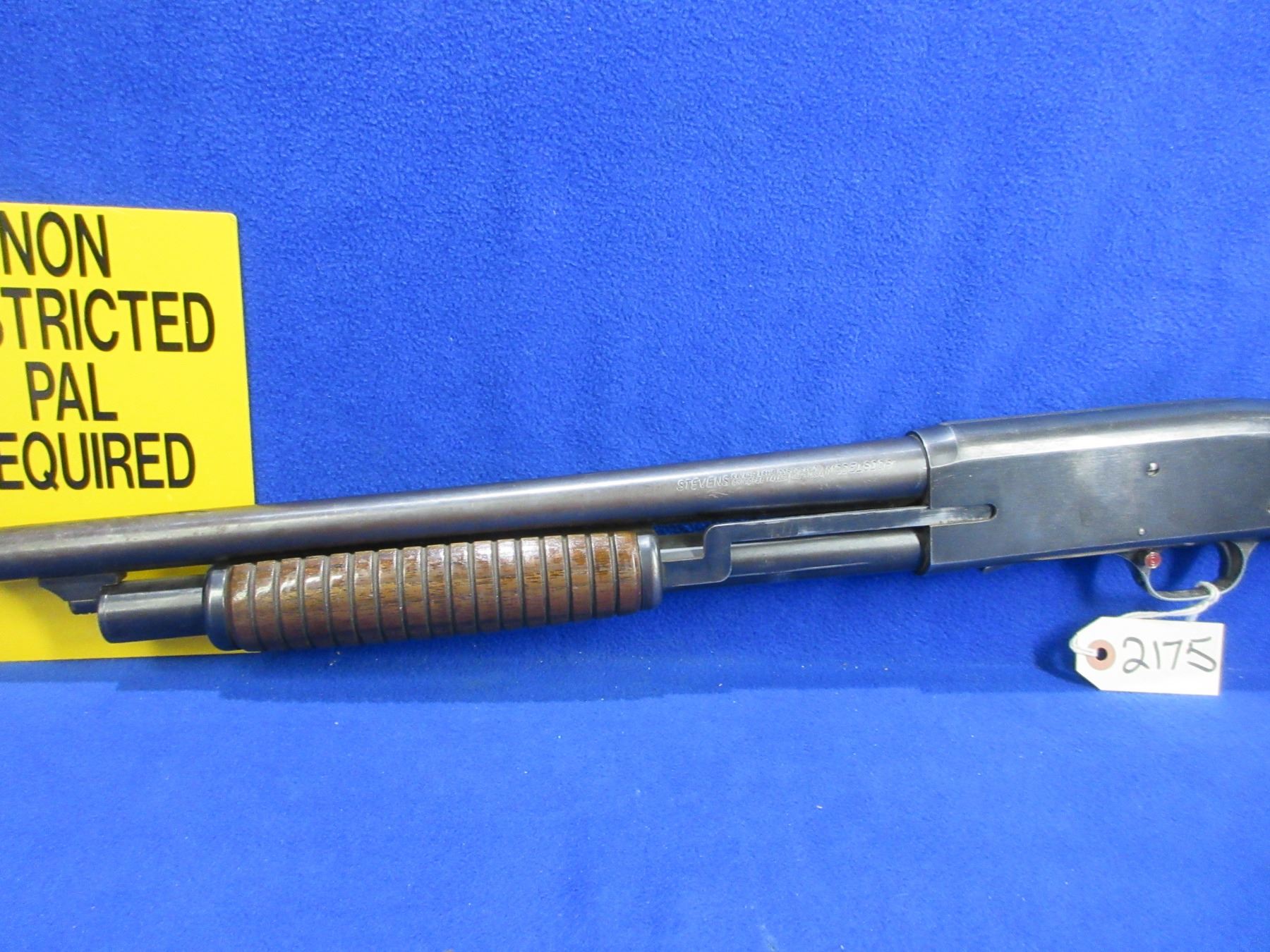 Non-Restricted - Stevens Model 820B in 12 Ga. 2 3/4" - This pump action shotgun appears to be in good to very good working order. Barrel is 24" with Savage Super Choke, bore is good, bluing is turning grey with some light pitting, bead front sightmissing, stock is good but finish is flaking, forearm is good, rubber recoil pad good. Ser # None