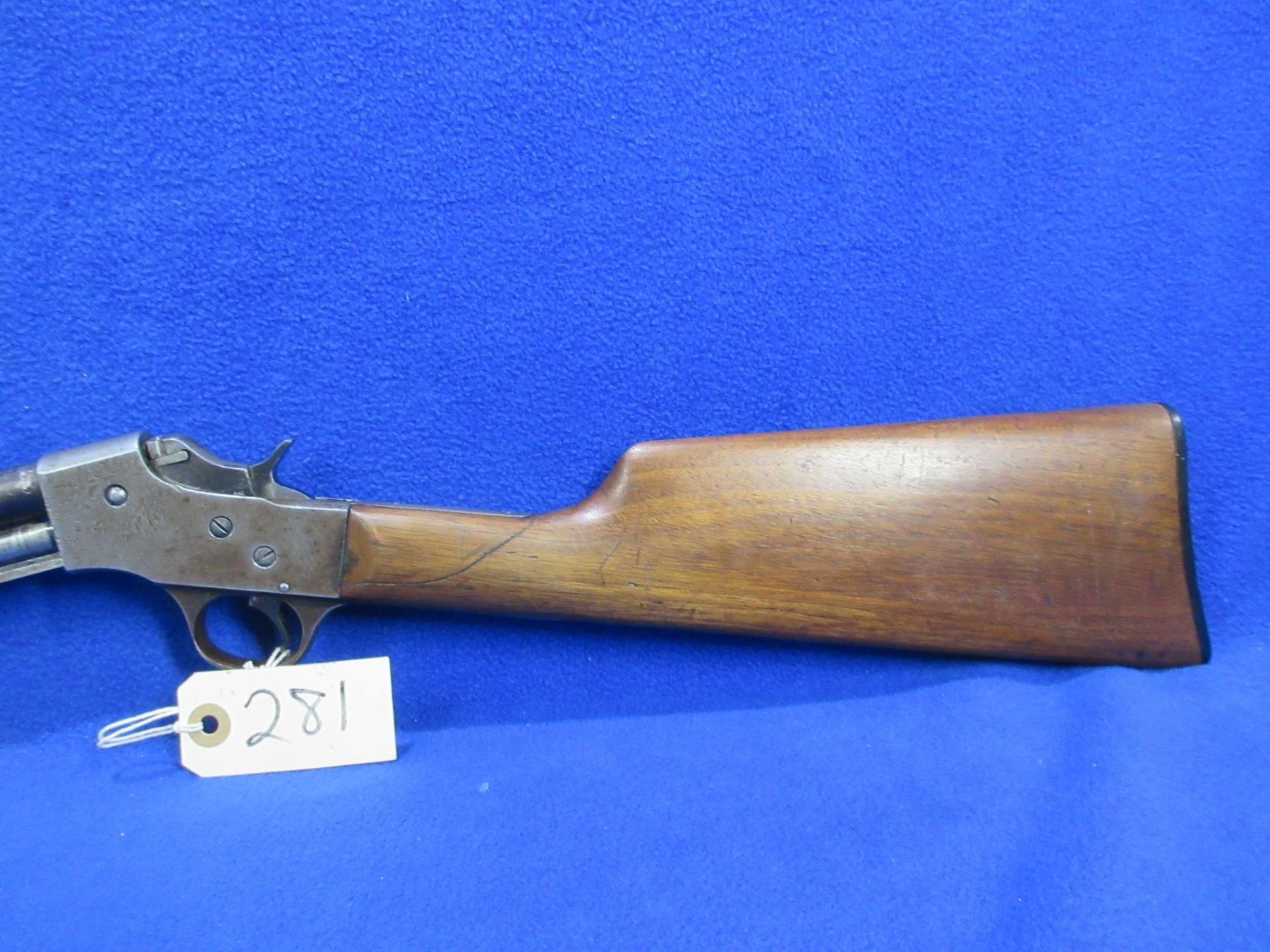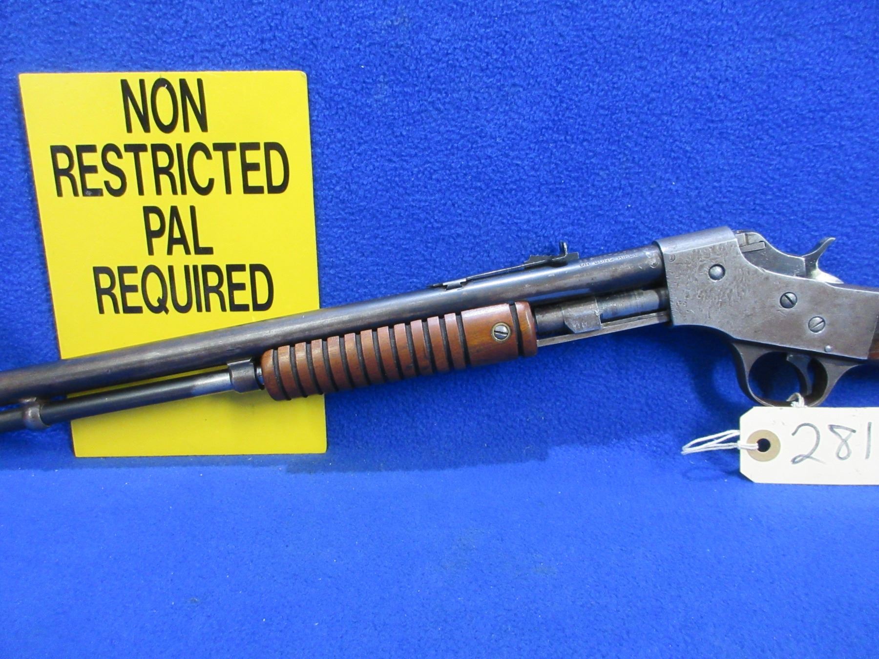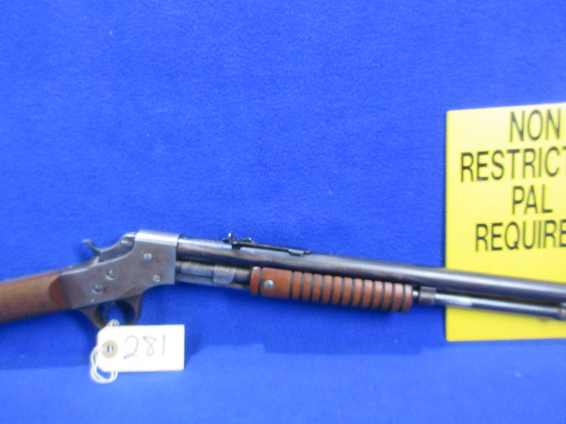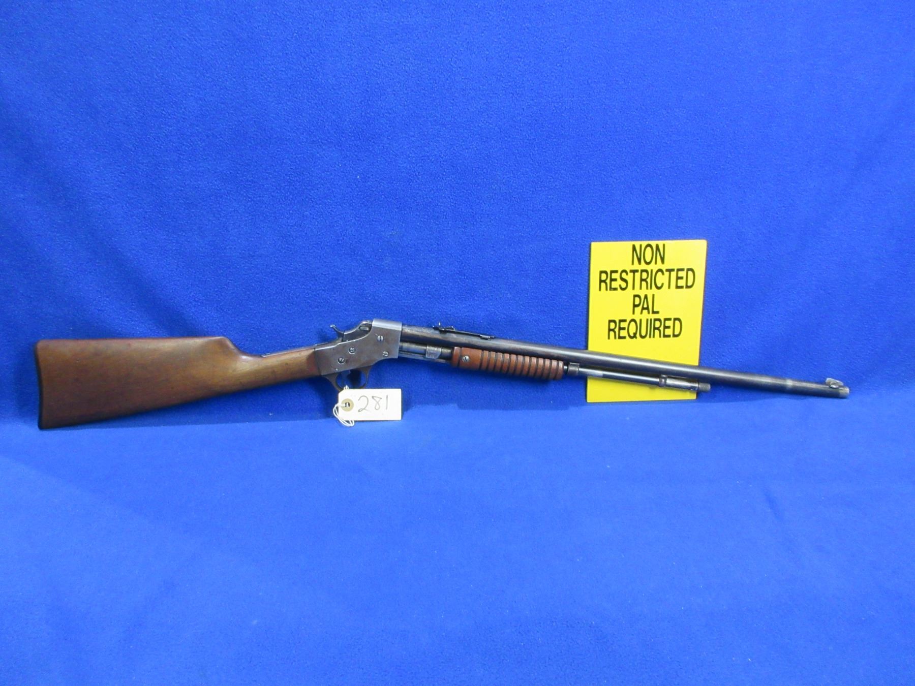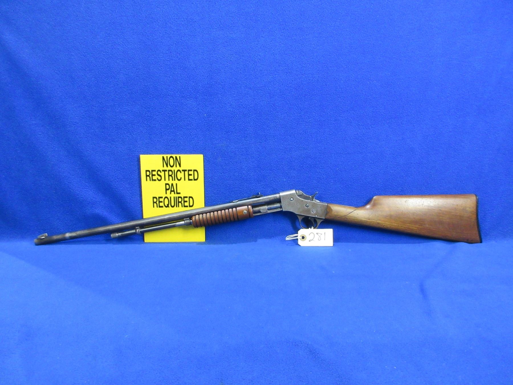 Non-Restricted - Stevens Visible Loader in 22 S/L/LR - This is a pump action rifle with tube magazine, action appears to be in good working order. Barrel is 22", rifling is fair but is ringed approx 3" from muzzle, bluing is turning grey, has both sights, stock is good with many usage marks and a long scratch on left side behind action, forearm has a hairline crack on the bottom at the back, length of pull is 13 1/4", butt plate good. Ser # O474