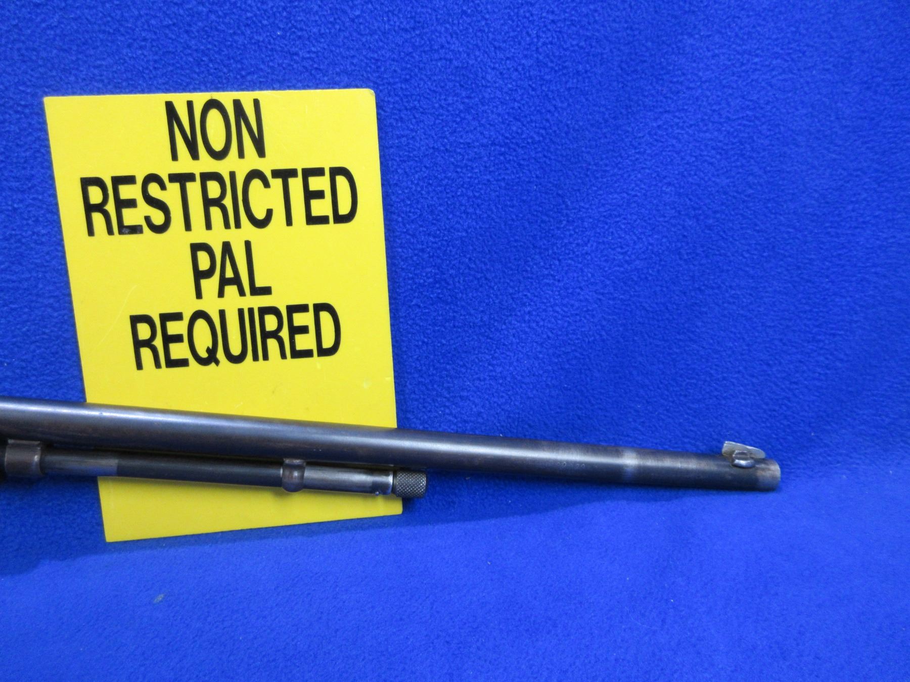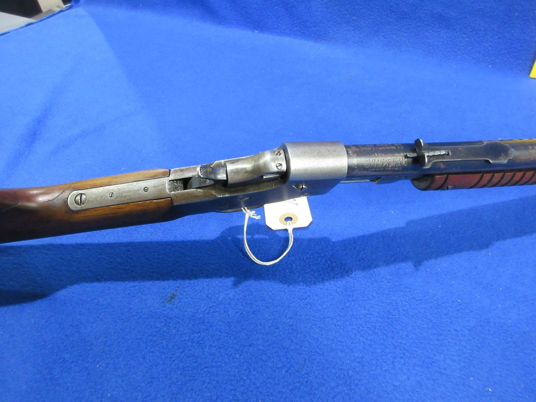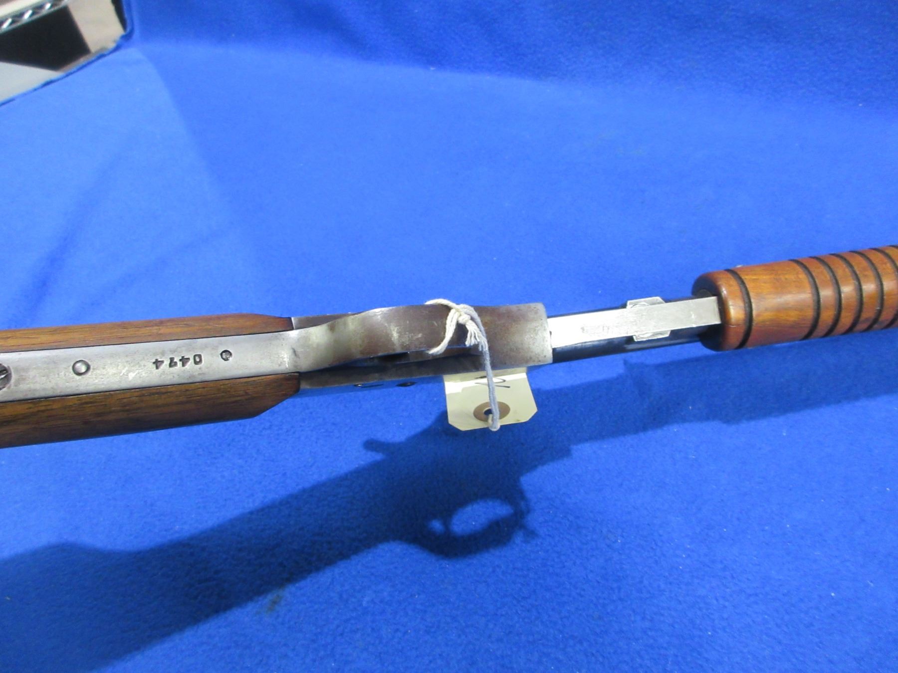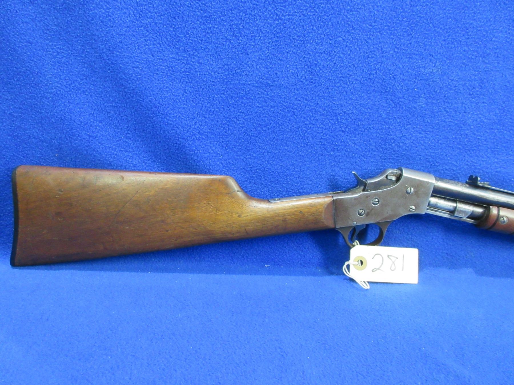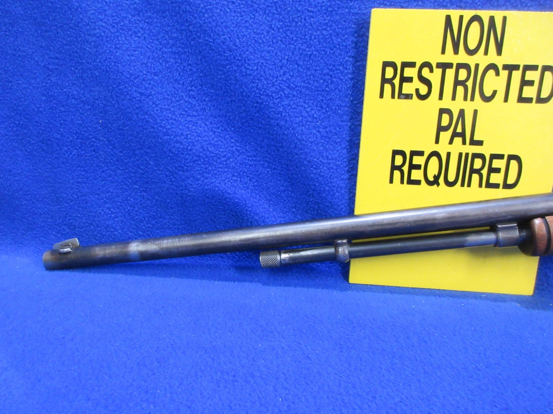 Non-Restricted - Stevens Visible Loader in 22 S/L/LR - This is a pump action rifle with tube magazine, action appears to be in good working order. Barrel is 22", rifling is fair but is ringed approx 3" from muzzle, bluing is turning grey, has both sights, stock is good with many usage marks and a long scratch on left side behind action, forearm has a hairline crack on the bottom at the back, length of pull is 13 1/4", butt plate good. Ser # O474