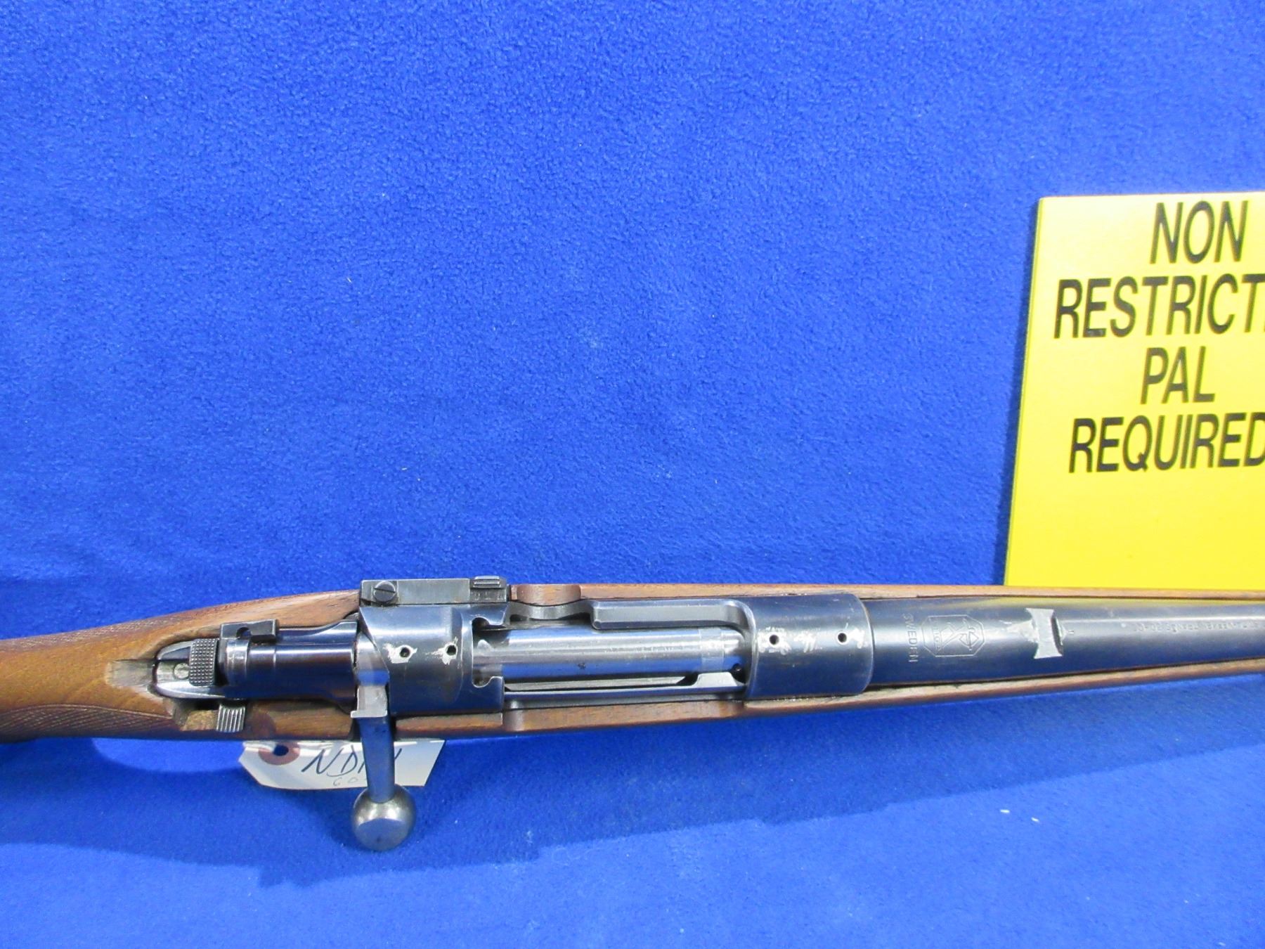 Non-Restricted - Stiga M96 in 30-06 Sprg - This bolt action rifle with floorplate magazine appears to be in good to very good working order. Barrel is 24", rifling is good to very good, bluing is turning grey, has front sight, rear sight missing but is drilled and tapped, stock is good to very good, butt plate good, comes with swivels. Ser #72756