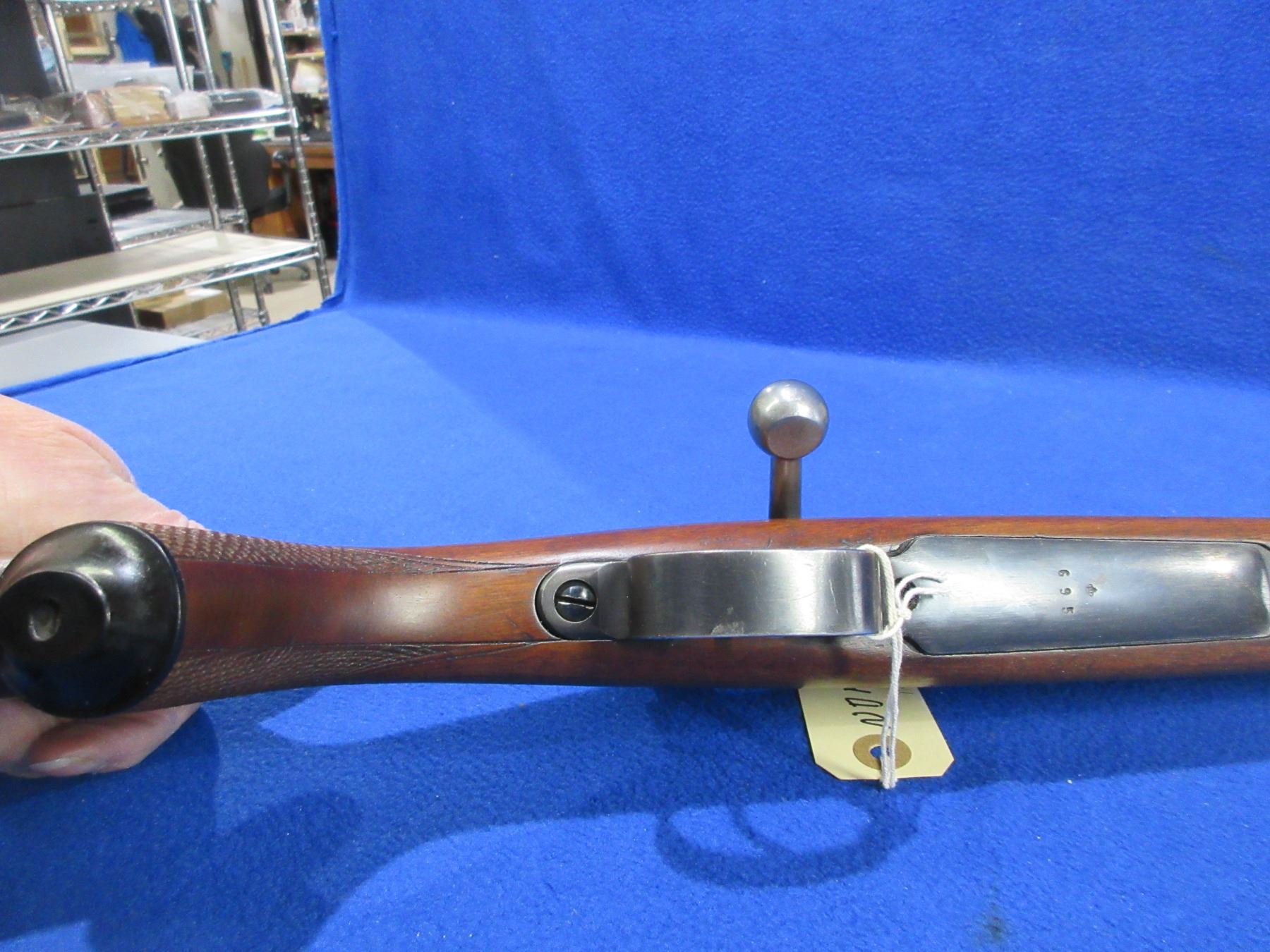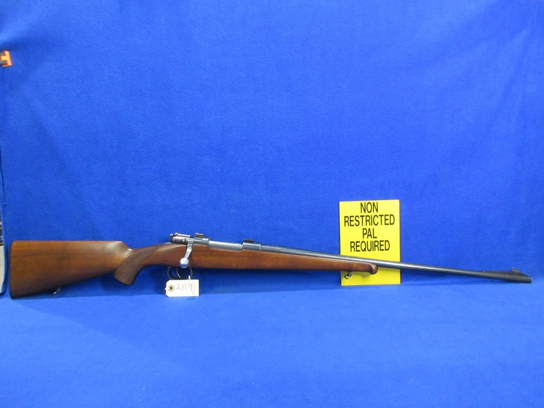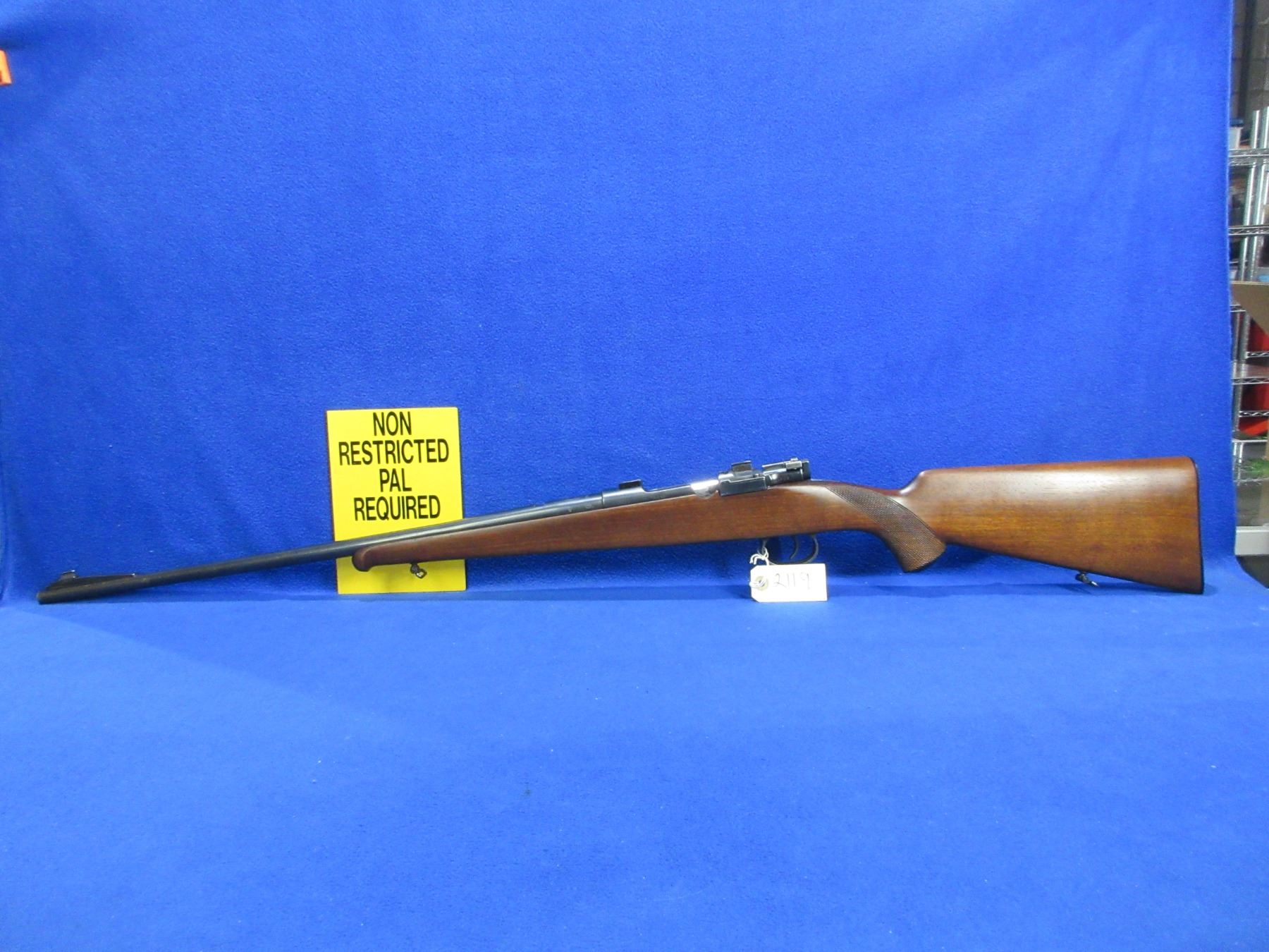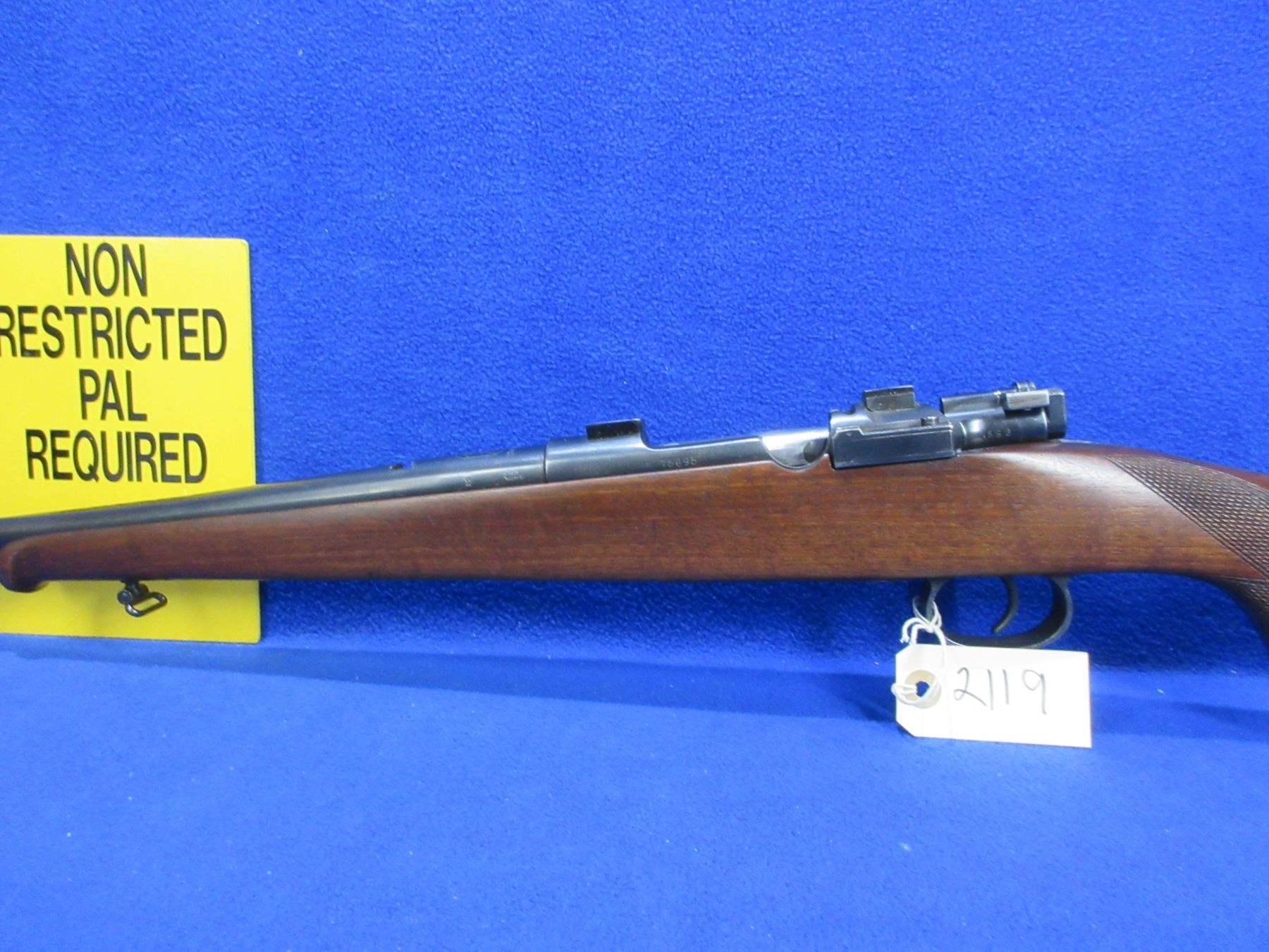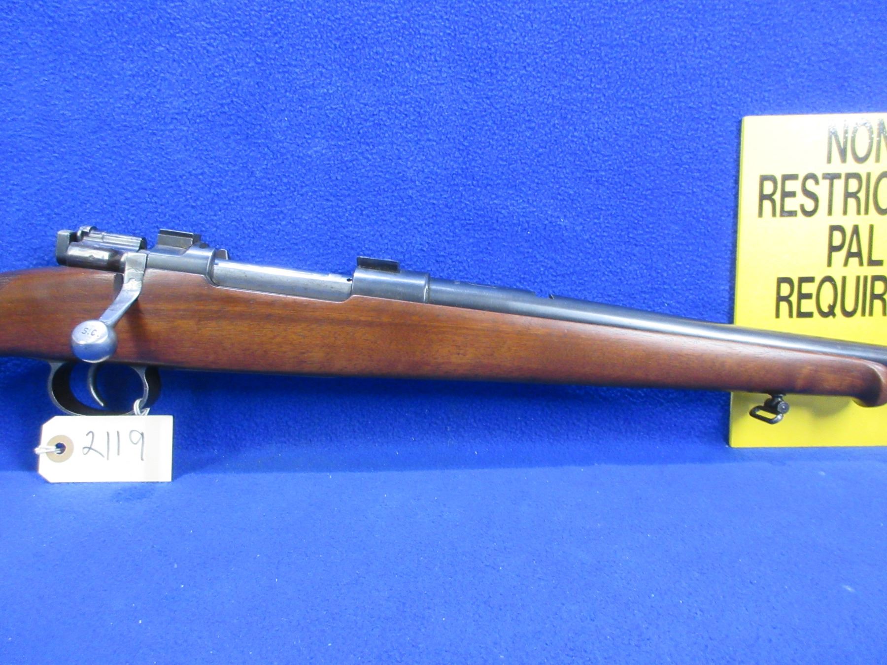 Non-Restricted -Stiga Model M96 in 30-06 Sprg - This is a bolt action rifle with floorplate magazine, action appears to be in good to very good working order. Barrel is 23 1/2", rifling is good to very good, bluing is good to very good, has front sight, rear sight missing but has European style bases and is drilled and tapped, stock is good to very good, length of pull is 14 1/2", butt plate good, comes with swivels. Ser # 75695