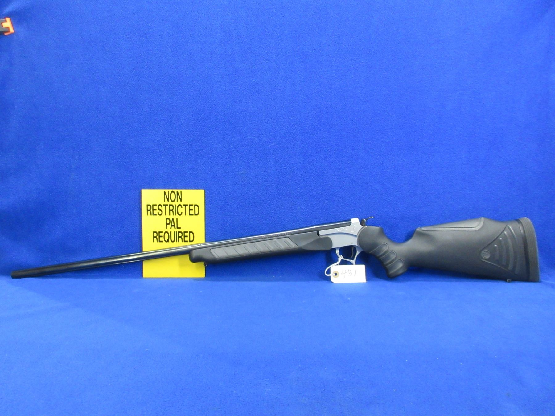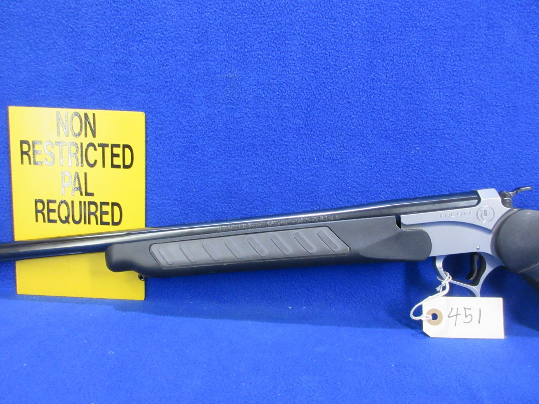 Non-Restricted - Thompson/Center Encore Pro Hunter in 30-06 Sprg - This single shot tip up hammer rifle is in very nice condition, action appears to be in very good working order. Fluted barrel is 28", rifling is very good, bluing is very good, has no sights but is drilled and tapped, synthetic stock and forearm are very good, length of pull is 14 1/2", rubber recoil pad very good, comes with swivel studs. Ser # 593369
