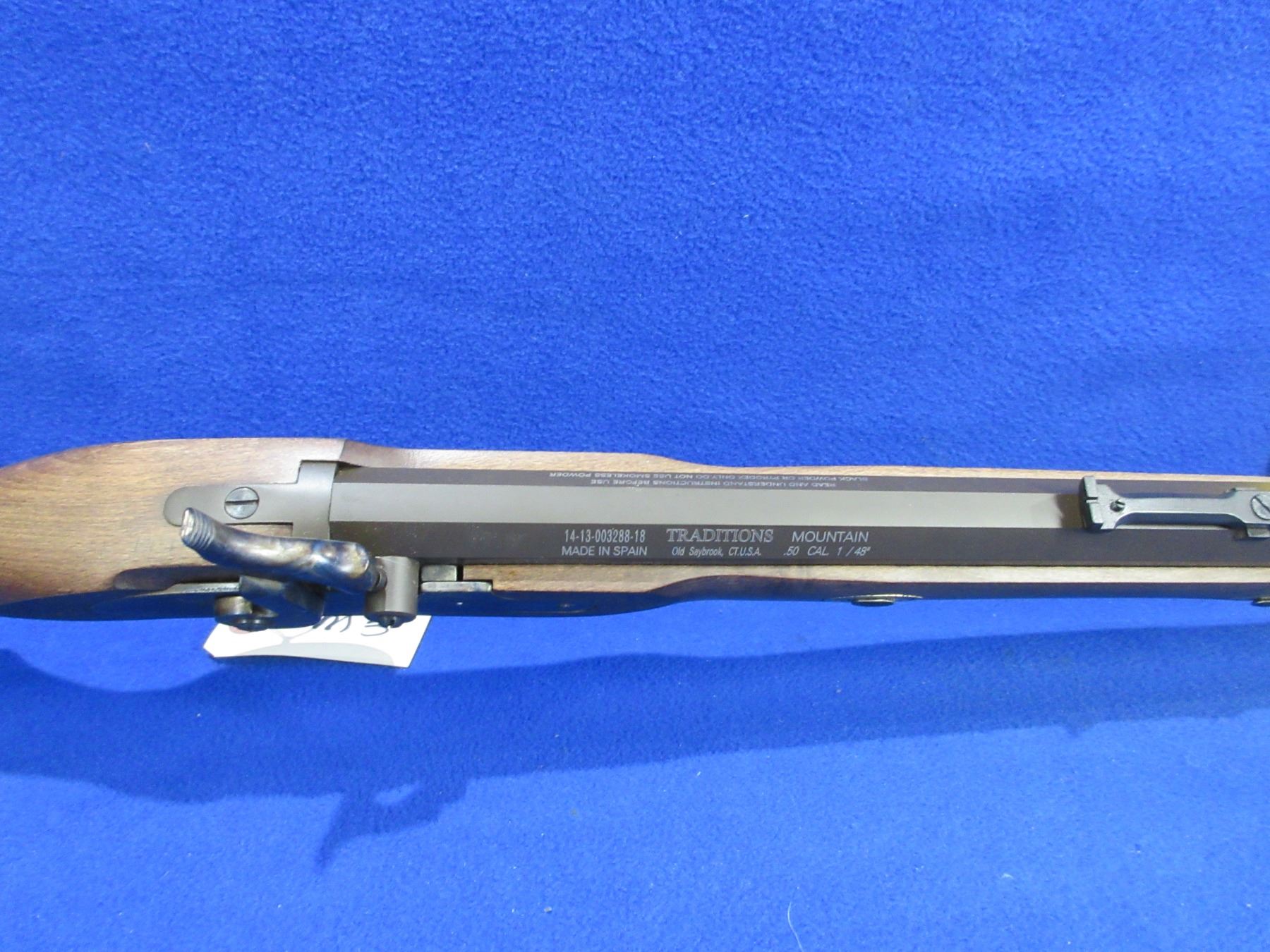 Non-Restricted - Traditions Mountain in 50 Cal. - This muzzleloading percussion cap rifle appears to be in very good working order. Black powder only. Octagon barrel is 31", case hardened action very good, has double set triggers, rifling is appears good, browning is very good, has both sights, stock is good to very good with minor scratch on the forearm, crescent butt plate good with a minor scratch, patch box is good. Ser # 14-13-003288-18