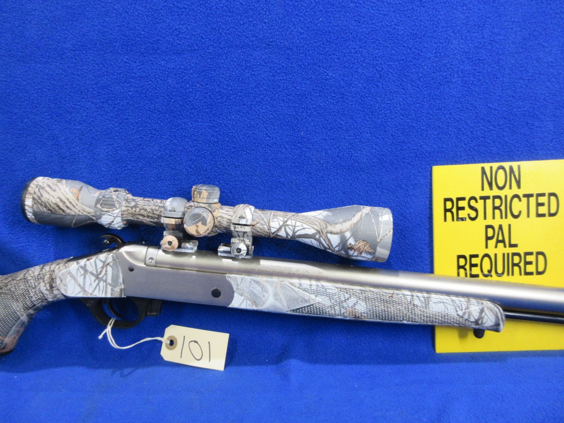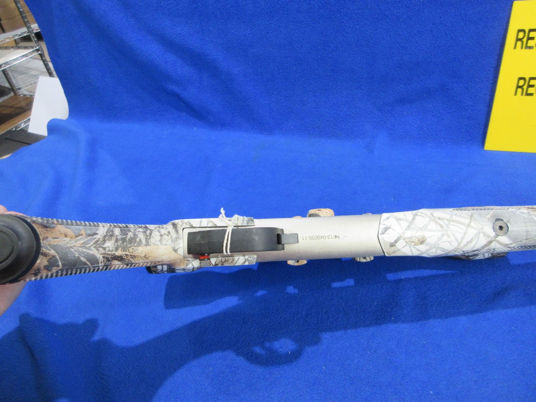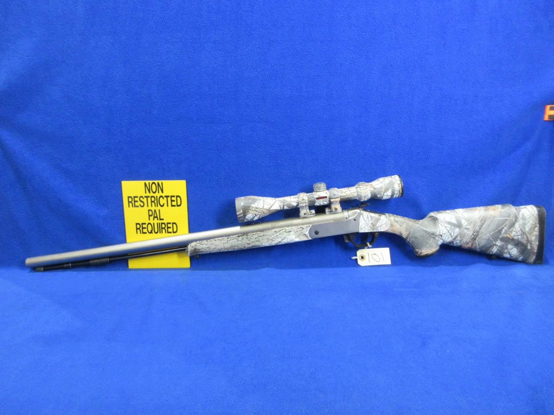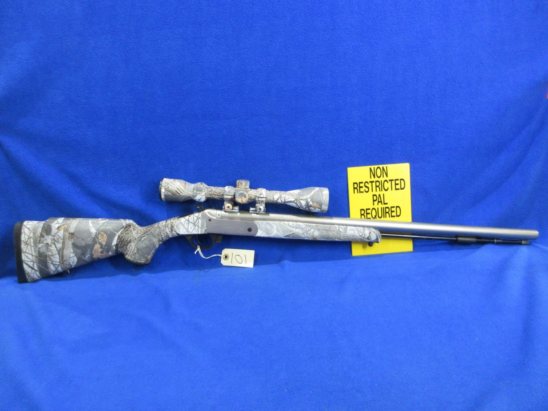 Non-Restricted - Traditions Pursuit LT Accelerator in 50 Cal. - This is a muzzleloading rifle with # 209 primer ignition w/Accelerator breech plug. Action appears to be in very good working order. Barrel is 26", rifling appears good to very good, nickel finish is good to very good, has no sights but has Traditions 3.5-10x44 scope with Mossy Oak Hardwood finish - appears clear - range-finding reticle, synthetic stock and forearm are in good condition but Mossy Oak Hardwood finish is degrading and sticky, rubber butt pad, comes with swivel studs, ram rod and lens caps. Ser # 14-13-049035-11