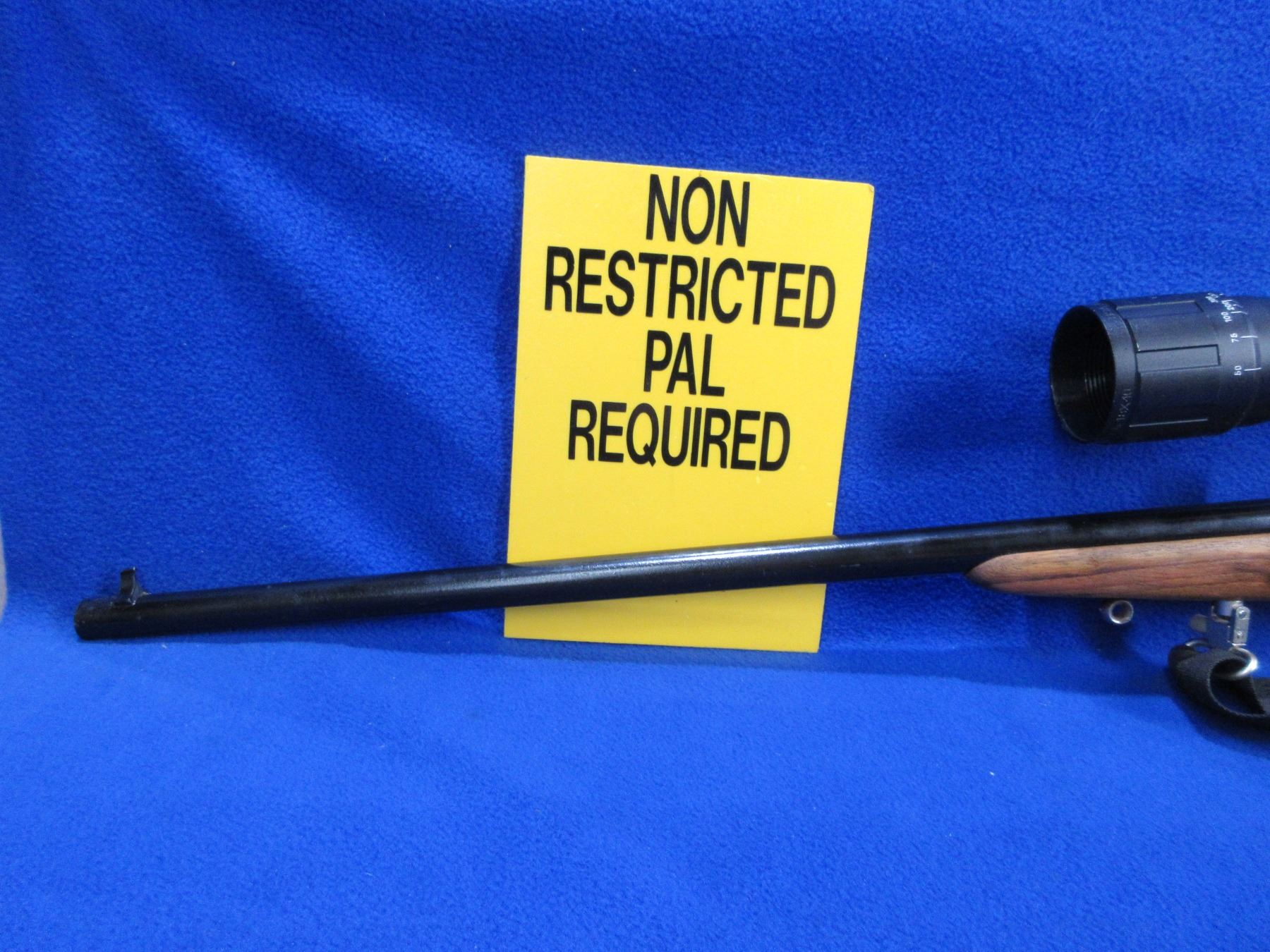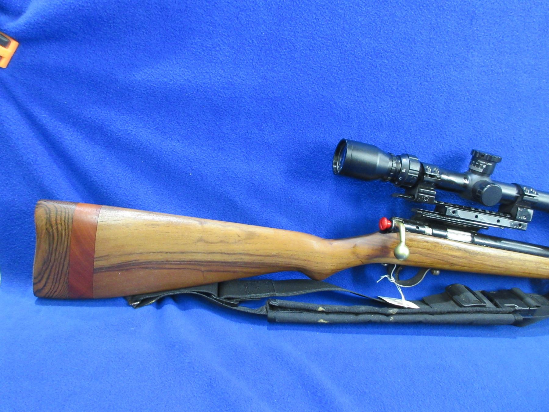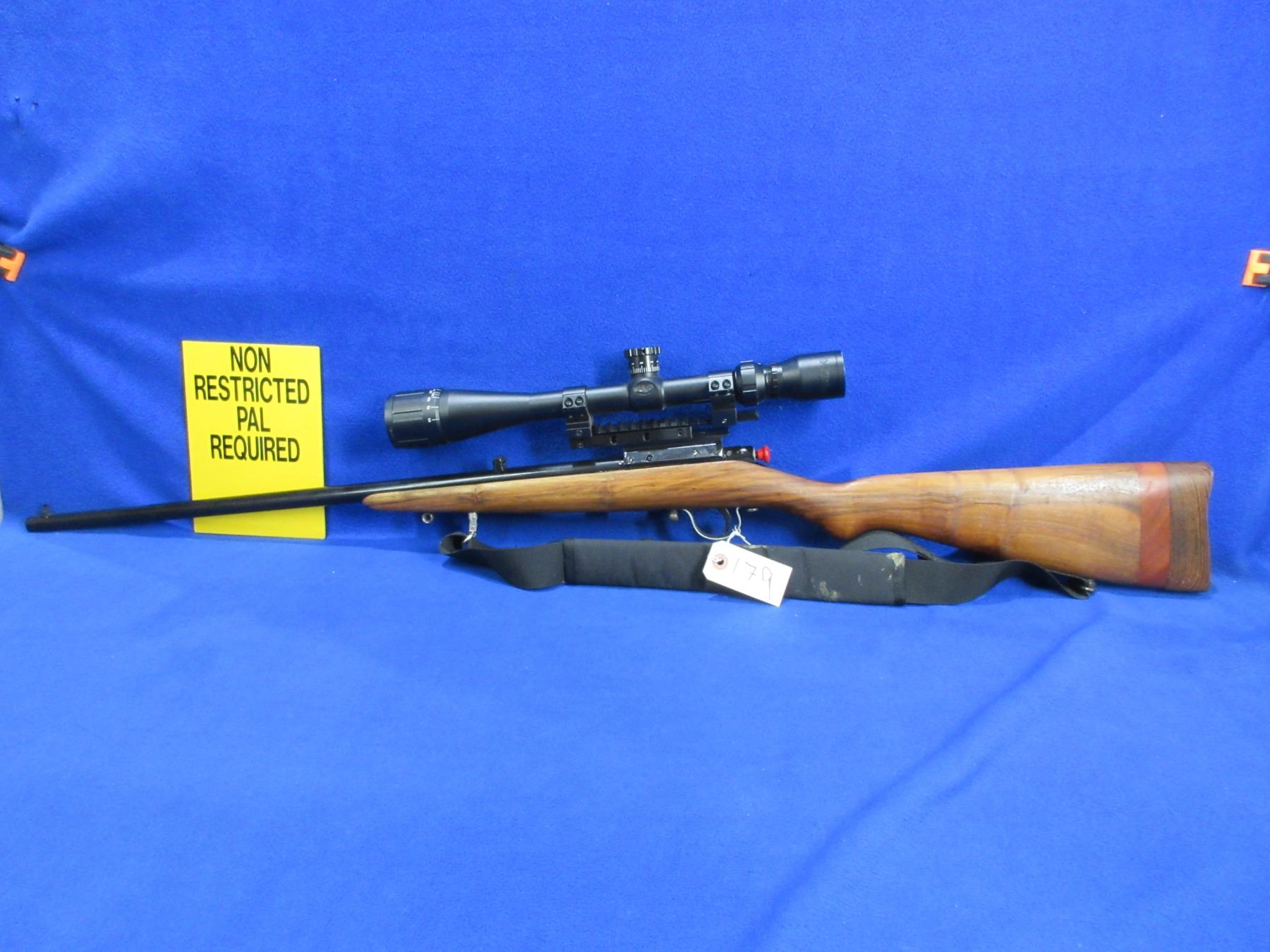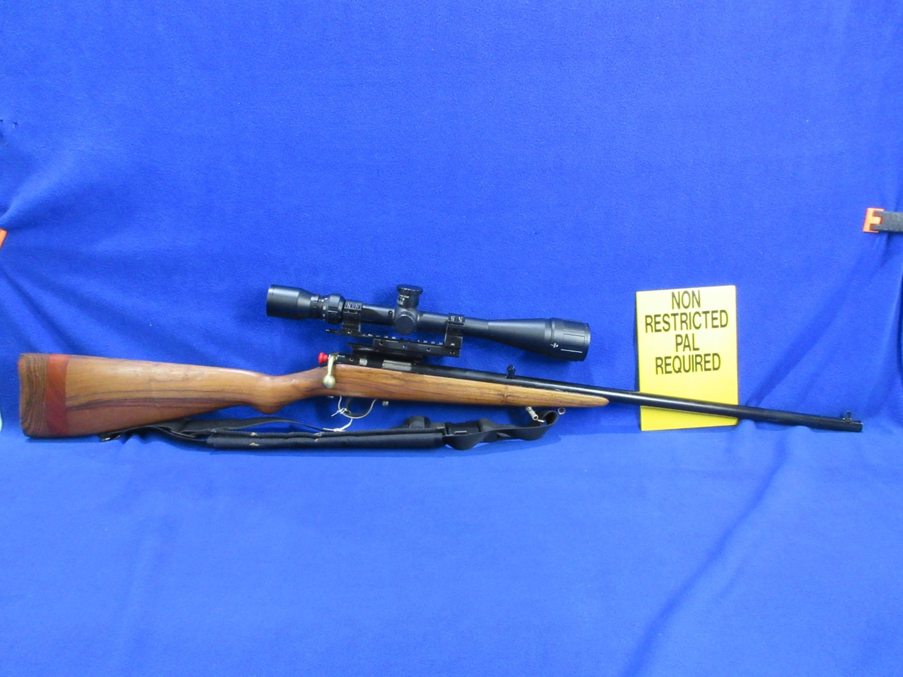 Non-Restricted - Unknown Rifle in 22 LR - This single shot bolt action rifle appears to be in good to very good working order. Barrel is 23 3/4", rifling is fair to good, bluing has been painted black, bolt handle has been painted, has both sights and a BSA Sweet 17 6-18x40mm scope - appears clear - duplex crosshair - with side mounts, stock is good but has been extended twice - appears to have been a youth model, comes with swivels and sling, rifle information and serial number has been painted over making all illegible. Ser# None
