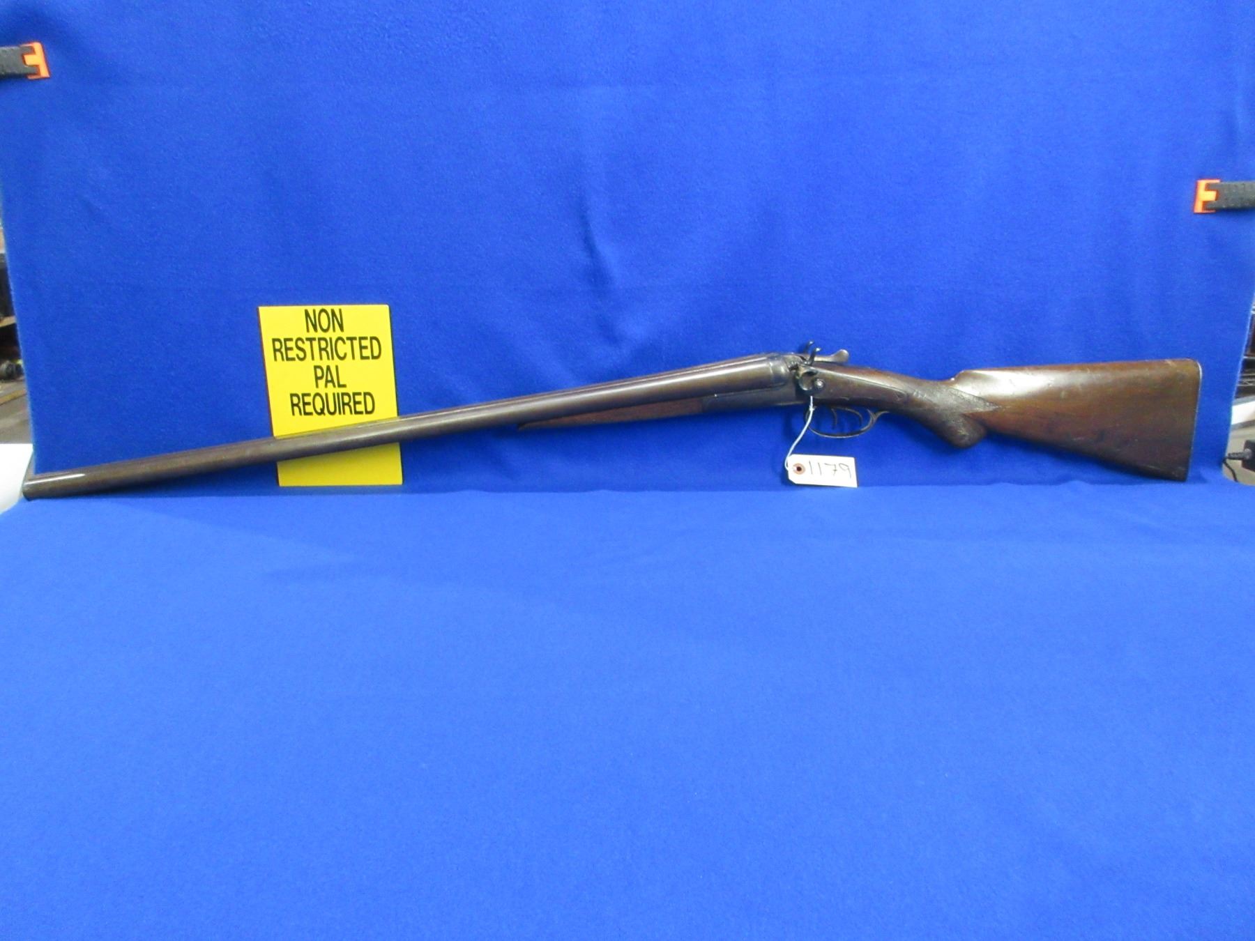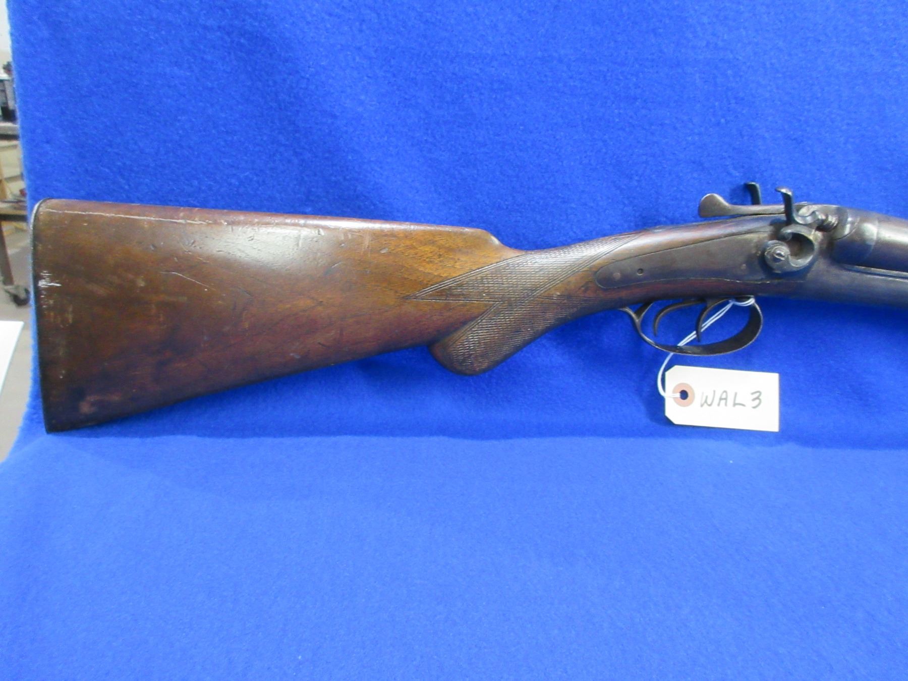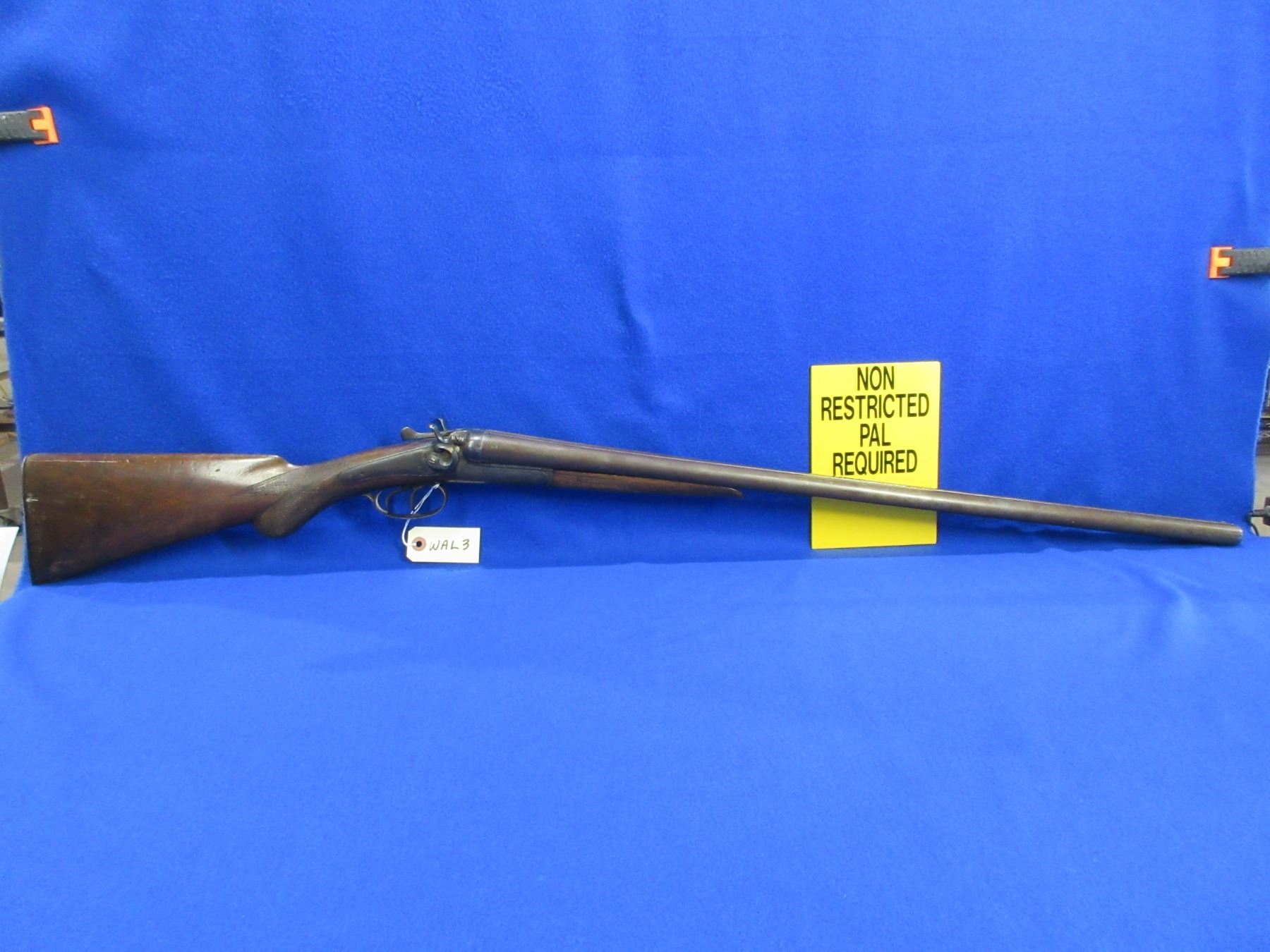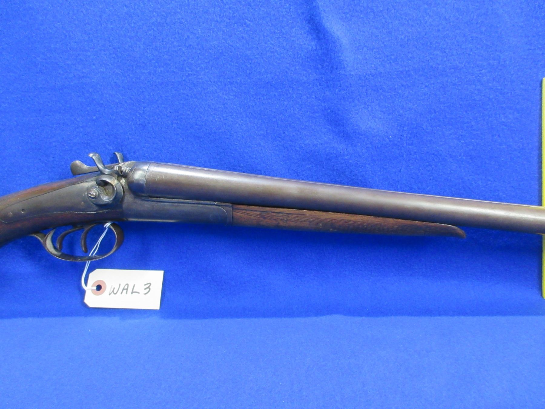 Non-Restricted - Walters & Sons Hammer SXS in 12Ga - This tip up hammer SXS shotgun appears to be in working order but action is loose and should not be fired without checking with a gunsmith, both hammers have been welded, black powder only. Damascus barrels are 30", bores are good but right barrel has a dent approx 2" from the muzzle, bluing is turning brown, has bead front sight, stock is good for age with many usage marks, forearm is good for age with many usage marks, metal butt plate fair with some pitting, rear swivel stud missing. Ser # 9244