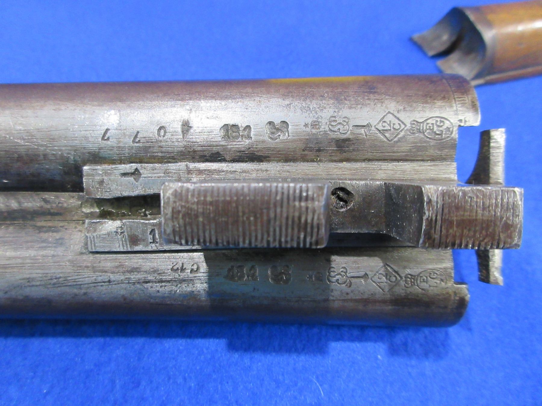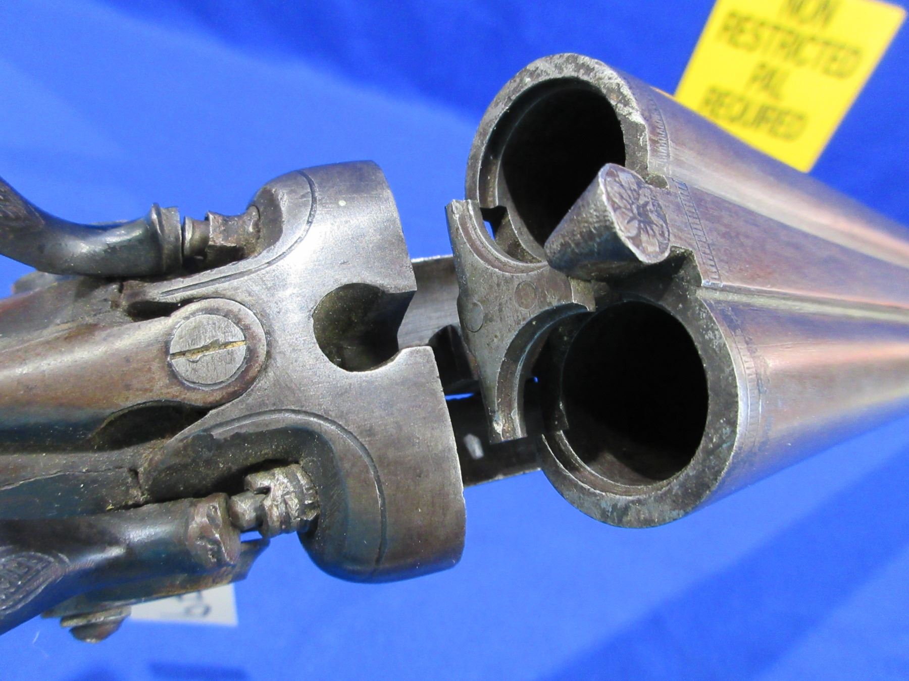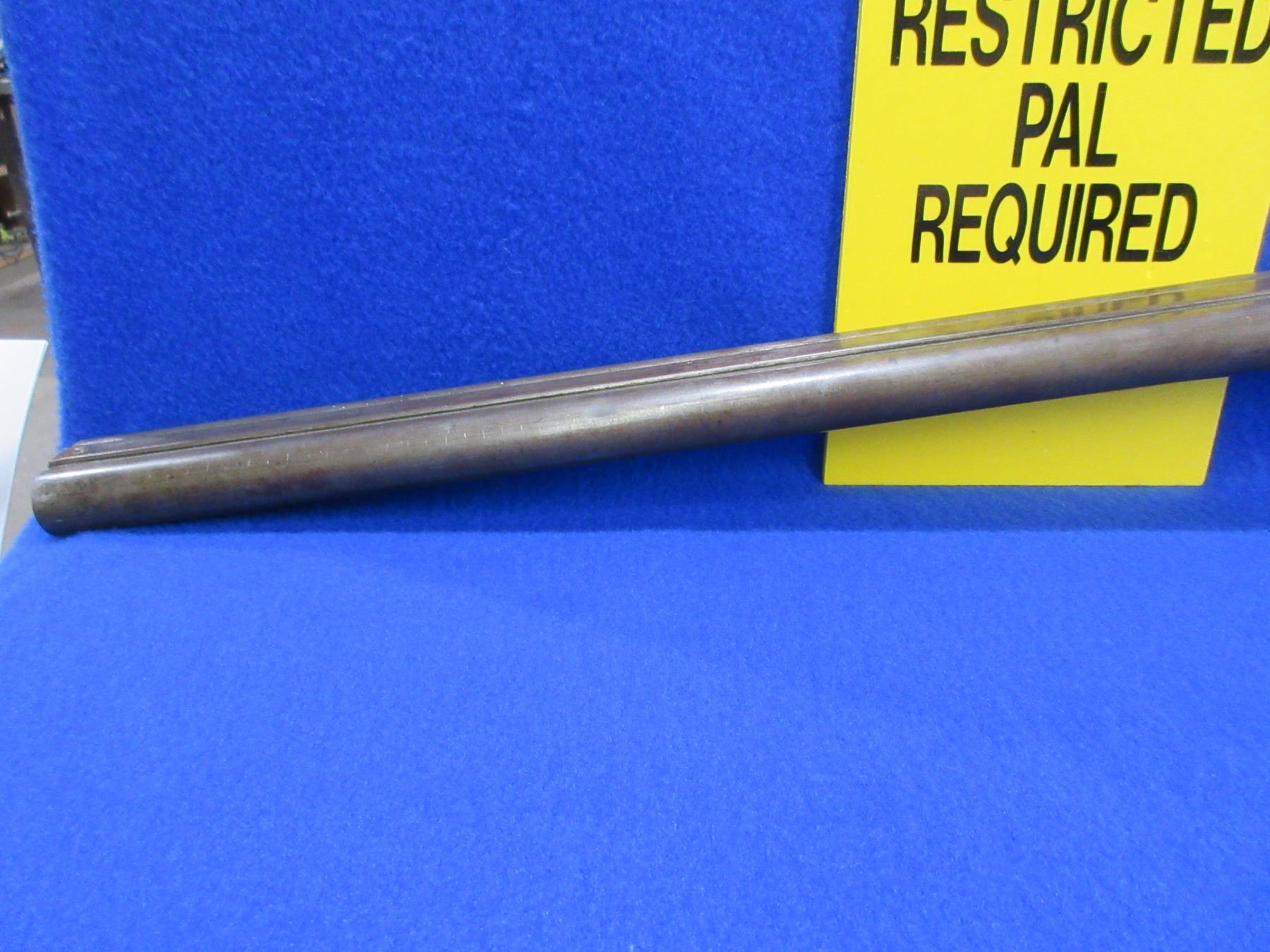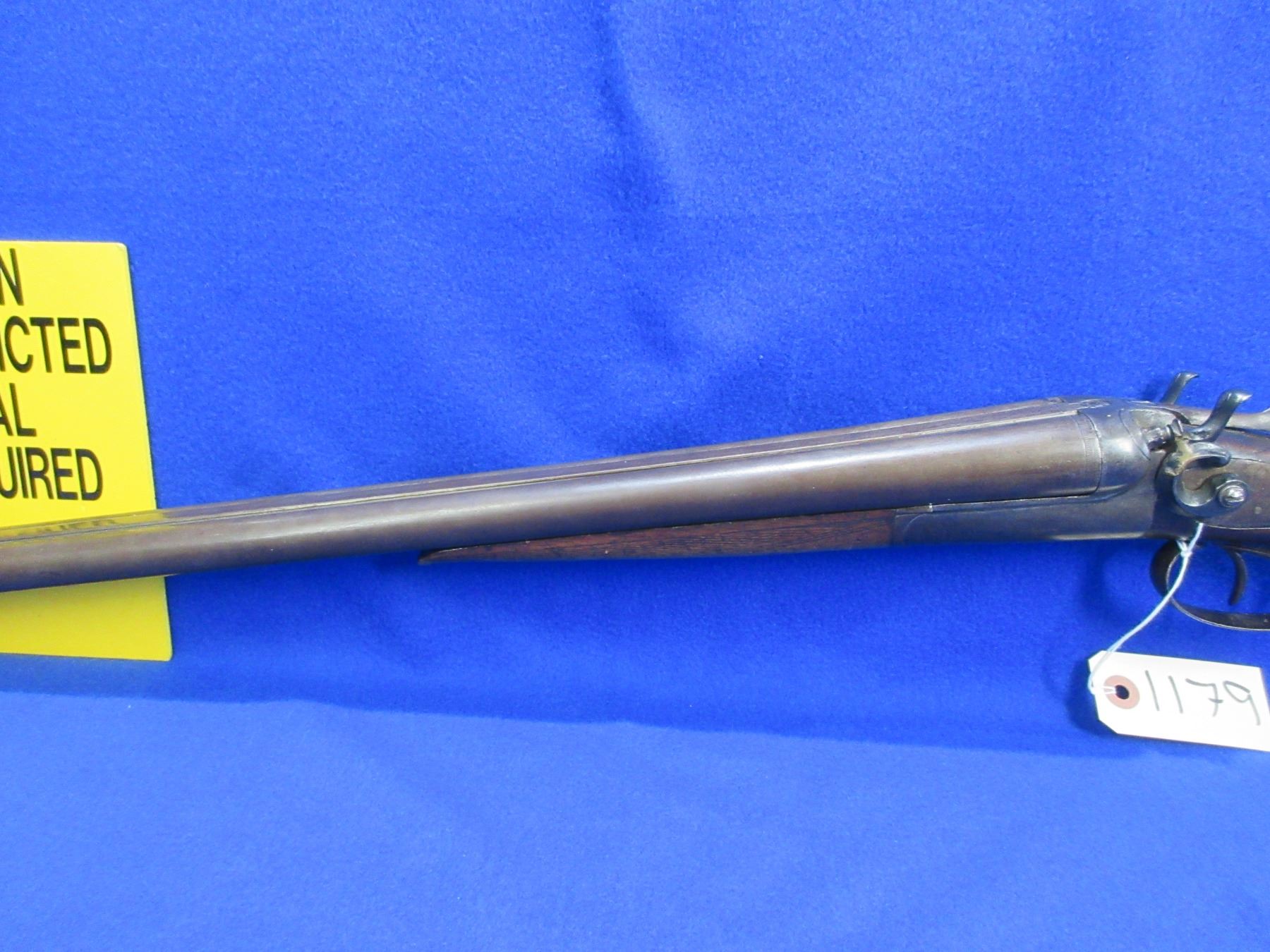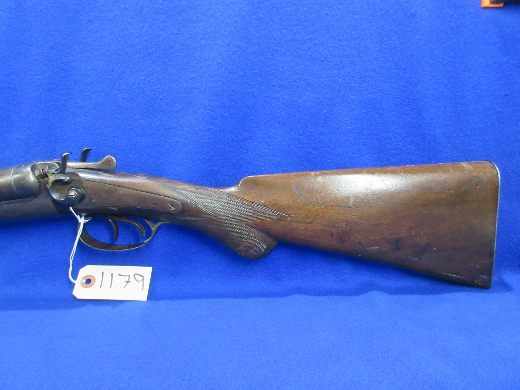 Non-Restricted - Walters & Sons Hammer SXS in 12Ga - This tip up hammer SXS shotgun appears to be in working order but action is loose and should not be fired without checking with a gunsmith, both hammers have been welded, black powder only. Damascus barrels are 30", bores are good but right barrel has a dent approx 2" from the muzzle, bluing is turning brown, has bead front sight, stock is good for age with many usage marks, forearm is good for age with many usage marks, metal butt plate fair with some pitting, rear swivel stud missing. Ser # 9244