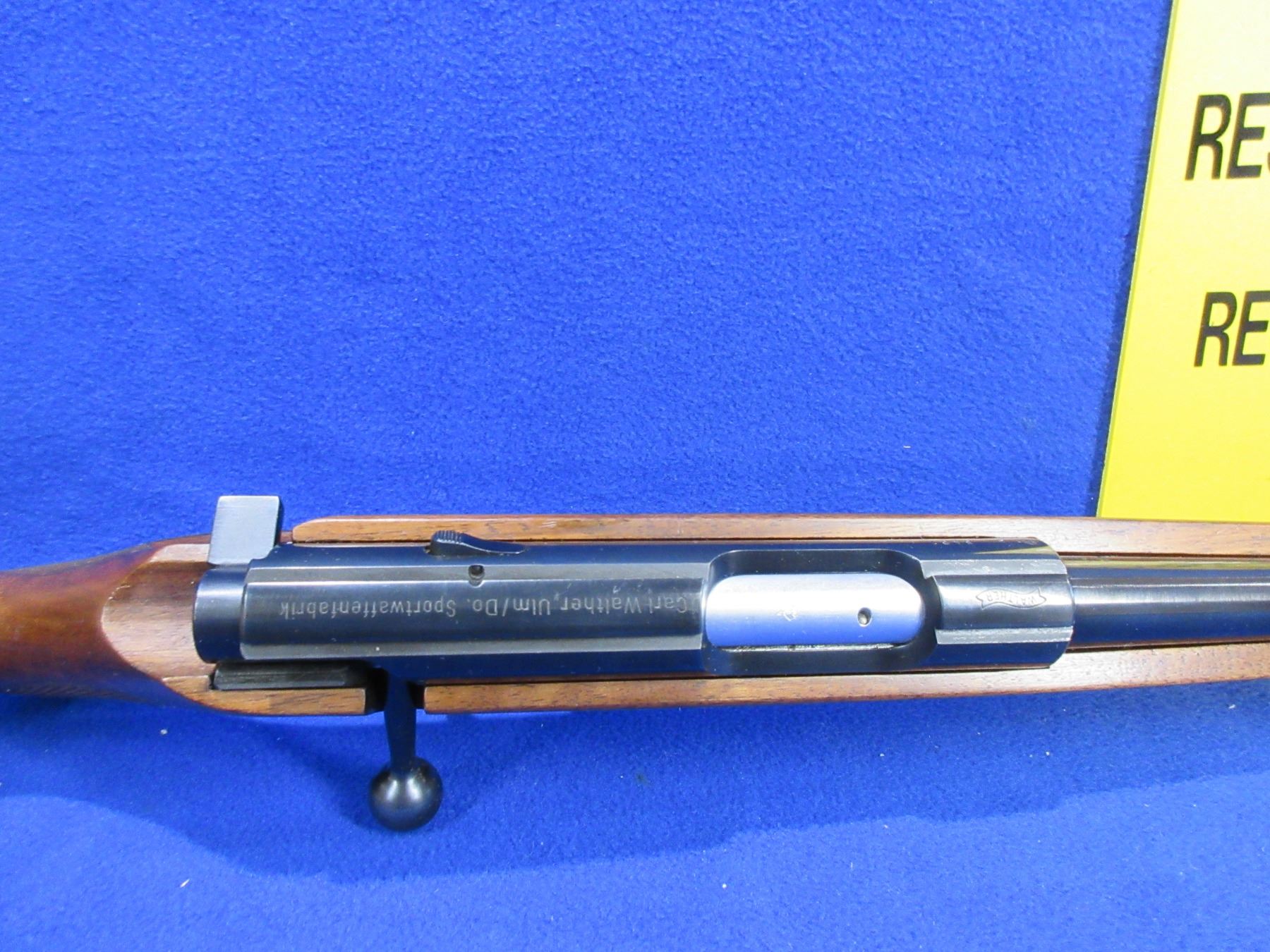 Non-Restricted - Walther in 22 LR - This bolt action rifle with removable magazine appears to be in good to very good working order. Barrel is 22", rifling is very good, bluing is good to very good, missing the sights but has integral scope mount , stock is good to very good, butt plate good, comes with swivel studs, muzzle cap is missing. Ser # 5461
