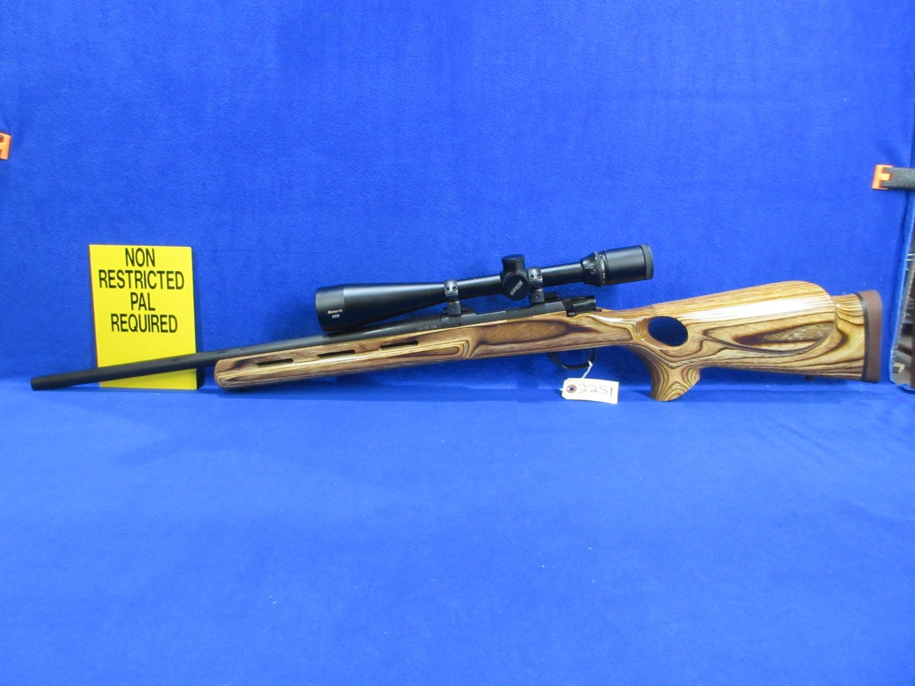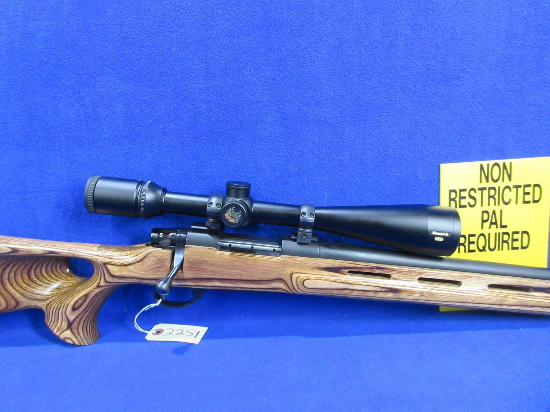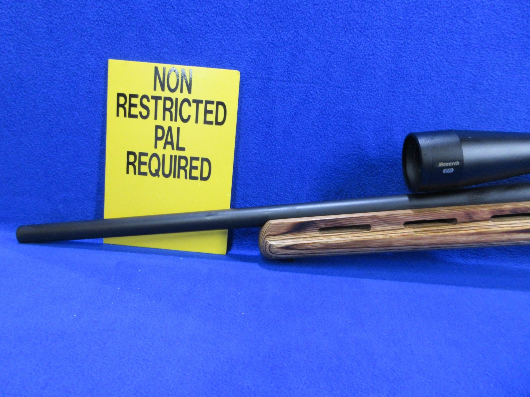 Non-Restricted - Weatherby Vanguard in 224 Wby Magnum - This bolt action rifle with removable magazine appears to be in very good working order. Barrel is 22", rifling is very good, bluing is good to very good, has no sights but has Nikon Monarch ED 8-32x50 scope - fine crosshair with dot - appears clear, laminated thumbhole stock is very good, rubber recoil pad good, comes with swivel studs. Ser #VS346052
