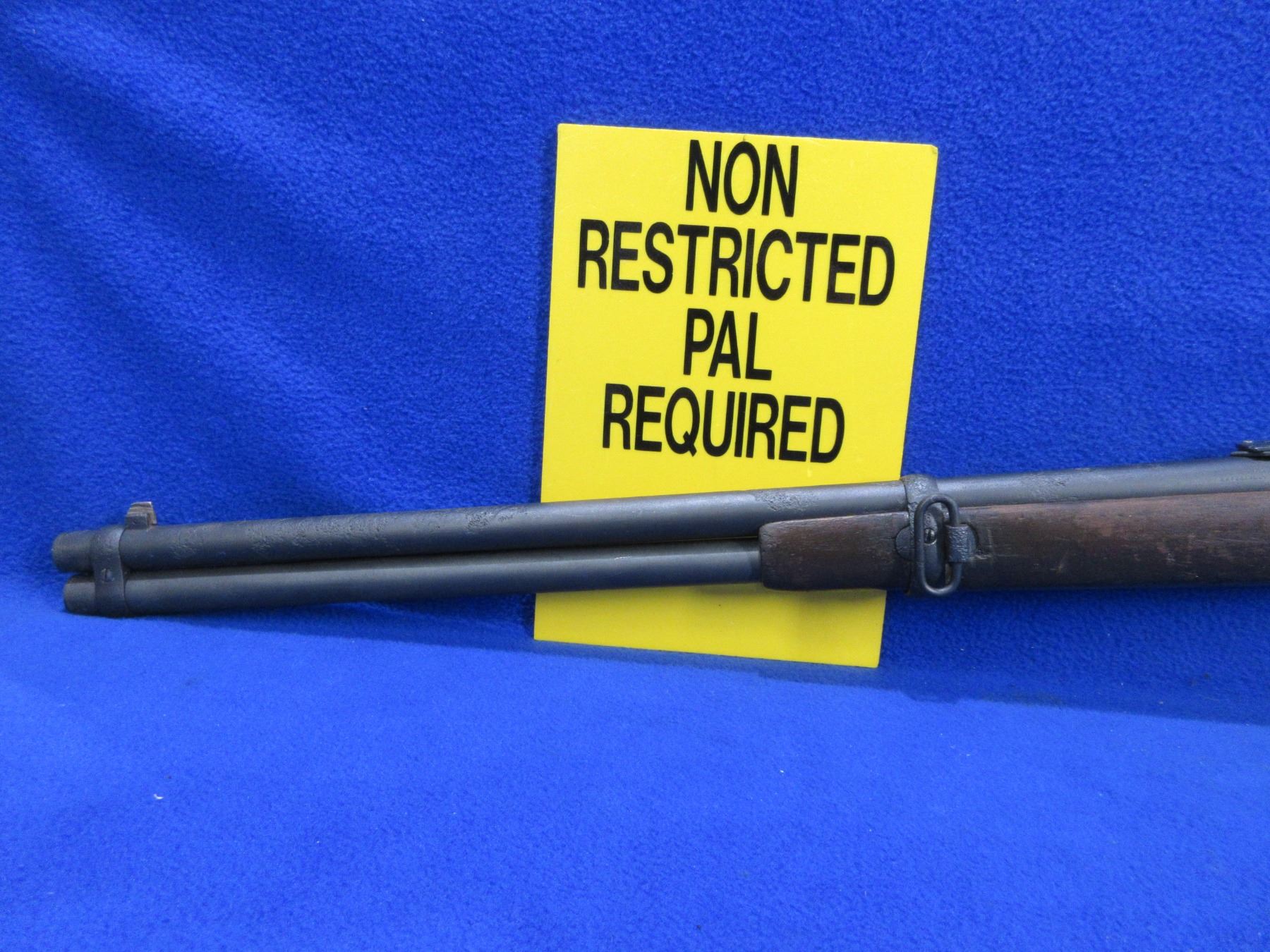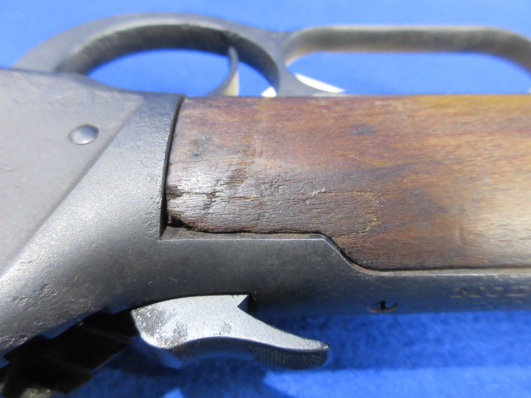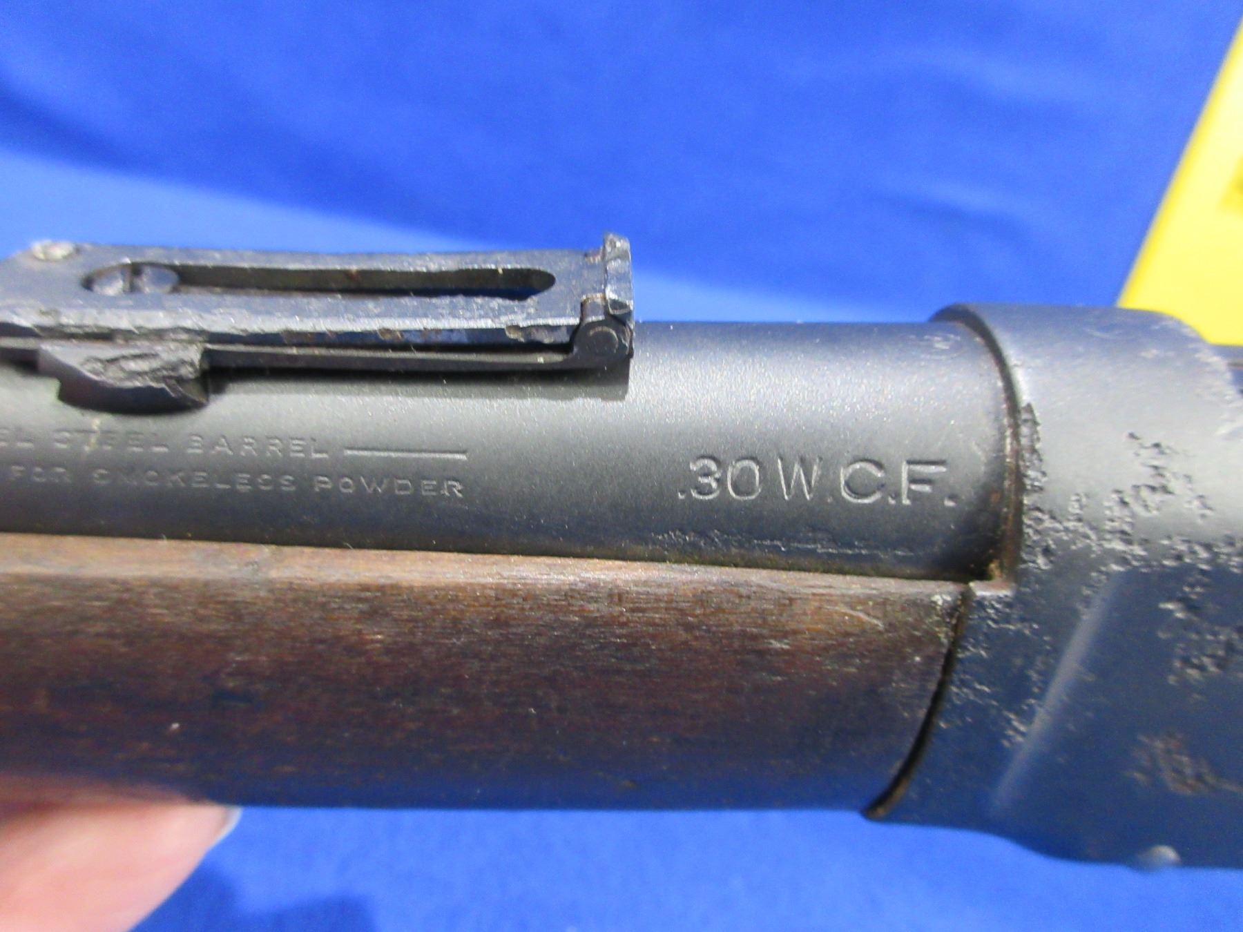 Non-Restricted - Winchester Model 1894 in 30 WCF Belgian Congo or French Contract - Made in 1913, this lever action rifle with tube magazine appears to be in fair to good working order. Barrel is 20", rifling is good, barrel has been reblued over pitting, has both sights but rear sight is missing the slide, stock has a chip on the right side of the upper tang that has been glued back in, forearm has many usage marks and appears painted, metal crescent butt plate is broken at the top screw hole, saddle ring is missing, comes with side swivels . Ser #687128