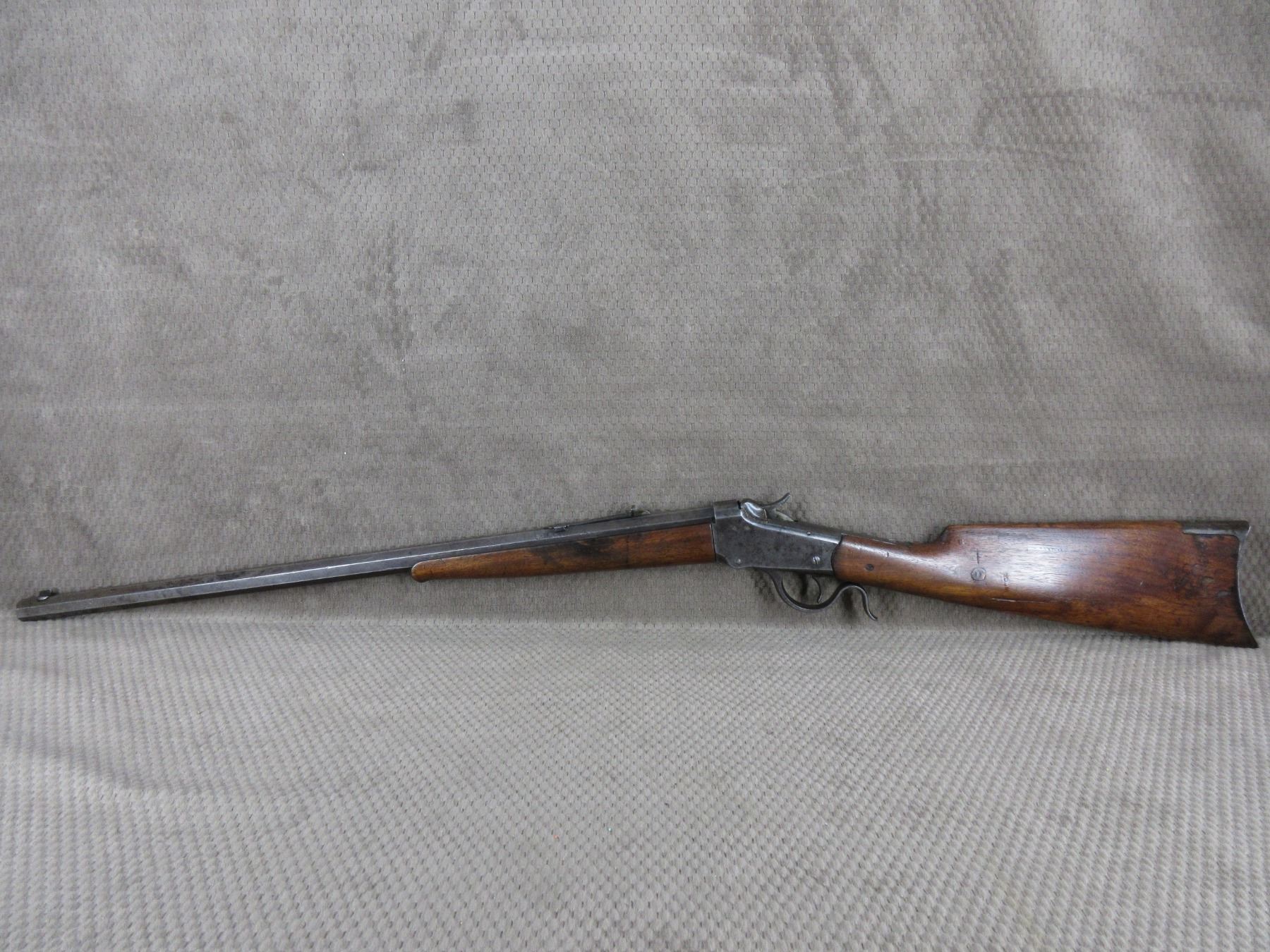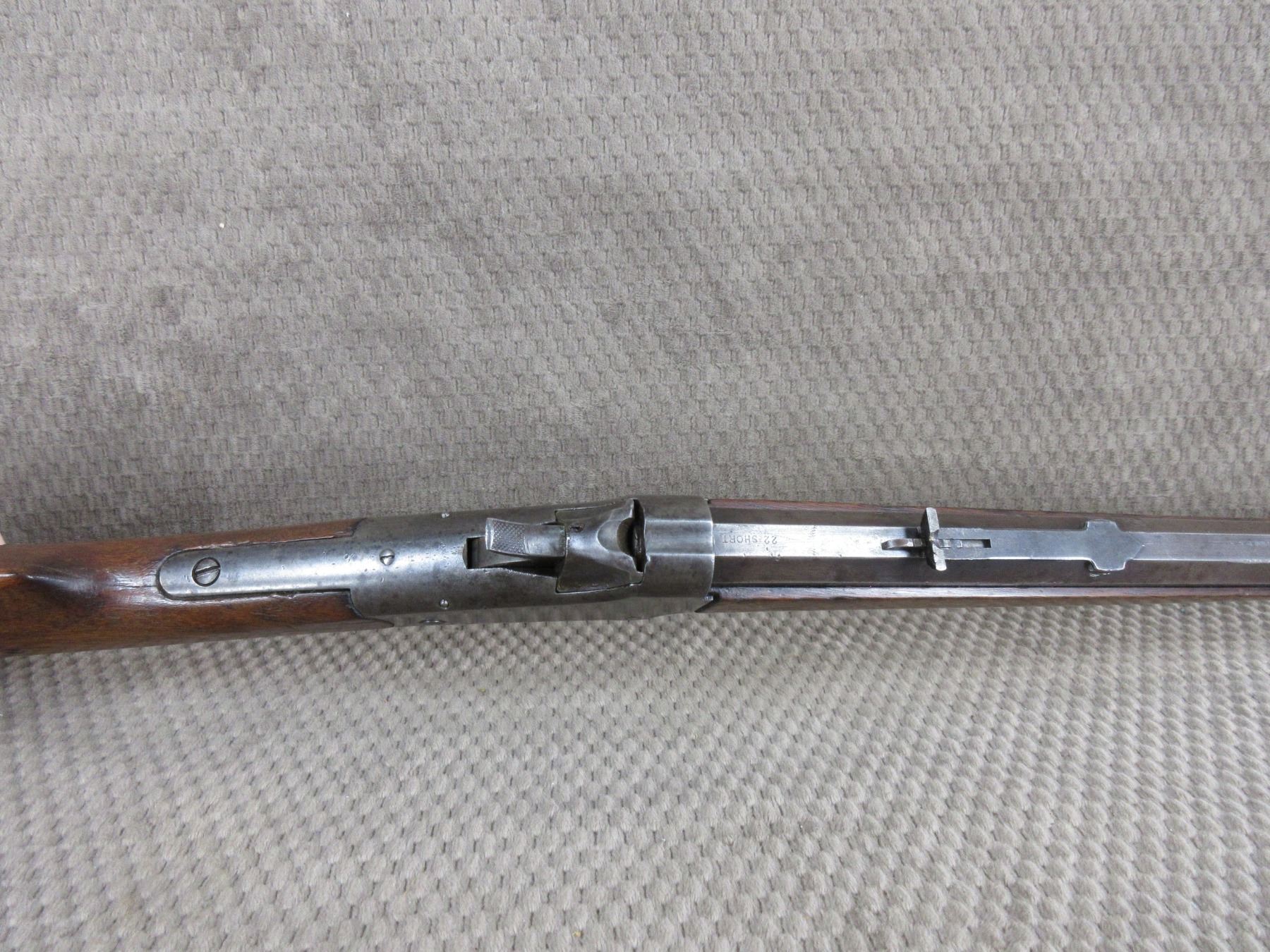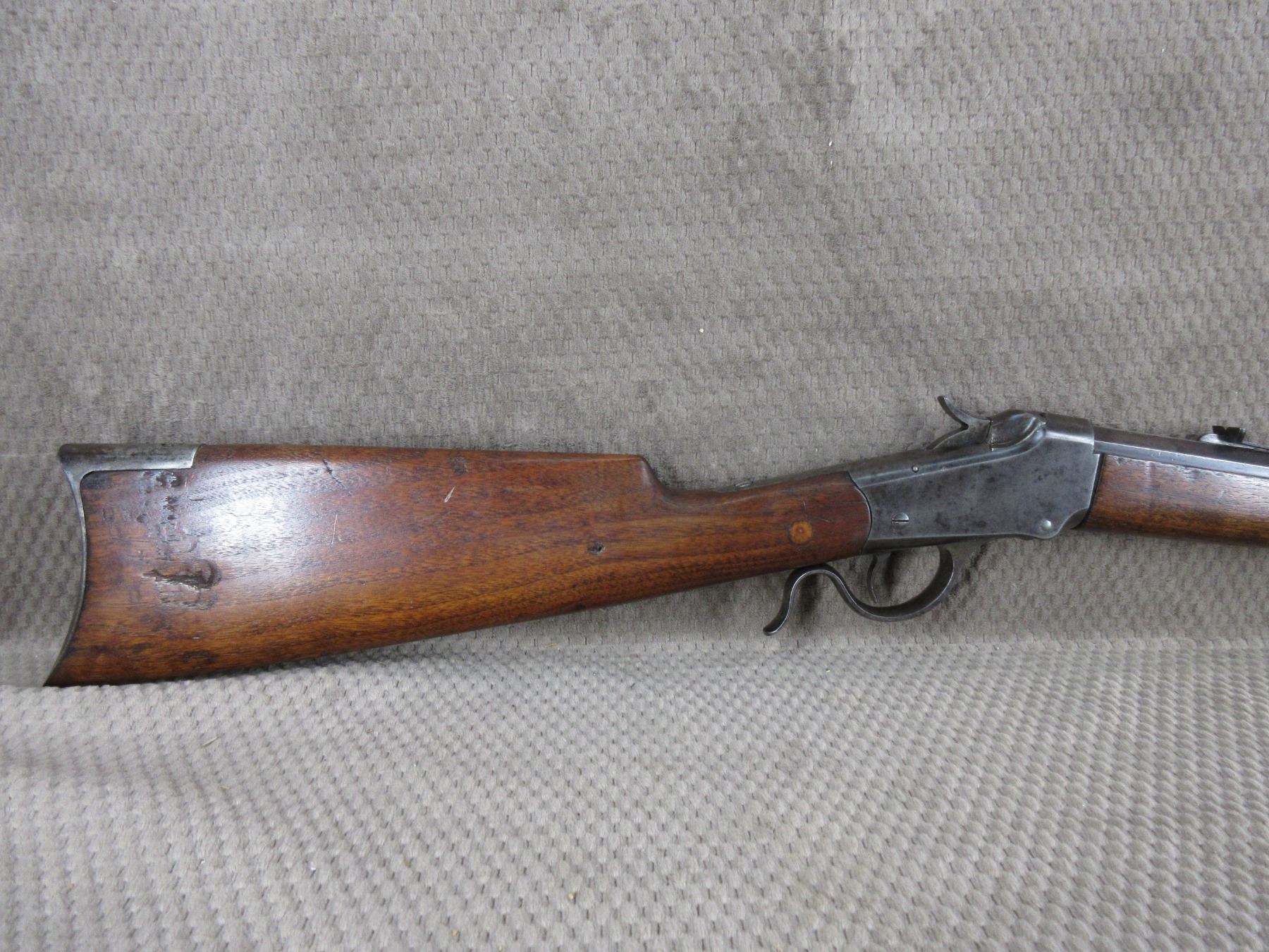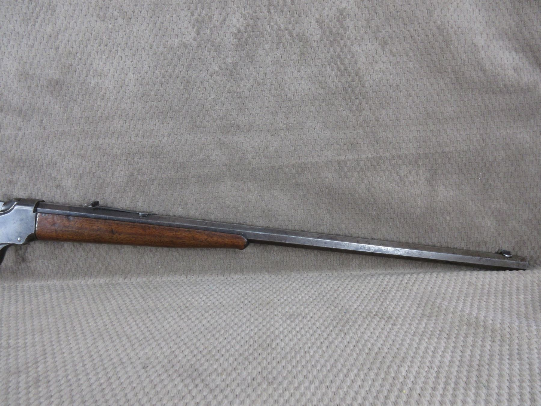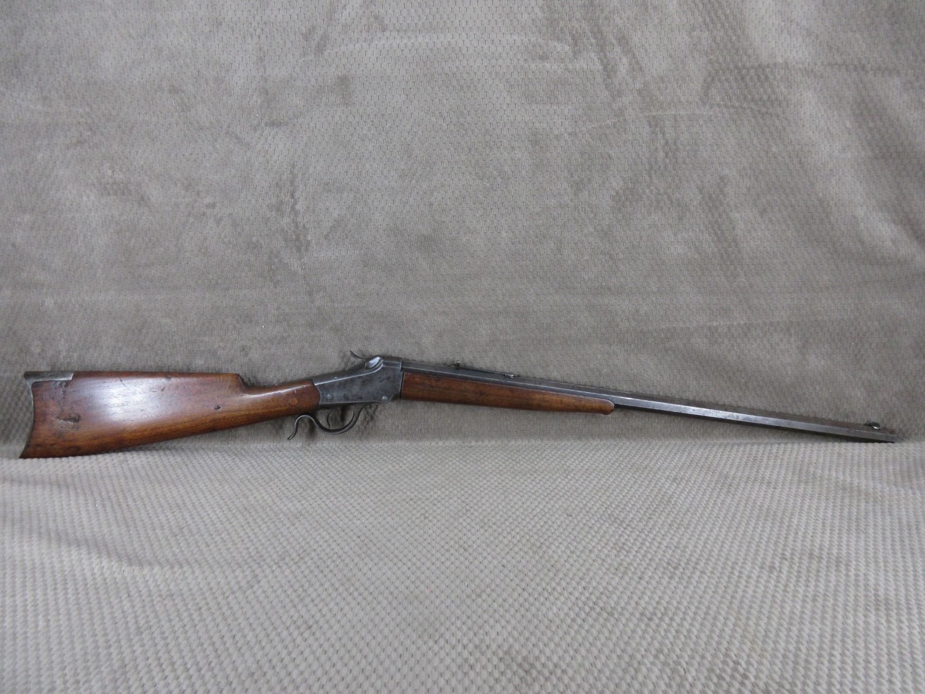 Non-Restricted - Winchester 1885 Low Wall in 22 Short - This single shot rifle appears to be in good working order. Barrel 24 1/4", rifling is fair, bluing mostly gone, has both sights, stock has been repaired and pinned, forearm is good with usage mark, cresent metal butt plate.