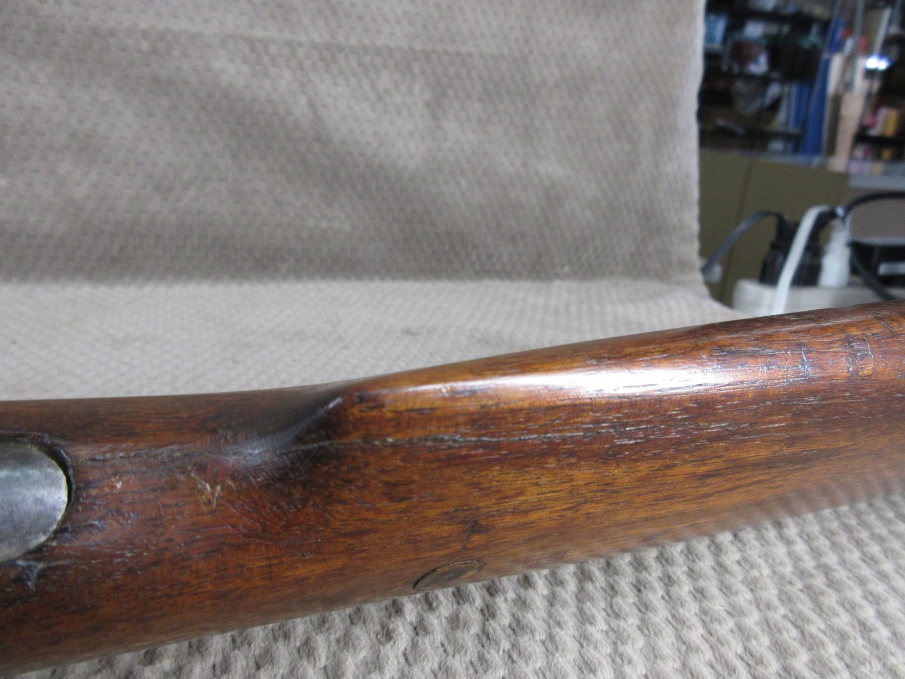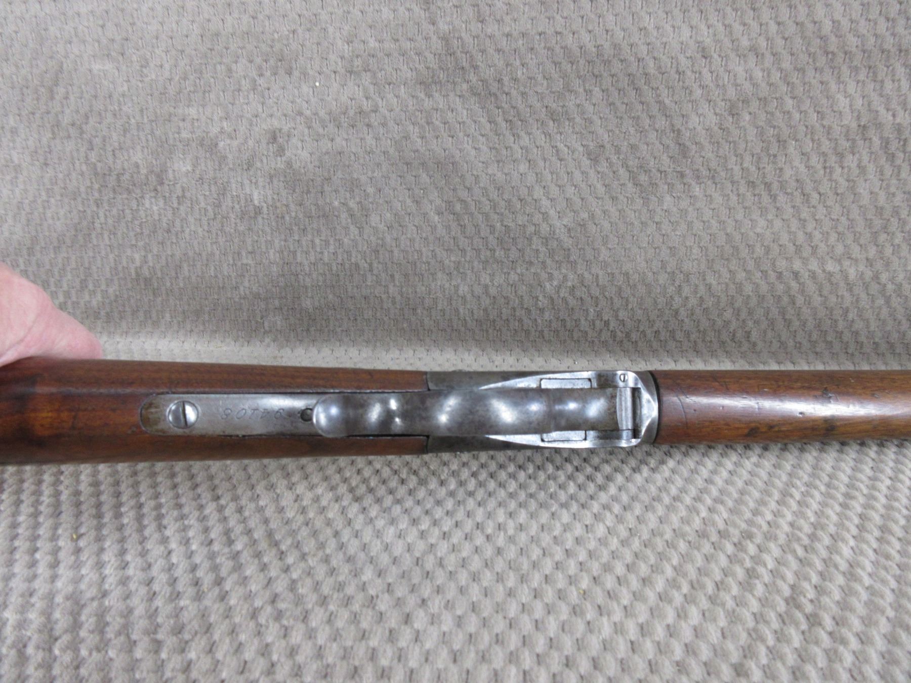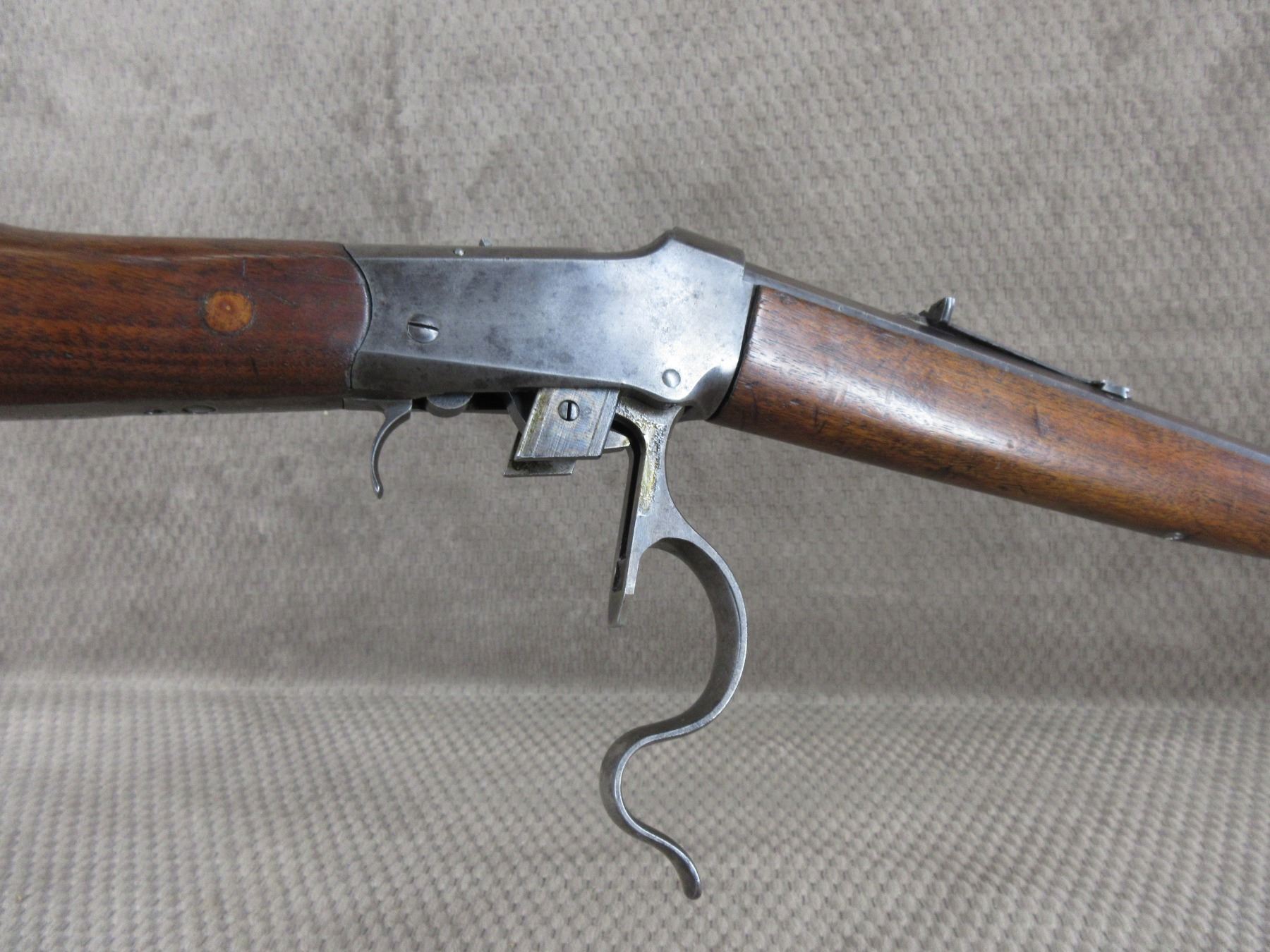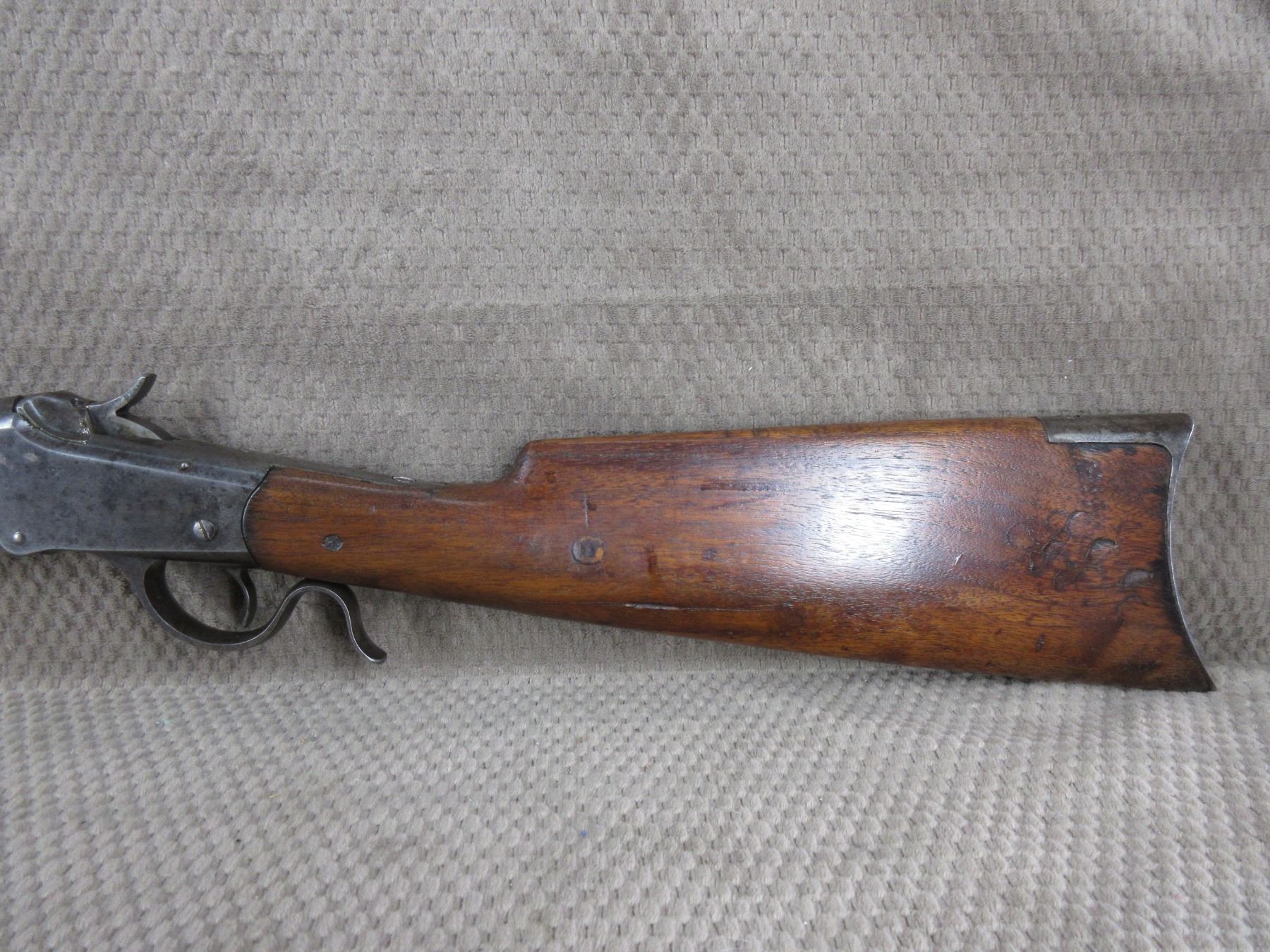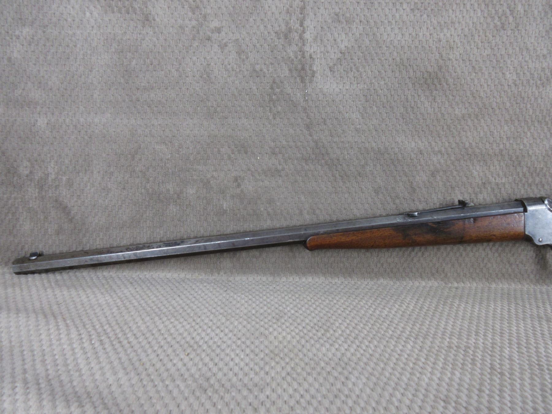Non-Restricted - Winchester 1885 Low Wall in 22 Short - This single shot rifle appears to be in good working order. Barrel 24 1/4", rifling is fair, bluing mostly gone, has both sights, stock has been repaired and pinned, forearm is good with usage mark, cresent metal butt plate.