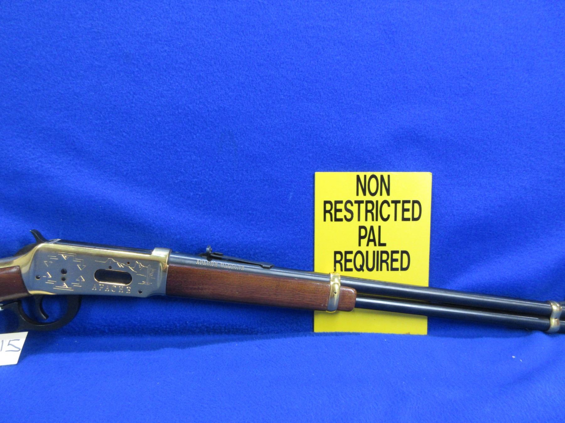 Non-Restricted - Winchester 94 Apache Saddle Ring Carbine in 30-30 - This lever action rifle with tube magazine appears to be in very good working order. Barrel is 20", rifling is very good, bluing is very good, engraved gold colored action very good, has both sights, stock and forearm are good to very good, metal crescent butt plate good. Ser #AC9688