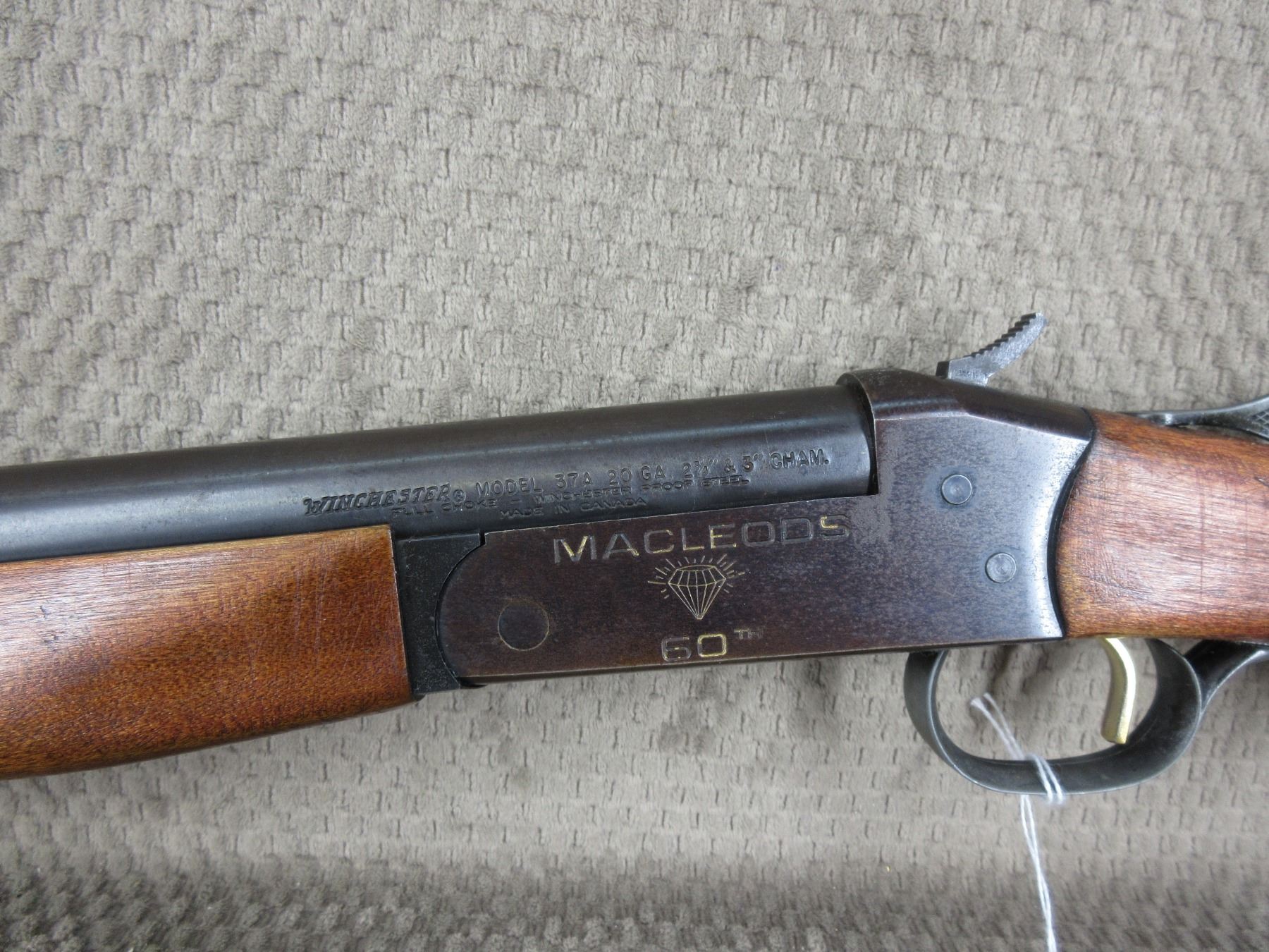 Non-Restricted - Winchester Cooey Model 37A in 20 Ga. 3". - This Macleods 60th aniversery. single shot, tip barrel shotgun appears be in good working order. Barrel is 28", bore is very good, bluing faded and light pitting, has front bead, stock is good has been refinished and has usage marks.