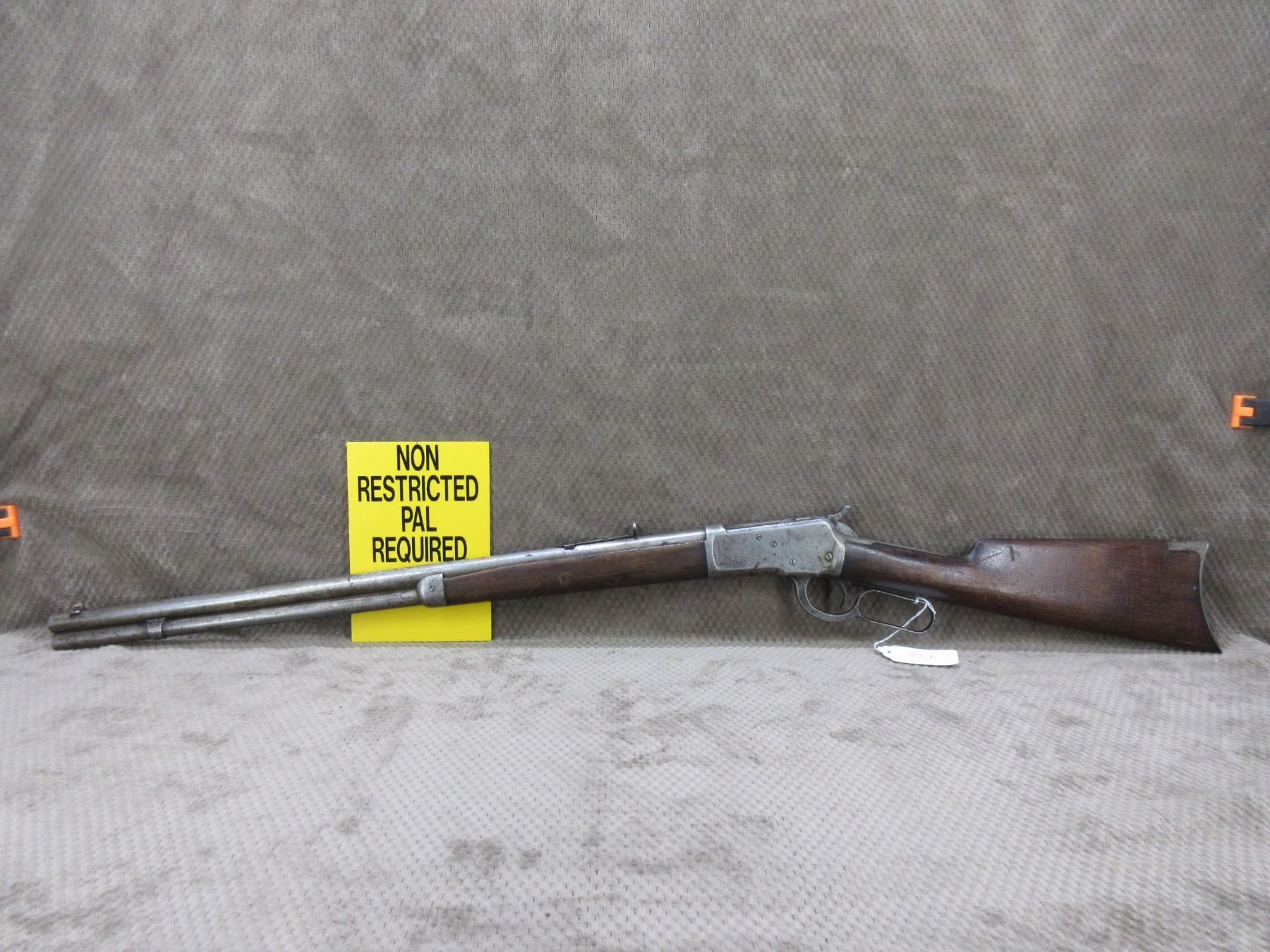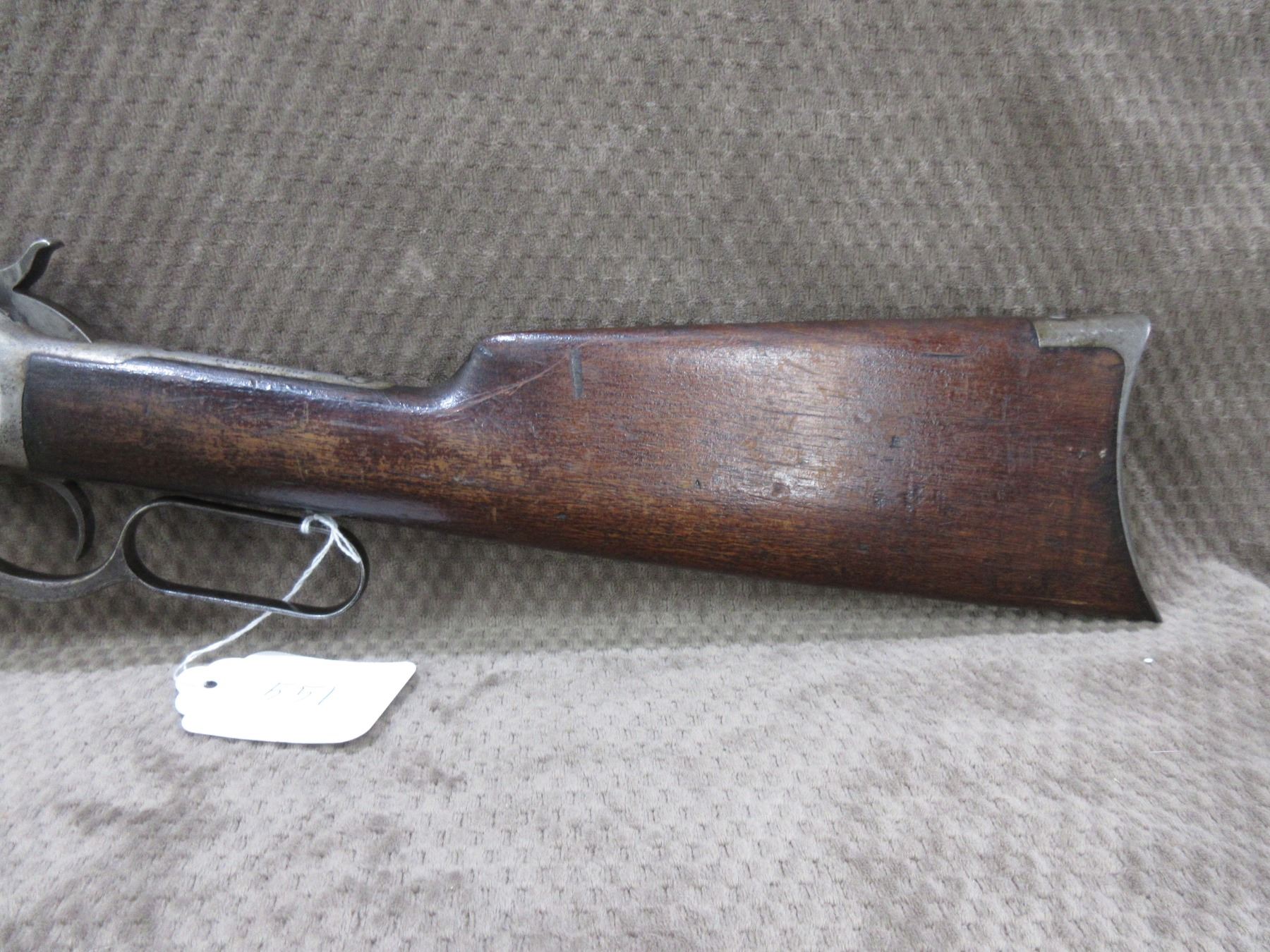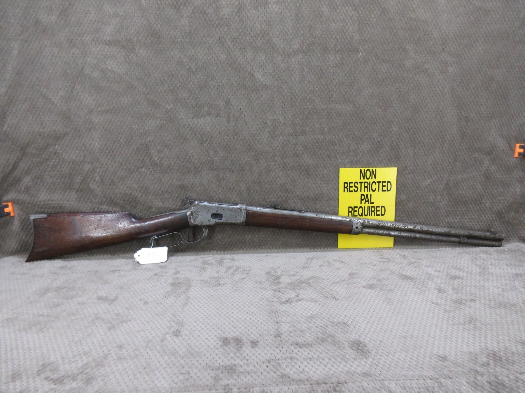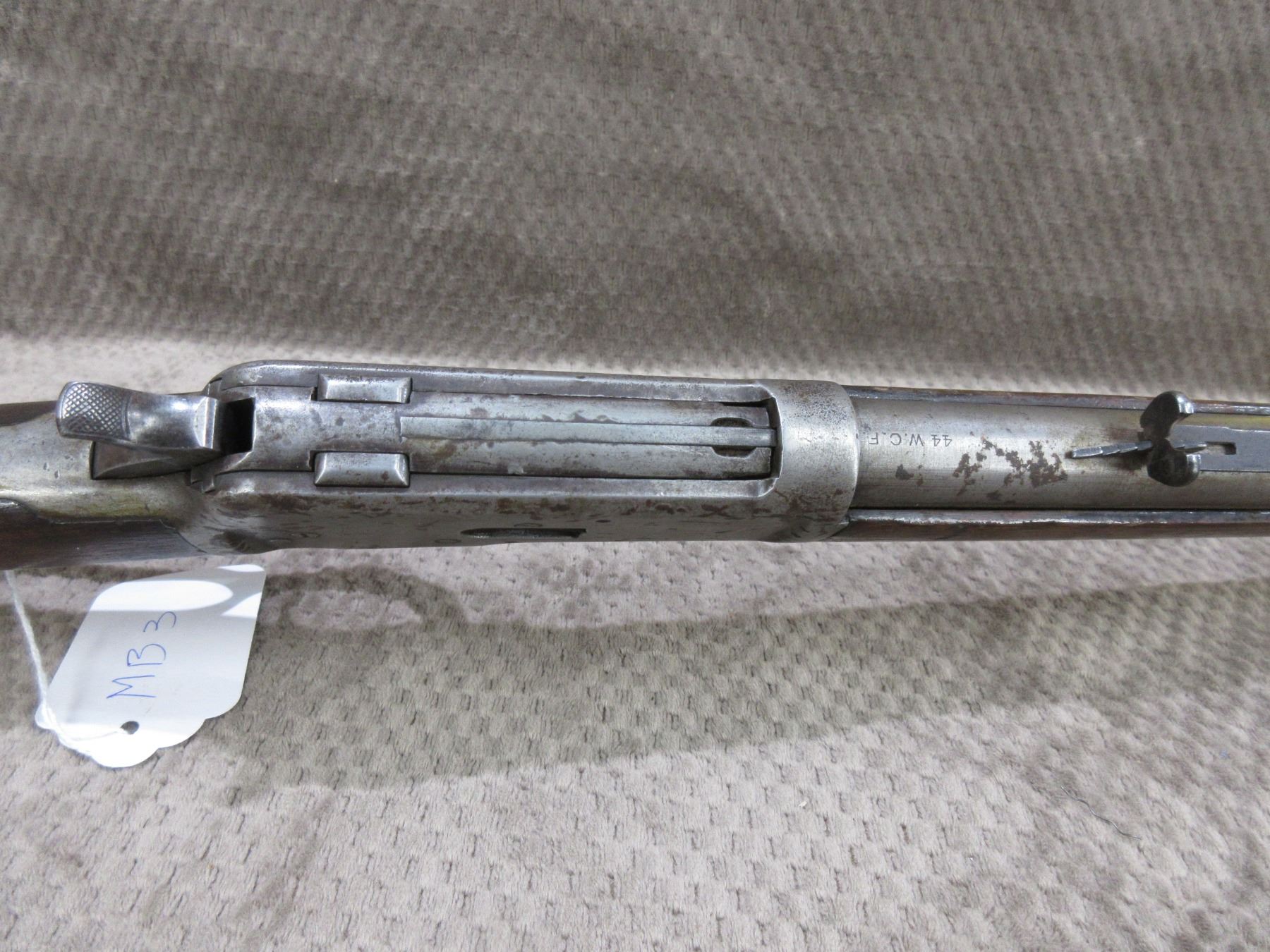 Non-Restricted - Winchester Model 1892 in 44 WCF (44-40) - This lever-action rifle with tube magazine was made in 1897 and appears to be in good working order. Round barrel is 24", bluing is mostly gone and has many pits and marks, rifling is approx. 60% as it has pitting, has both sights, stock has many usage marks, forearm has many usage marks and splinter out of one side, missing 1 foretip screw, metal crescent butt plate, Ser # 143993