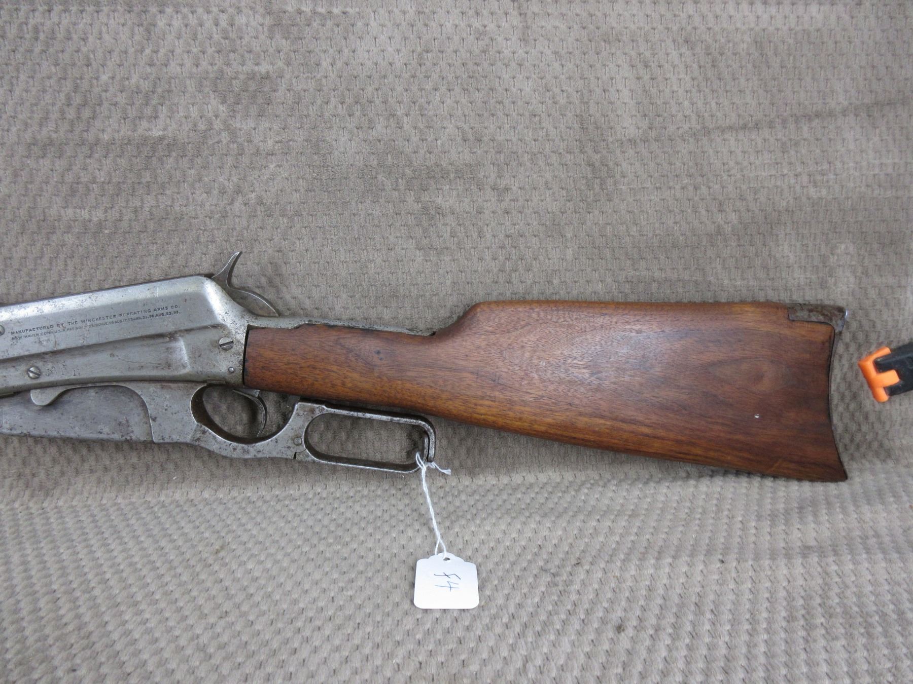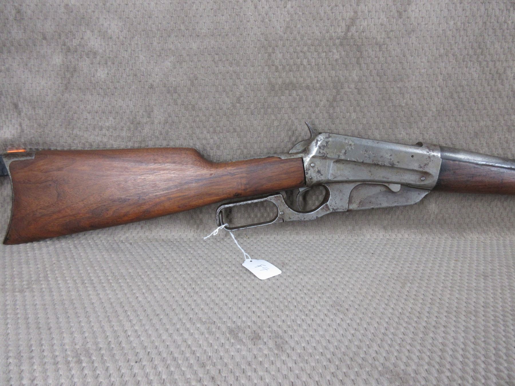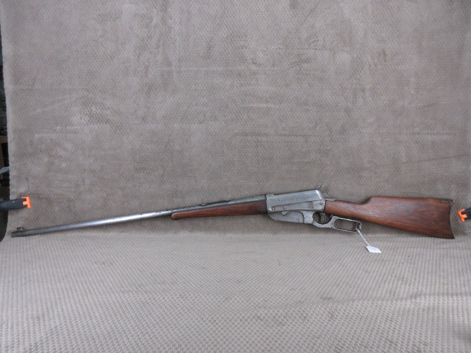 Non-Restricted - Winchester Model 1895 in 30 US - This lever action rifle was made in 1904 and appears to be in working order. Barrel is 28", rifling is good to very good but dark, bluing is gone, has both sights, rear sight modified and ramp missing, stock fitting to action is not tight, stock & forearm are good but feel very rough, cresent butt plate. The name John has been stamped on both sides of the action and the barrel.