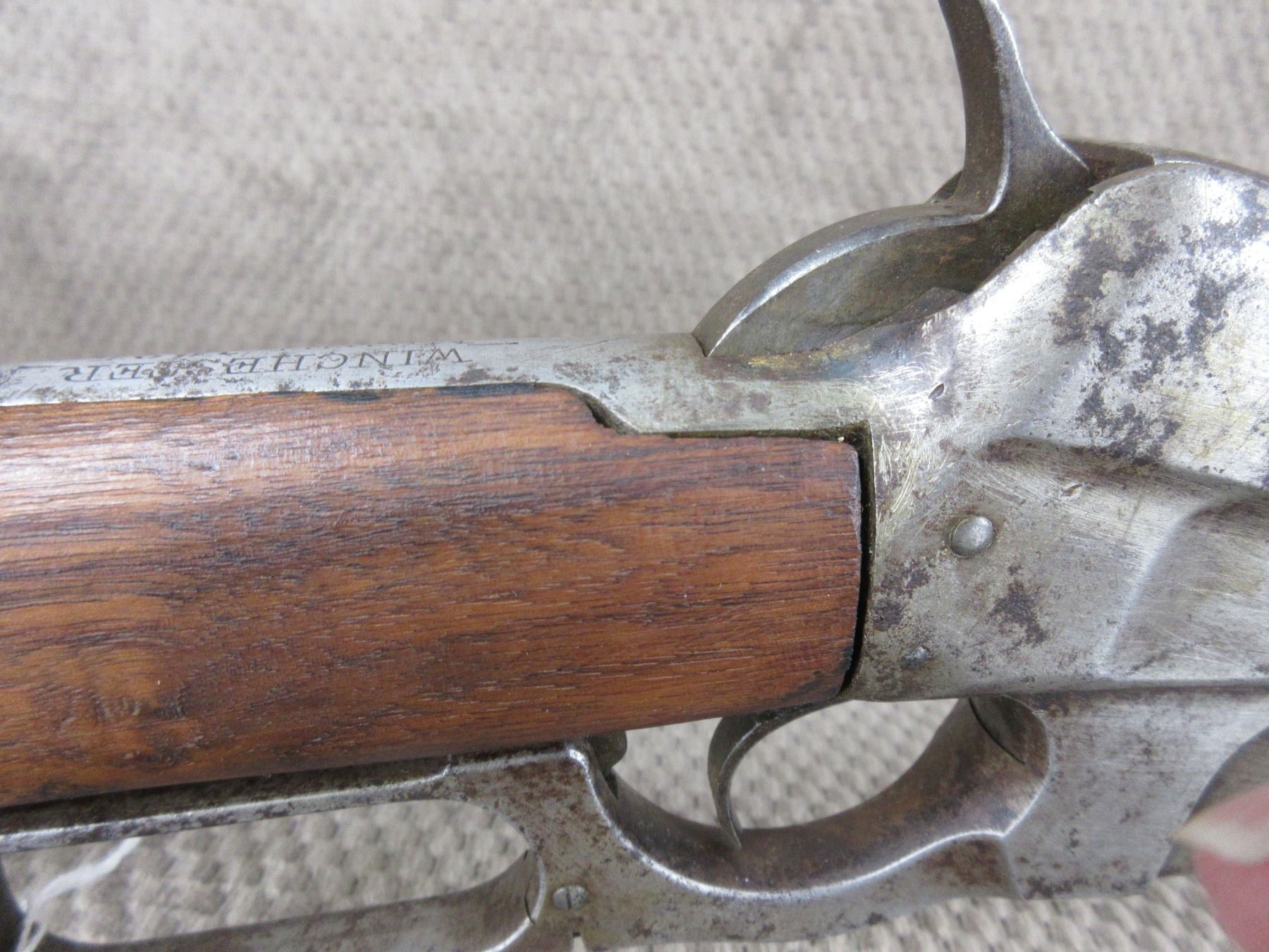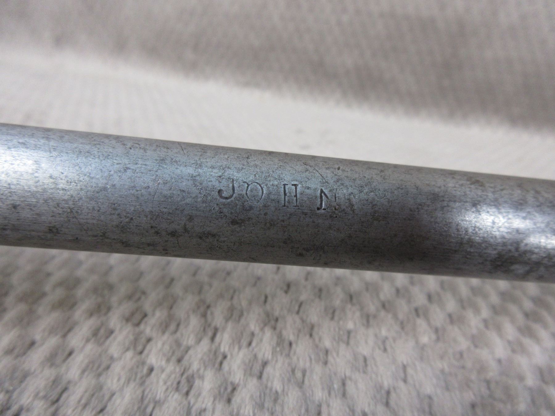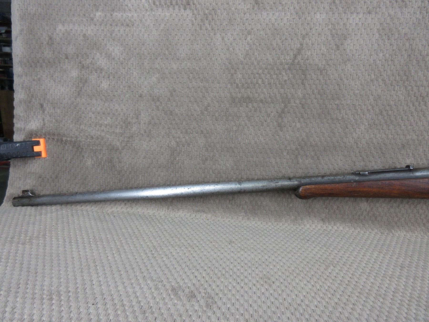 Non-Restricted - Winchester Model 1895 in 30 US - This lever action rifle was made in 1904 and appears to be in working order. Barrel is 28", rifling is good to very good but dark, bluing is gone, has both sights, rear sight modified and ramp missing, stock fitting to action is not tight, stock & forearm are good but feel very rough, cresent butt plate. The name John has been stamped on both sides of the action and the barrel.