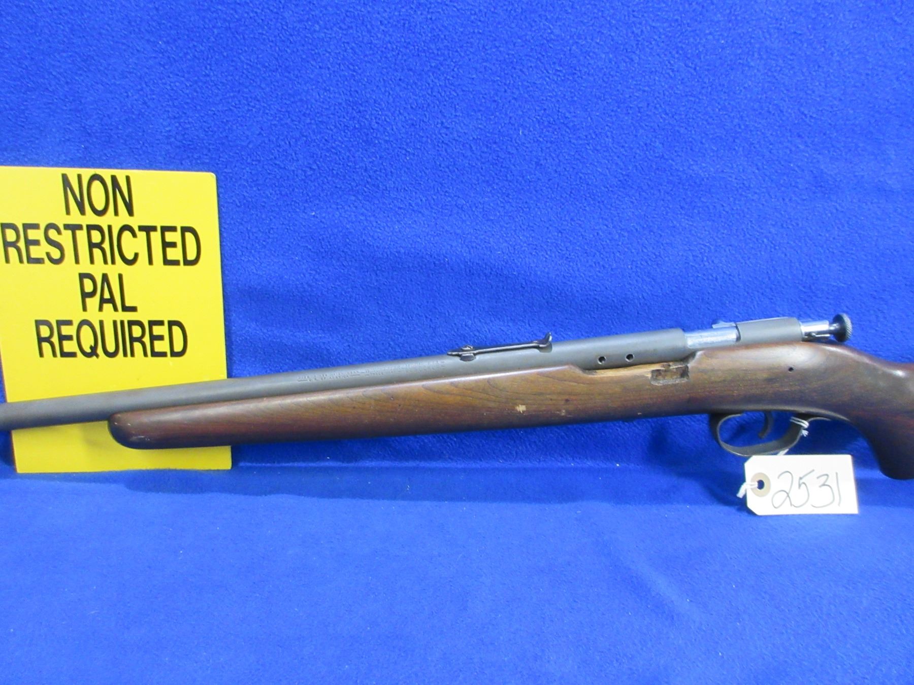 Non-Restricted - Winchester Model 67 in 22 LR - This is a single shot bolt action rifle, action appears to be in good to very good working order. Barrel is 25 1/2", rifling is good to very good but barrel may need recrowning, bluing is grey, has both sights but front sight appears blade broken off and rear missing adjusting screw and is drilled and tapped for side mount peep sight?, stock is good but has been midified to fit peep sight, butt plate good. Ser # None