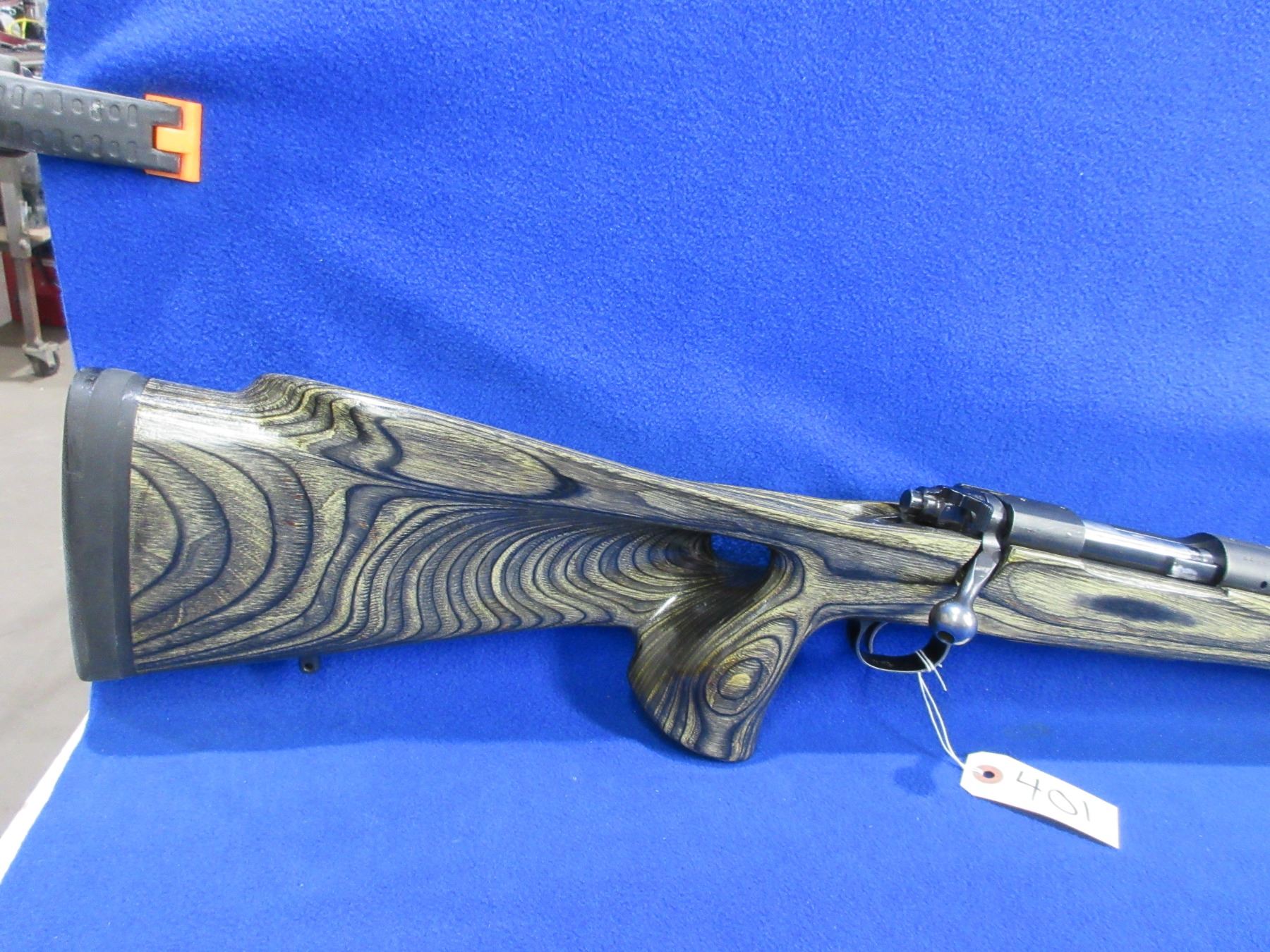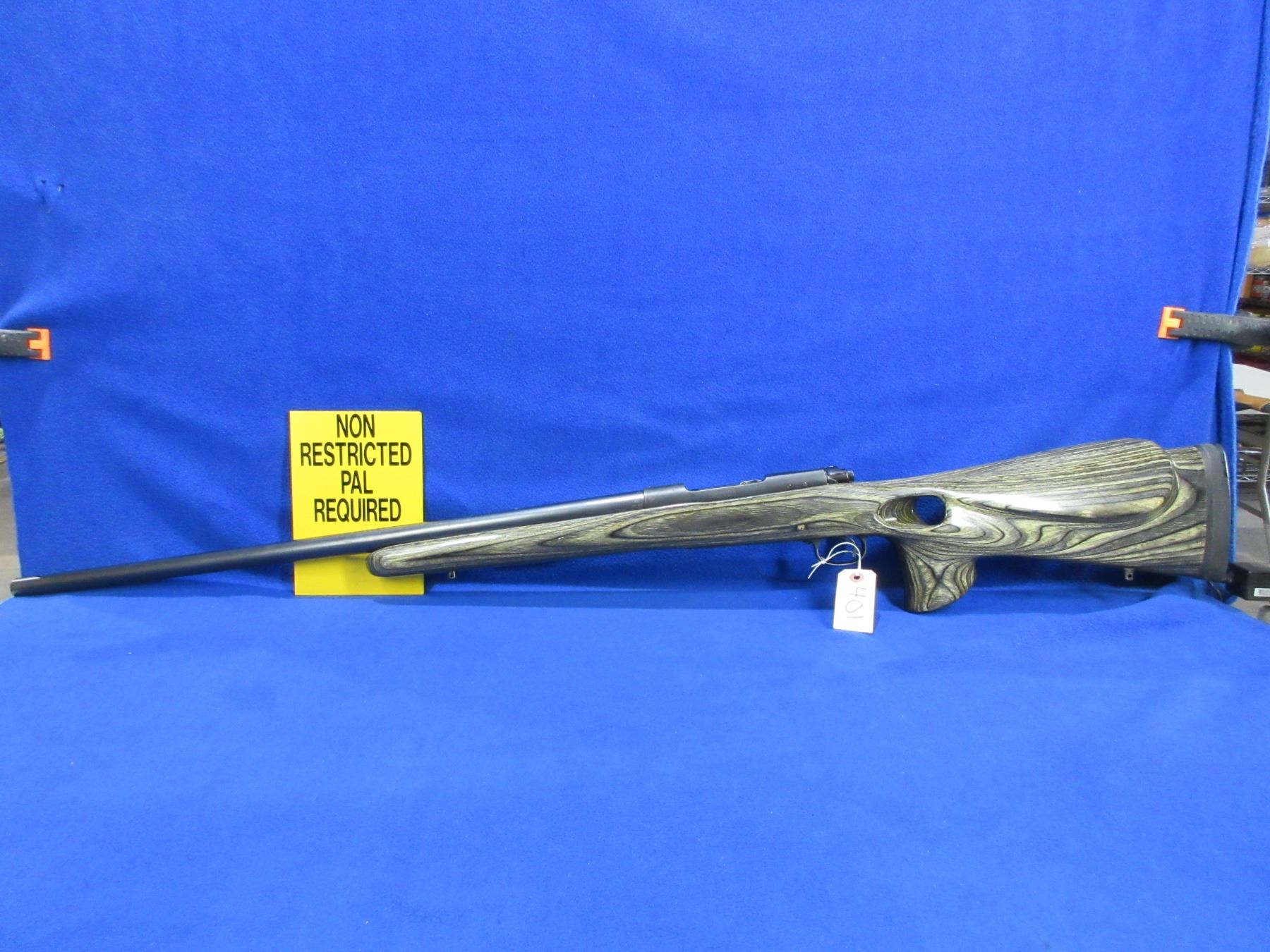 Non-Restricted -Winchester Model 70 Pre 64 in 243 Win. - This bolt action rifle with floorplate magazine appears to be in good to very good working order. Heavy barrel is 26", rifling is very good, bluing is good to very good, sights are missing but is drilled and tapped, right hand laminated thumbhole stock is good to very good and glass bedded, rubber recoil pad good, comes with swivel studs. Ser #449879