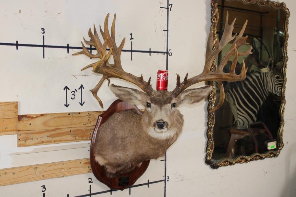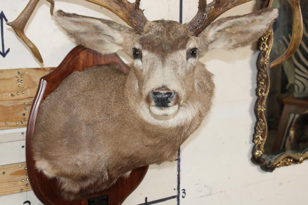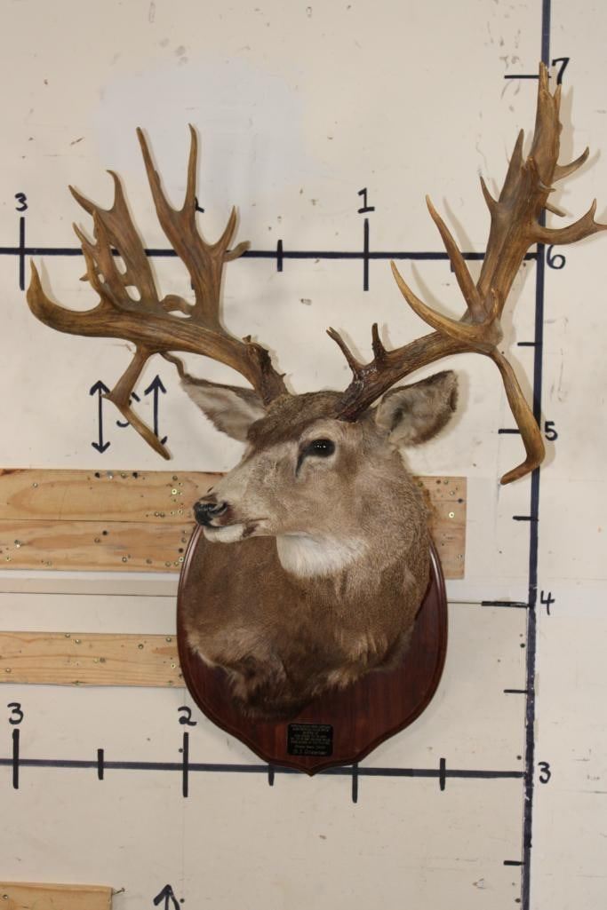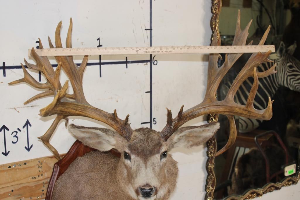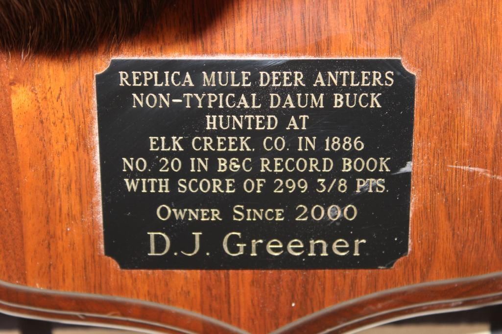 36-Point Non-Typical MULE Deer Shoulder Mount with Reproduction antlers and a 41" spread on a Wooden Plaque. This mount's horns are modeled after the Non-Typical Daum Buck Hunted at Elk Creek, Colorado in 1886 that is No. 20 in the Boone and Crockett Record Book. It has a score of 299 3/8 Points. COLLECTIBLE TAXIDERMY