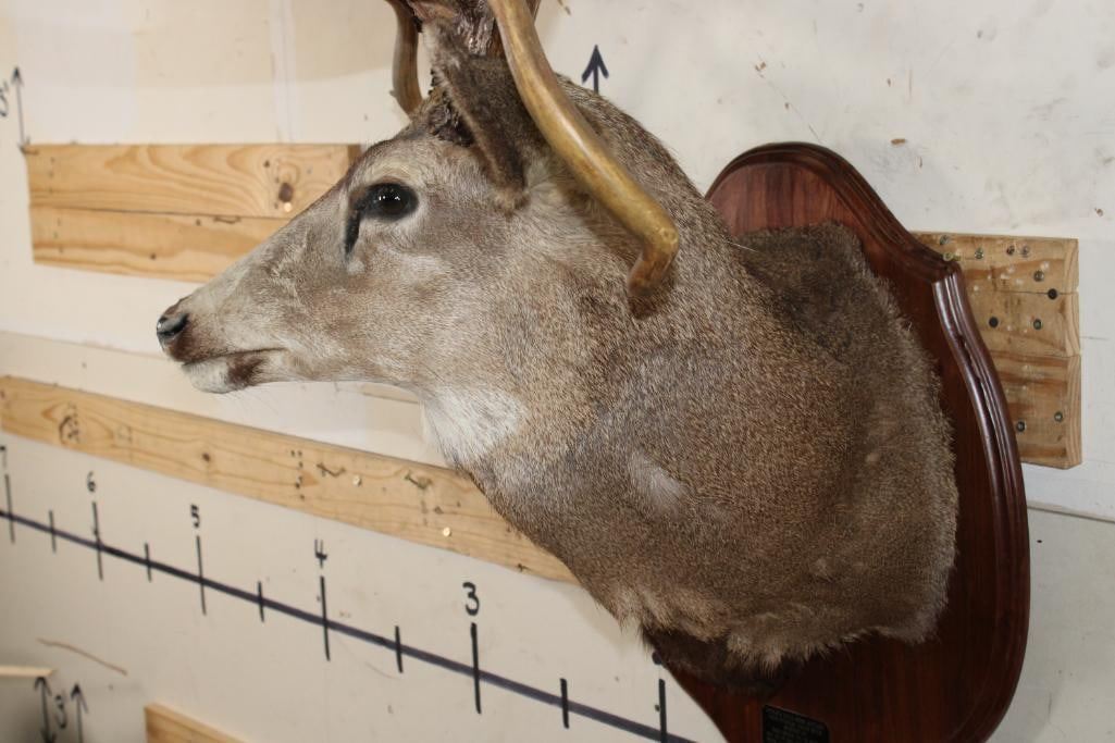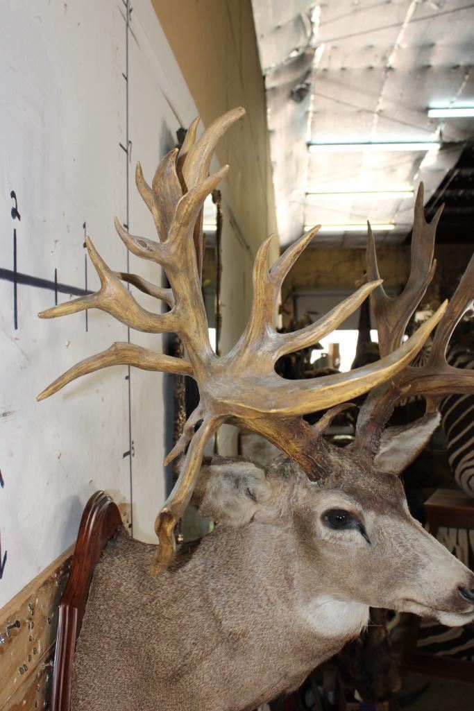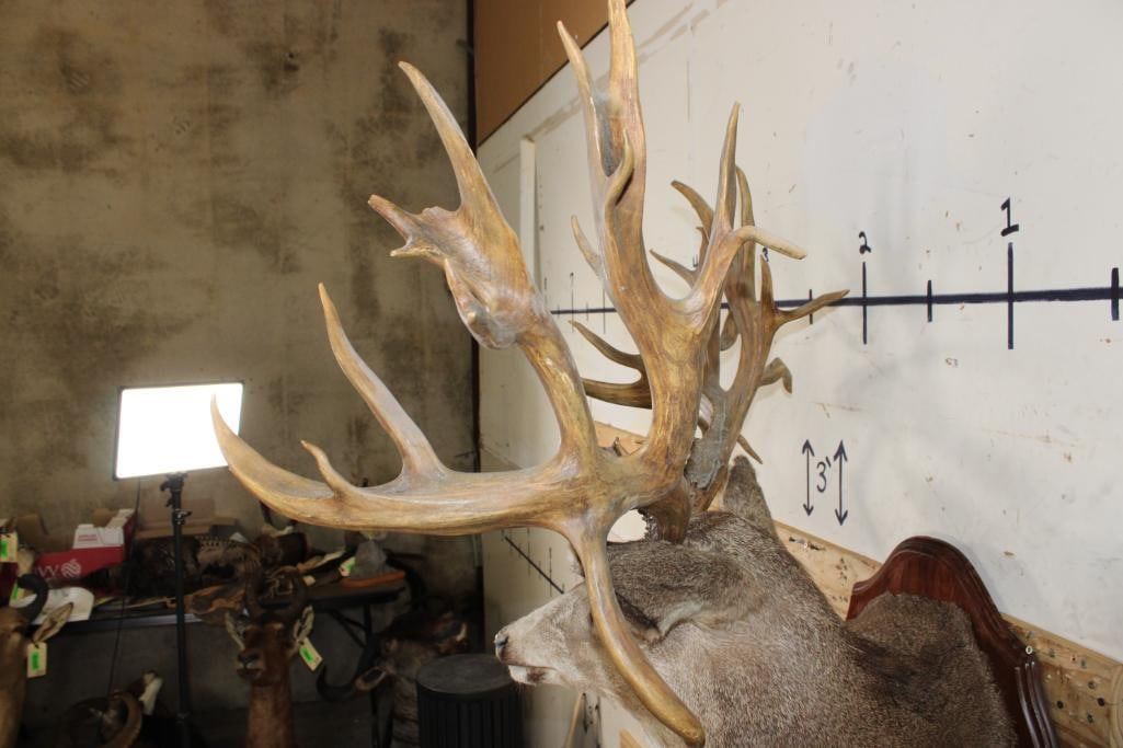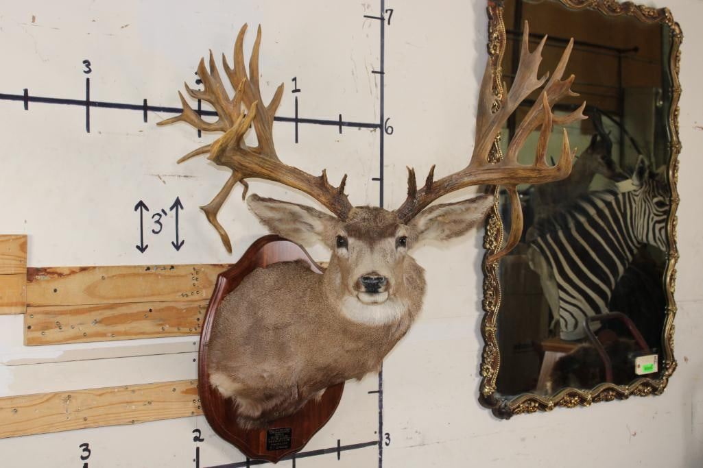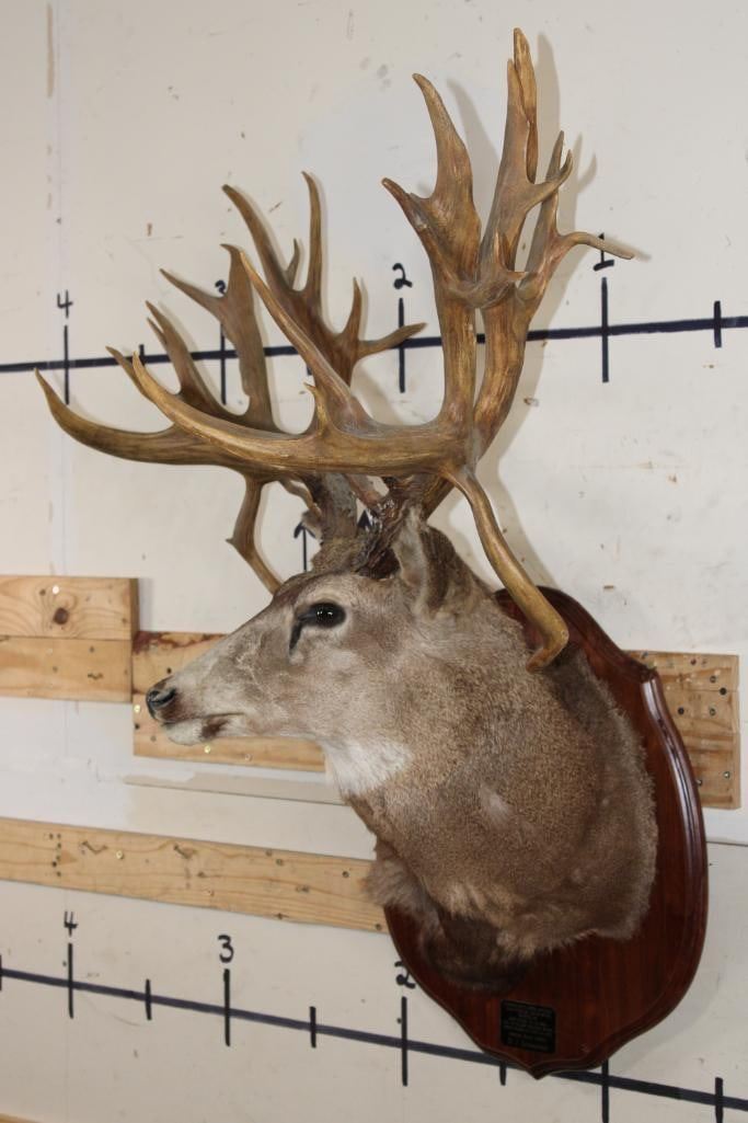 36-Point Non-Typical MULE Deer Shoulder Mount with Reproduction antlers and a 41" spread on a Wooden Plaque. This mount's horns are modeled after the Non-Typical Daum Buck Hunted at Elk Creek, Colorado in 1886 that is No. 20 in the Boone and Crockett Record Book. It has a score of 299 3/8 Points. COLLECTIBLE TAXIDERMY