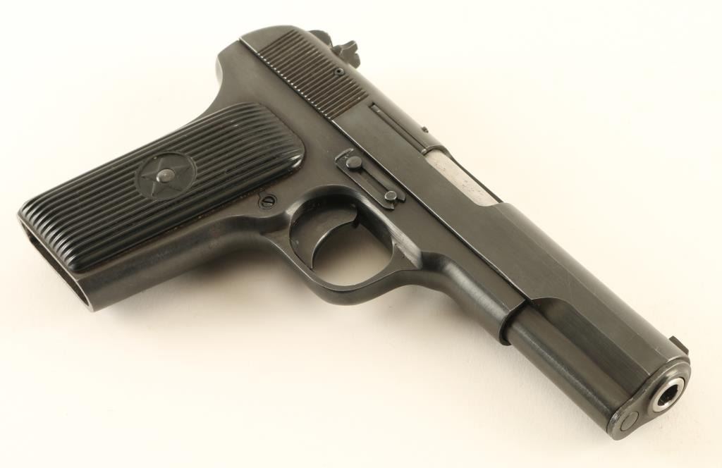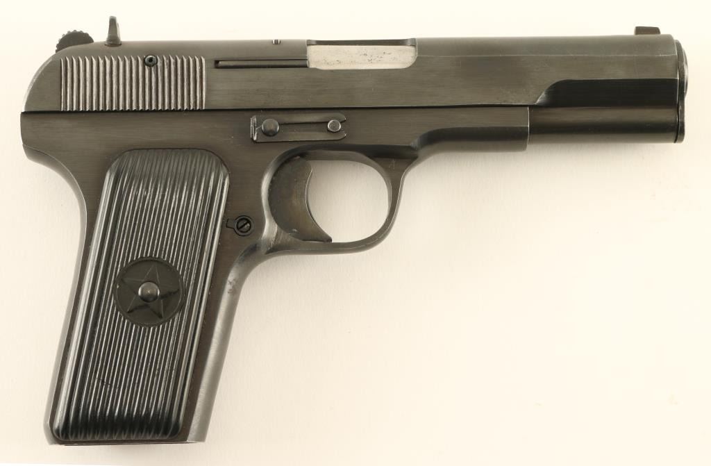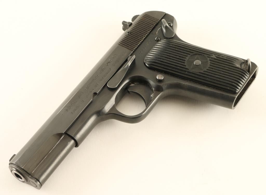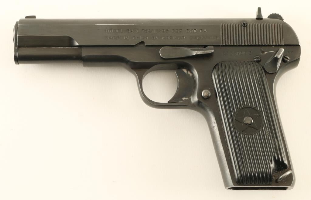 Pistol. Semi-automatic. Single-shot. 8+1 capacity. Chinese manufactured version of the Russian Tokarev. C. 1999 Imported by CSI, Ont., CA., and marked on the left slide. Matched serial numbers. 7.6" overall, with a 4.6" barrel. Front blade, rear notch, fixed sights. Lanyard ring. Frame mounted thumb safety. Blued metal finish, with black plastic, "Star" grips. No magazine. Slide action is smooth/tight. Bore appears excellent/bright, but dusty. Grips are excellent. Blued metal finish is about 98%, with slight edge wear, and a few minor scratches. NRA Condition-Near Excellent. Modern Firearm.