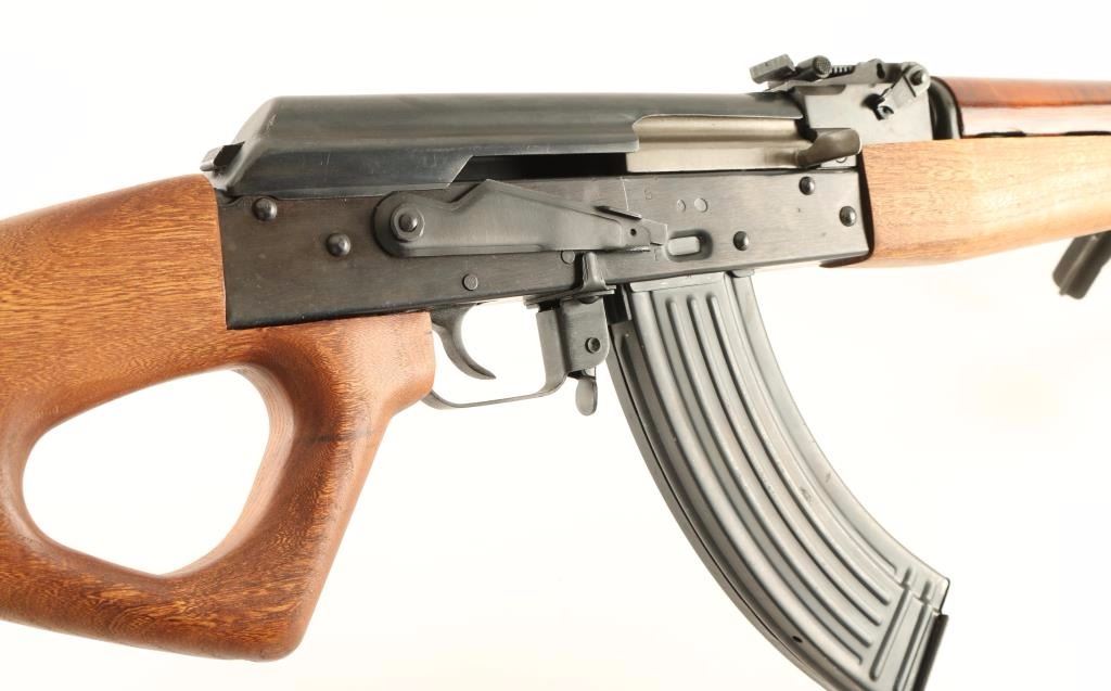 'Pre-ban' Chinese made semi-automatic variant of the RPK light machine gun chambered in 7.62x39mm. Imported by CSI of Ontario, C.A. with import marks on the receiver. Features a blued finish, 21" threaded barrel, thread protector, shrouded post front sight, tangent rear sight graduated to 800 meters, adjustable folding bi-pod, manual safety/dust cover, smooth trigger, and smooth wood handguard, forend & thumbhole pistol grip shoulder stock. Rifle retains approximately 85% of it's original blued finish showing thinning on the sides of the gas block and upper portion of the receiver which exhibits a browning patina. Action is smooth, bore is pristine, are wood stocks are fine. Condition is very good+++. ***Modern Firearm***