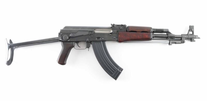 Chinese semiautomatic rifle imported by RAI Co, Woodland Hills CA. Based on AK-47/AKM design. Features blued finish, satin silver colored plated bolt & carrier, 16" threaded barrel with slant muzzle brake installed, cleaning rod, folding spike bayonet, protected post front sight, tangent rear sight, accepts detachable magazines, manual safety, under-folding stock, smooth wood hand guards and pistol grip, sling loop on gas block, sling swivel on receiver rear. Observed numbers match on most parts, bolt numbered "0212". Bore is very good condition, appears hard chrome lined. Retains 95% blue with some thinning finish or bare metal on folding stock, where stock rubs against receiver, on high spots and sharp edges. Wood is very good condition with handling marks. Includes (1) 30 rd magazine. Condition is NRA Very Good++ *** Modern Firearm ***