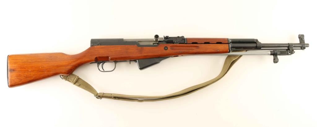 'Triangle 26' Gas operated semi-automatic SKS pattern rifle chambered in 7.62x39mm, manufactured in China for commercial sale in the United States. Imported by P.T.K. Int'l of Atlanta, GA with import marks on the left side of the receiver. Features a blued finish, 20 3/8" barrel, adjustable hooded post front sight, tangent rear sight graduated to 1,000 meters, cleaning rod, under-folding spike bayonet, smooth trigger, manual safety in the rear of the trigger guard, fixed 10 round box magazine, green canvas sling, smooth wood handguard, and semi-pistol grip shoulder stock with finger grooves in the forend & trapdoor metal buttplate containing a cleaning kit. All observed serial numbers are matching. Rifle exhibits approximately 95% of it's original finish showing some thinning and scattered handling marks. Action is smooth, the bore is pristine and wood stocks are near fine. Condition is near NRA Excellent. ***Modern Firearm***