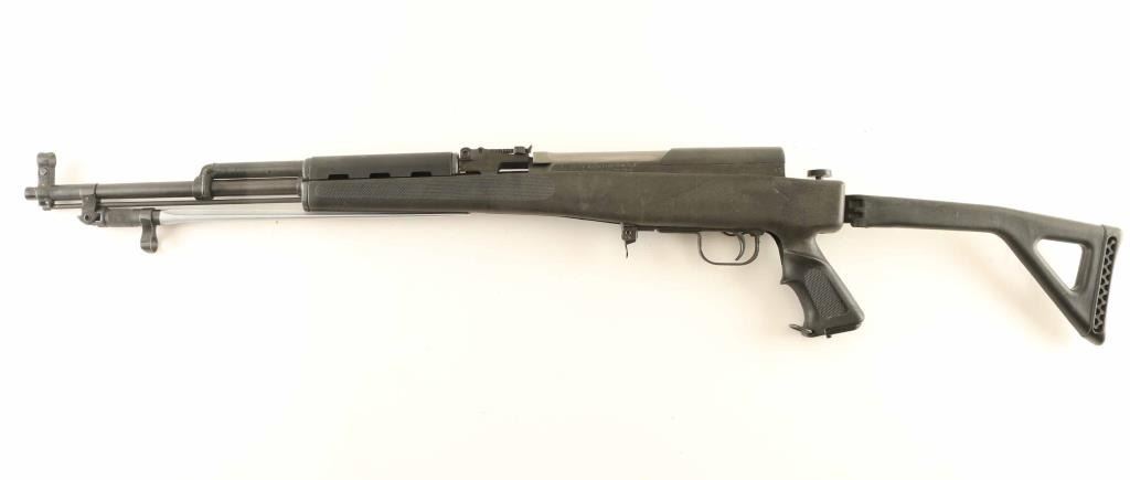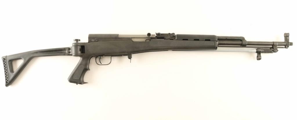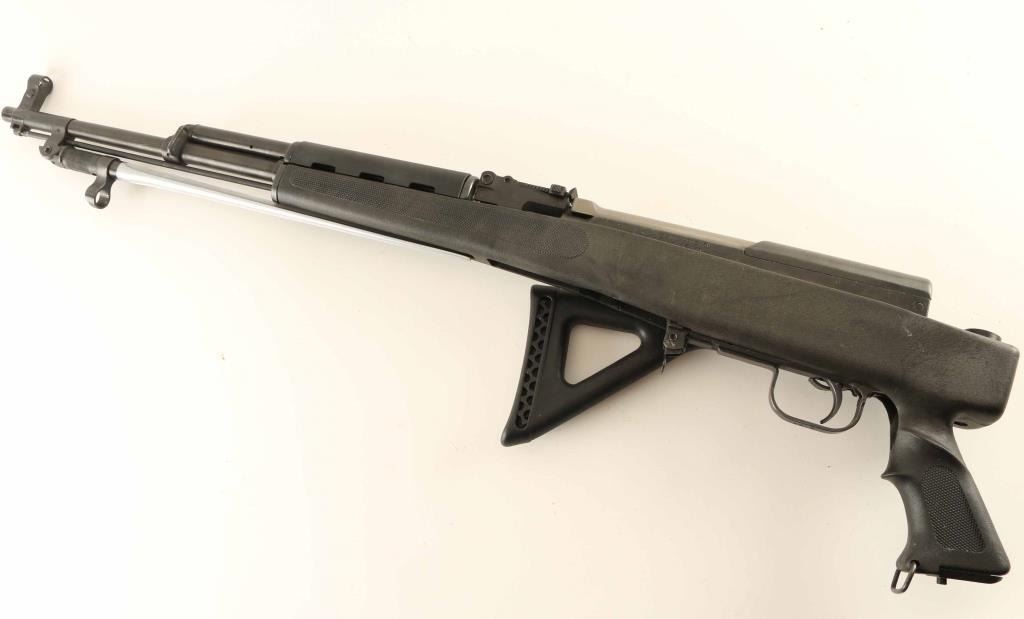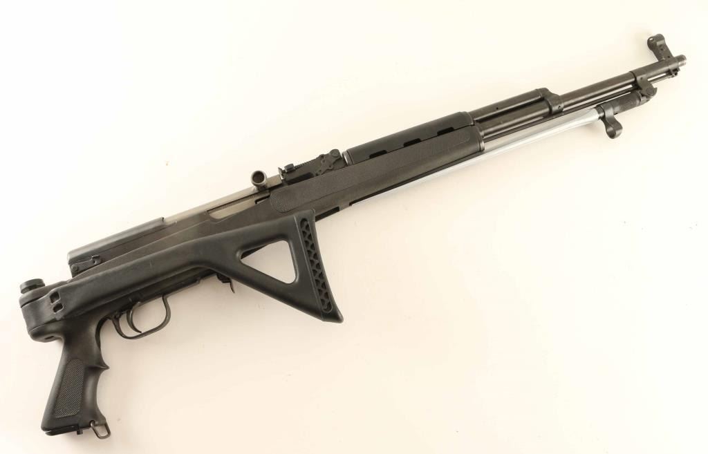 Rifle. semi-automatic. Made in China by Norinco. C. 1988 Imported by Beta, LA, Ca, Marked on left receiver. (Under stock) 20" barrel, with hooded, elevation adjustable, front sight post. tangent rear sights. Cleaning rod present. Thumb safety in triggerguard. 12" spike fold-up spike bayonet is detachable. Takes AK Mags. Blued metal finish. Mounted on an incorrect black synthetic, pistol grip, side folding triangle stock. No magazine is present. Action is smooth/tight. Bore appears excellent/bright. Stock is very good. Blued metal finish is about 98%, with some minor scratches. NRA Condition-Good (Incorrect stock, Missing mag) Modern Firearm.