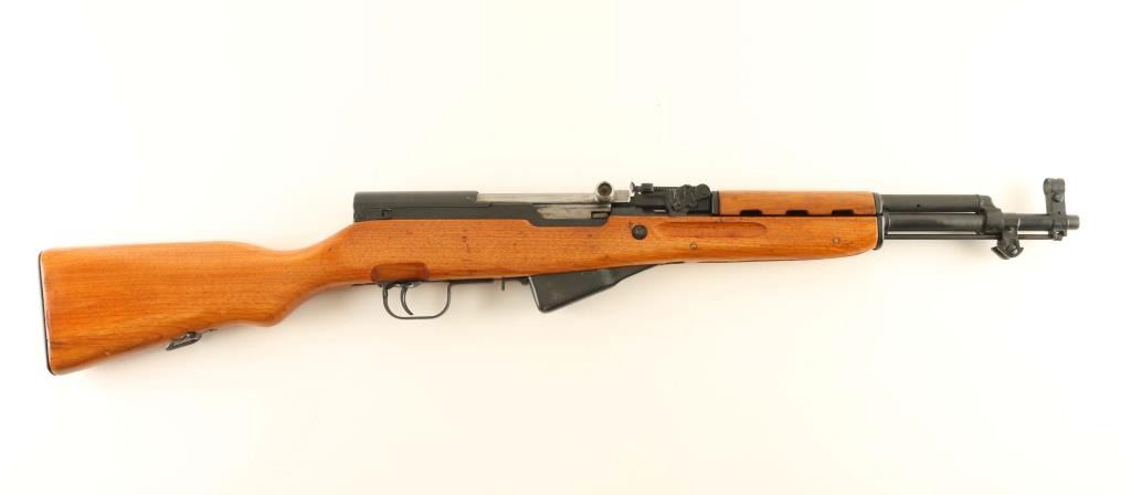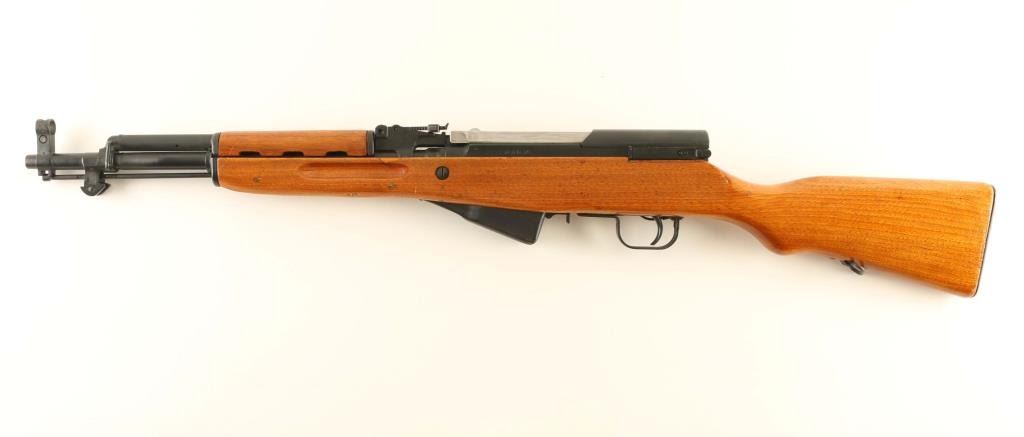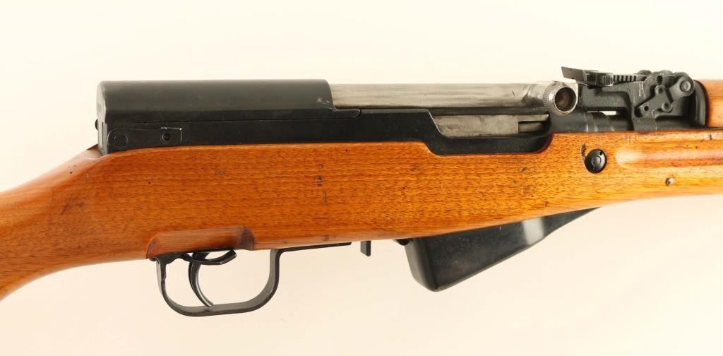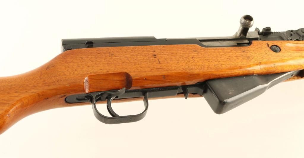 Chinese semiautomatic rifle, imported by Navy Arms, Ridgefield NJ. Features approx 16.5" barrel, bracket for folding spike bayonet (bayonet not present), cleaning rod under barrel, military sights, fixed 10 round magazine with hinged floorplate, manual safety, sling swivels, scope mount dovetail on left side of receiver (scope not included). Bore is excellent condition. Metal retains 90% dark even bluing, some scrapes and scuffs. Stock is very good condition with some small dents, scratches, gouge at forend. All observed numbers match. Includes cleaning kit inside butt trap. Rear sight spring installed upside-down, allowing sight to mover freely, needs to be re-installed correctly. Condition is NRA Very Good *** Modern Firearm ***