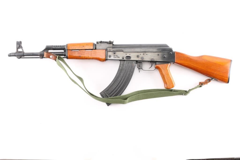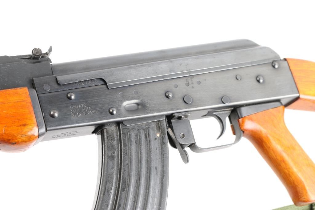 Pre-Ban Chinese semiautomatic rifle imported by Sile, NY NY. Based on AK-47/AKM type rifle. Features blued finish, smooth chu wood furniture with orange color varnish, 16" threaded barrel, slant muzzle brake, bayonet lug, cleaning rod, protected post adjustable front sight, tangent rear sight, manual safety, cleaning kit in butt trap. Bore is excellent condition, hard chrome lined. Retains 95% blue with handling marks, a few tiny spots of patina. Wood is very good condition, with scratches and dings. Observed numbers match. Includes one 30 rd magazine, green canvas web sling (Chinese, leather tabs on both ends, appears to be an SKS sling).