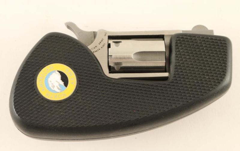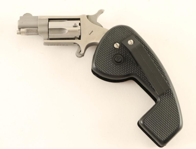Miniature stainless steel spur trigger revolver chambered in .22 Long Rifle. Features a brushed/matte finish, 1.1" barrel with solid rib, blade front sight, fluted five-shot cylinder with safety notches, serrated spur trigger, serrated hammer spur, and a factory black plastic folding grip with pocket clip. Revolver exhibits light handling wear and some bright rub marks from folding into the grip. Action is sound, bore is good and grip is fine. Condition is NRA very good. ***Modern Firearm***