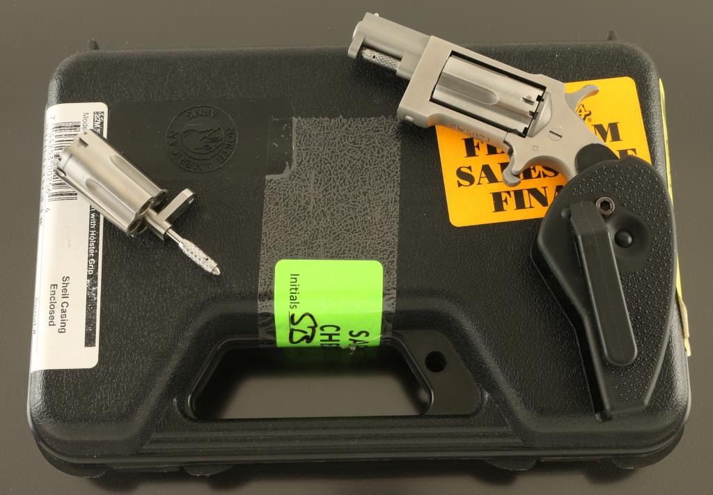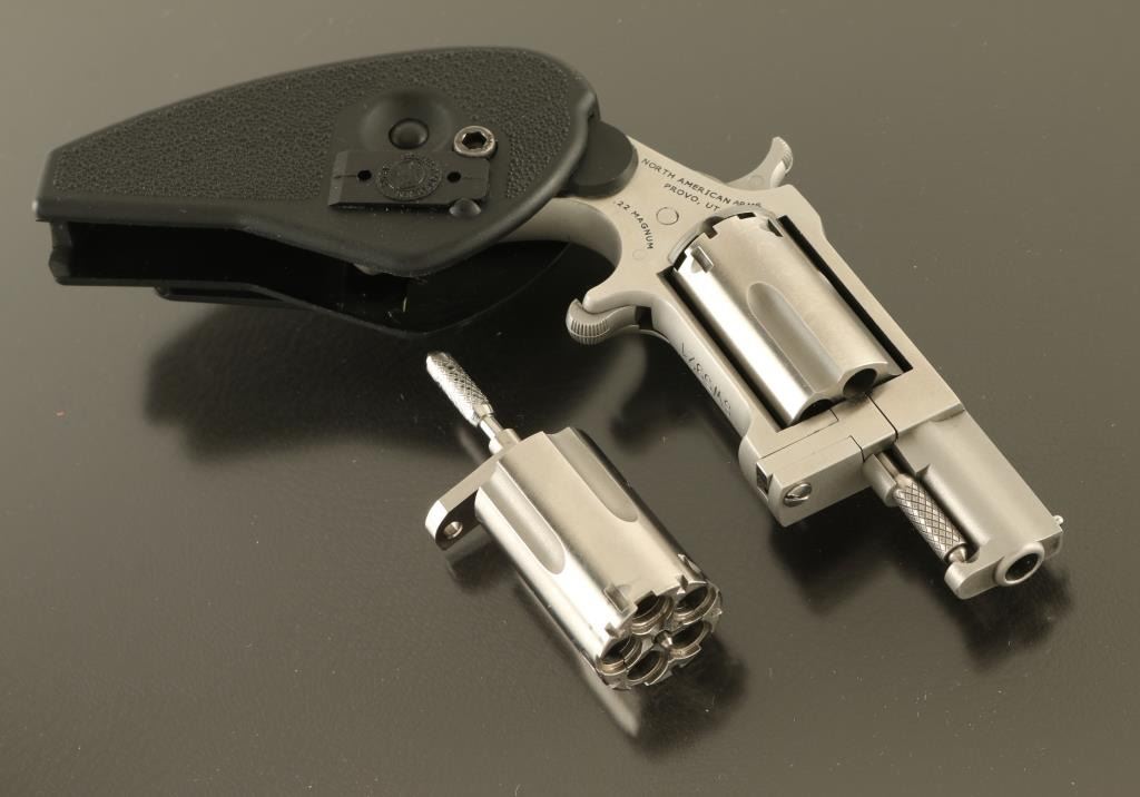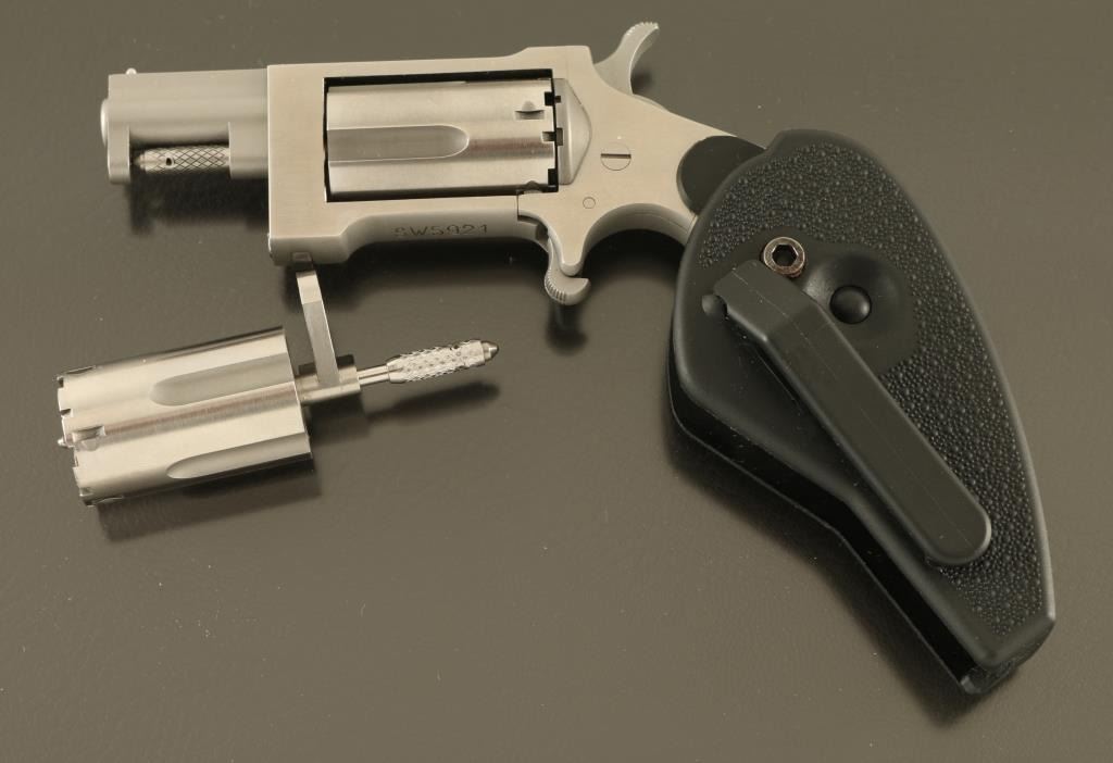 SN: SW5921 Single action mini revolver features stainless steel construction, black polymer grip panels, hinged grip extension that folds to cover the spur trigger and serve as a belt clip, 5 shot side opening cylinder, 1-3/8" barrel, fixed sights. Cylinder assembly can be removed to swap between 22 Mag (installed) and 22LR (included) cylinders. Overall condition is like new, in factory hard case with manual. Condition is Excellent - Like New *** Modern Firearm ***