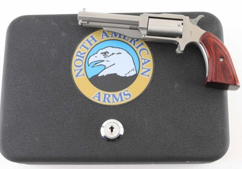 Miniature stainless steel single action revolver chambered in .22 Magnum, stylized after the 1860 Remington. Features a brushed & matte finish, 4" octagonal barrel, pinched post front sight, notched rear sight, non-fluted five shot cylinder, serrated hammer spur, faux loading lever, serrated spur trigger and two piece smooth rosewood grips. Revolver shows little to no wear. Action is smooth, bore is good and wood grips are excellent. Comes with hard metal locking case, keys and owners manual and cardboard box. NRA Excellent Modern Firearm