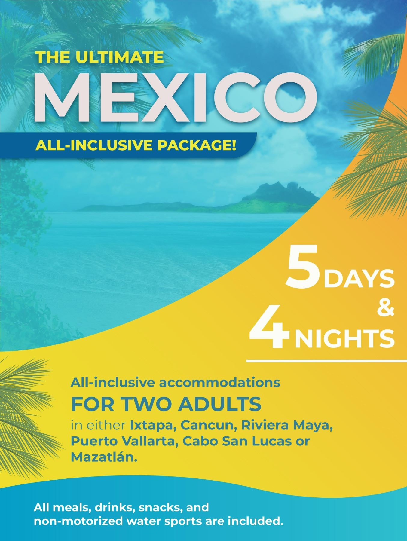 5 days and 4 nights all-inclusive accommodations for two adults in either Ixtapa, Cancun, Riviera Maya, Puerto Vallarta, Cabo San Lucas or Mazatlán.