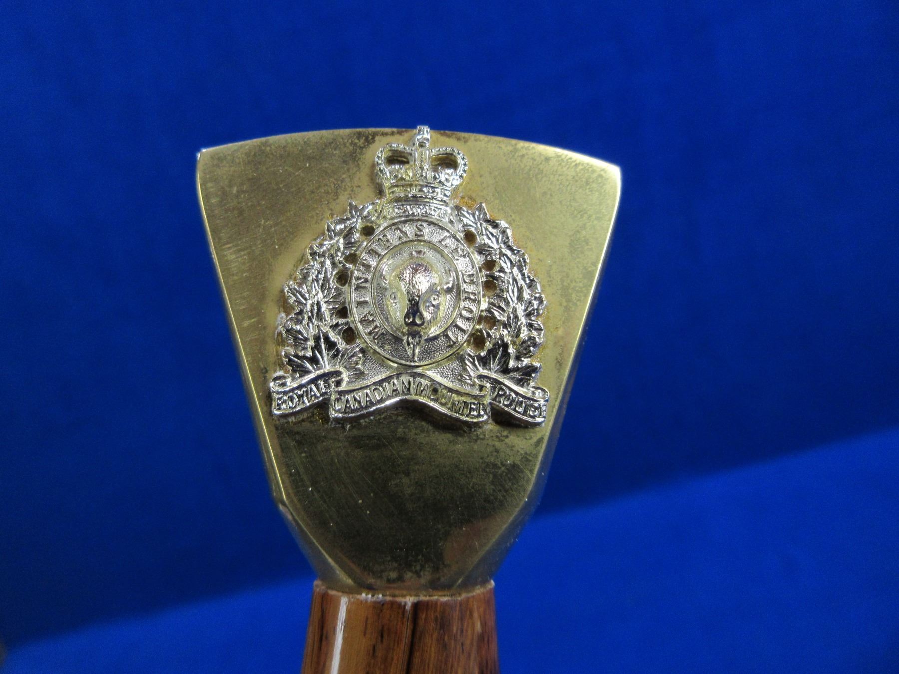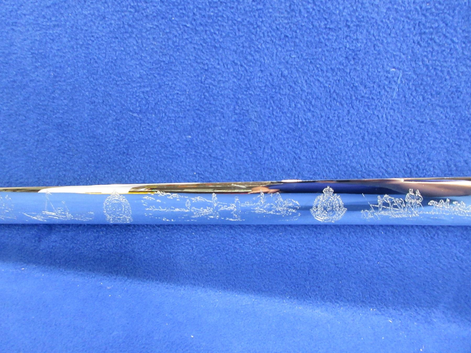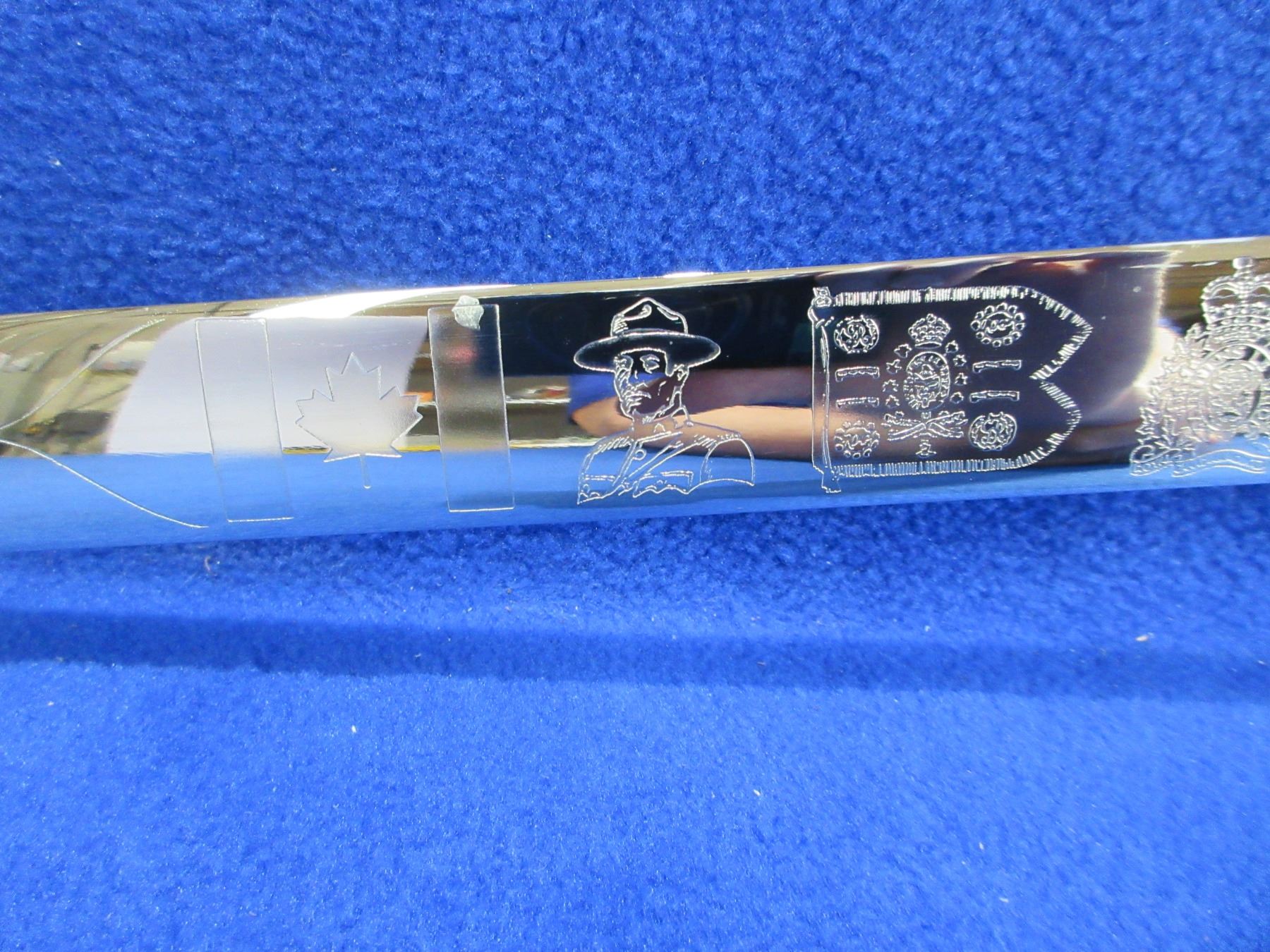 North West Mounted Police Presentation Sword by Wilkinson Sword - This sword was produced to commemorate the centennial of its creation in 1973. Produced by Wilkinson of London, the attractive and weighty keepsake features a beautifully etched blade with 18 carat gold-plated guard, pommel and quillons. Finished with a solid rosewood handle and engraved images including the march west of the original recruits, along with the four historical RCMP crests. Blade is 34", overall length 43 1/4". Ser #C0743